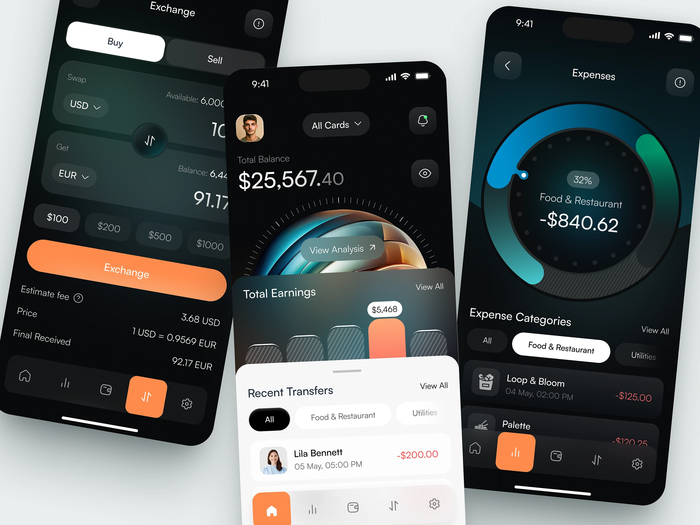 This mobile interface is designed for a modern finance app that seamlessly combines currency exchange, balance analytics, and expense tracking in one intuitive experience. The dark, neon-inspired aesthetic with soft gradients and glowing accents gives the UI a premium look, while the thoughtful UX design and layout ensure ease of use for both beginners and advanced users. From instant currency swaps to visualized spending categories, each screen empowers users to manage their finances with clarity and confidence. This product shines with its polished mobile design, intuitive mobile UI, and sleek iOS app design.