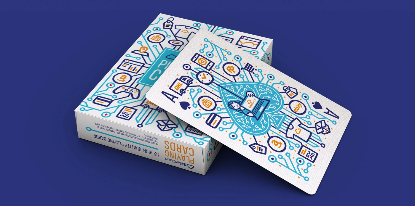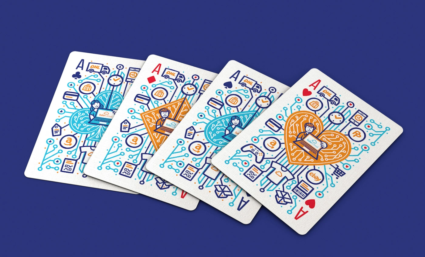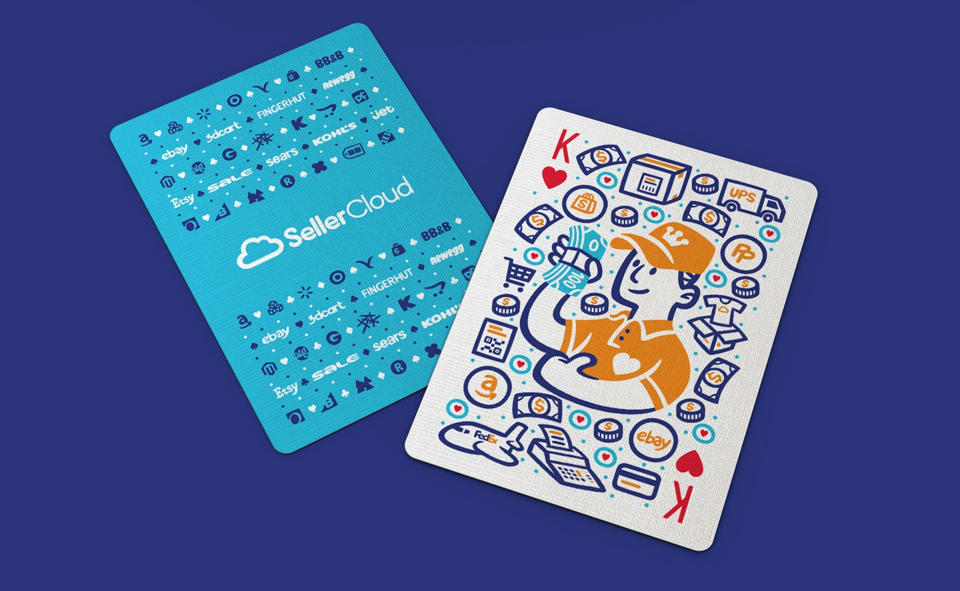 They commissioned me to design a promotional deck of playing cards. A full deck customized with designs related to their services. The illustrations should depict shipping orders, channel integrations, reports, inventory management, warehousing, product catalogues, etc.