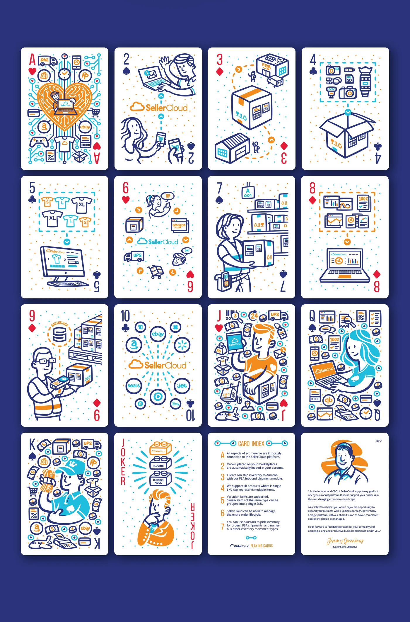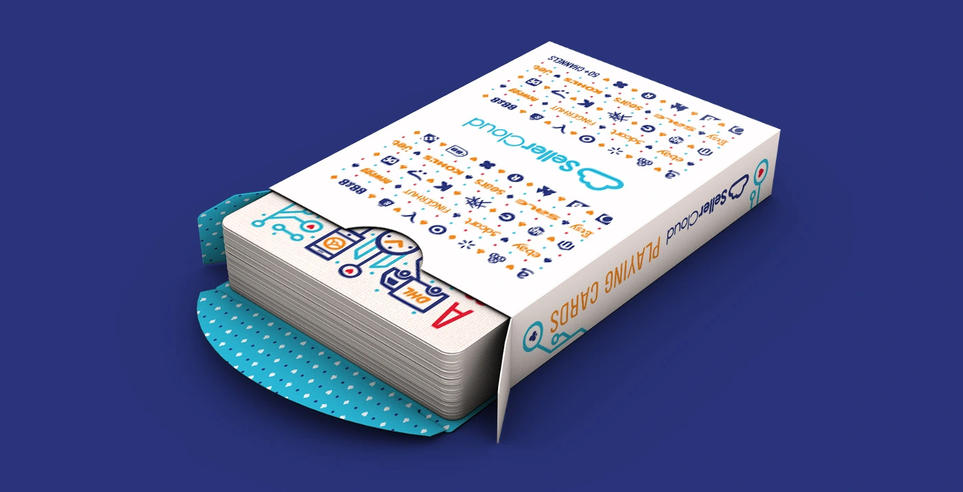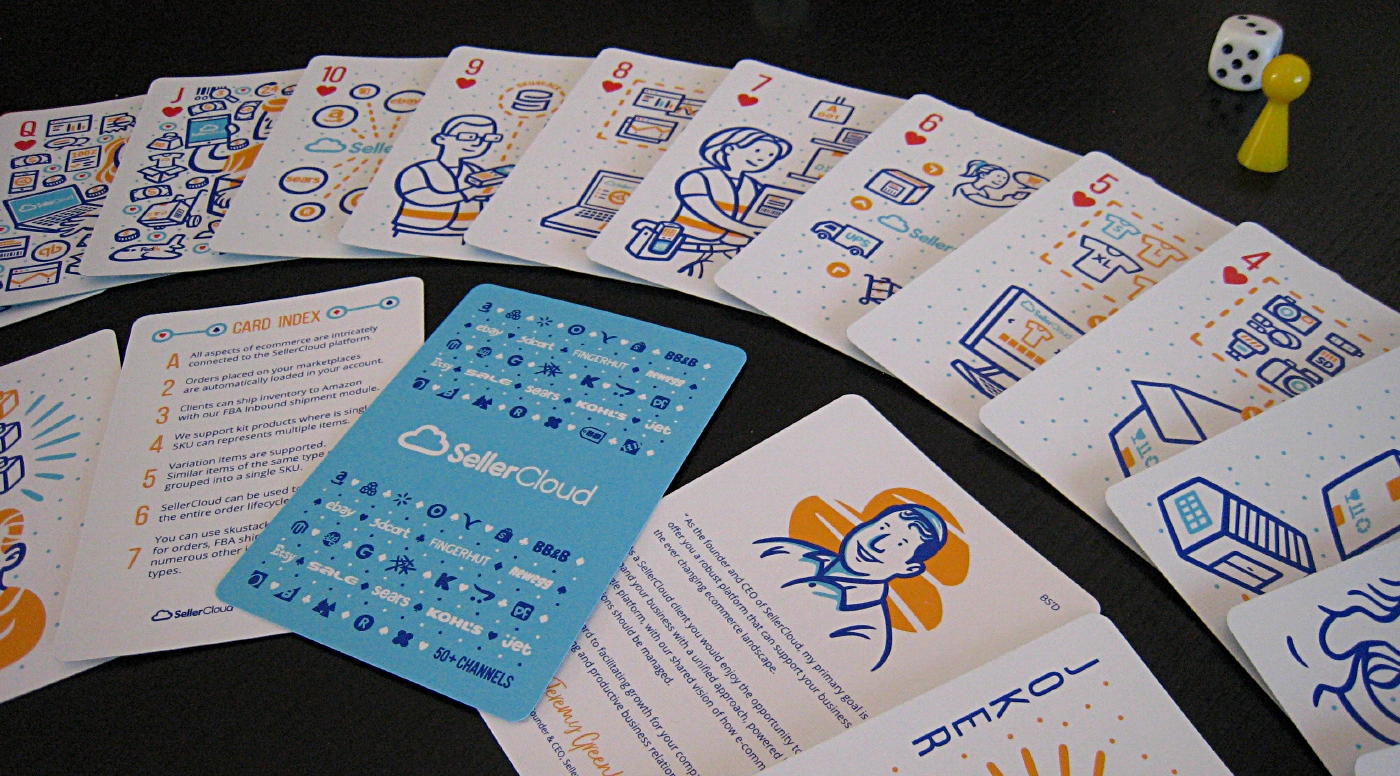 They commissioned me to design a promotional deck of playing cards. A full deck customized with designs related to their services. The illustrations should depict shipping orders, channel integrations, reports, inventory management, warehousing, product catalogues, etc.