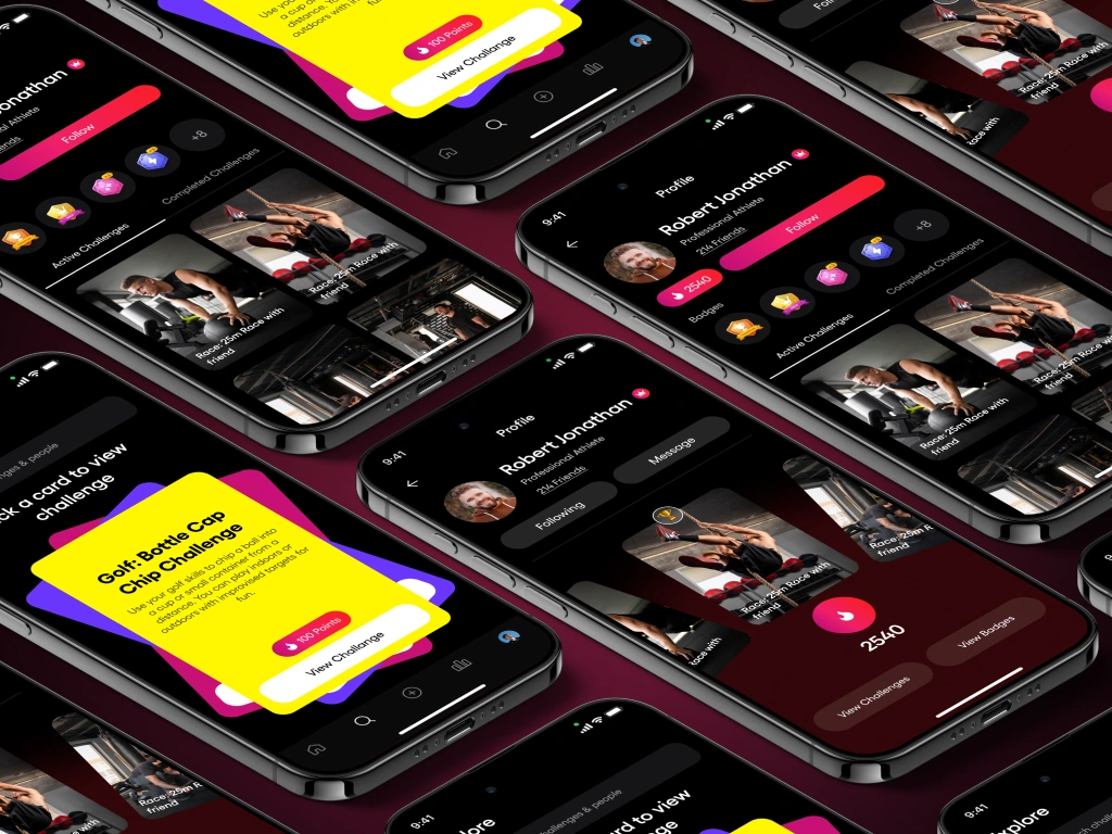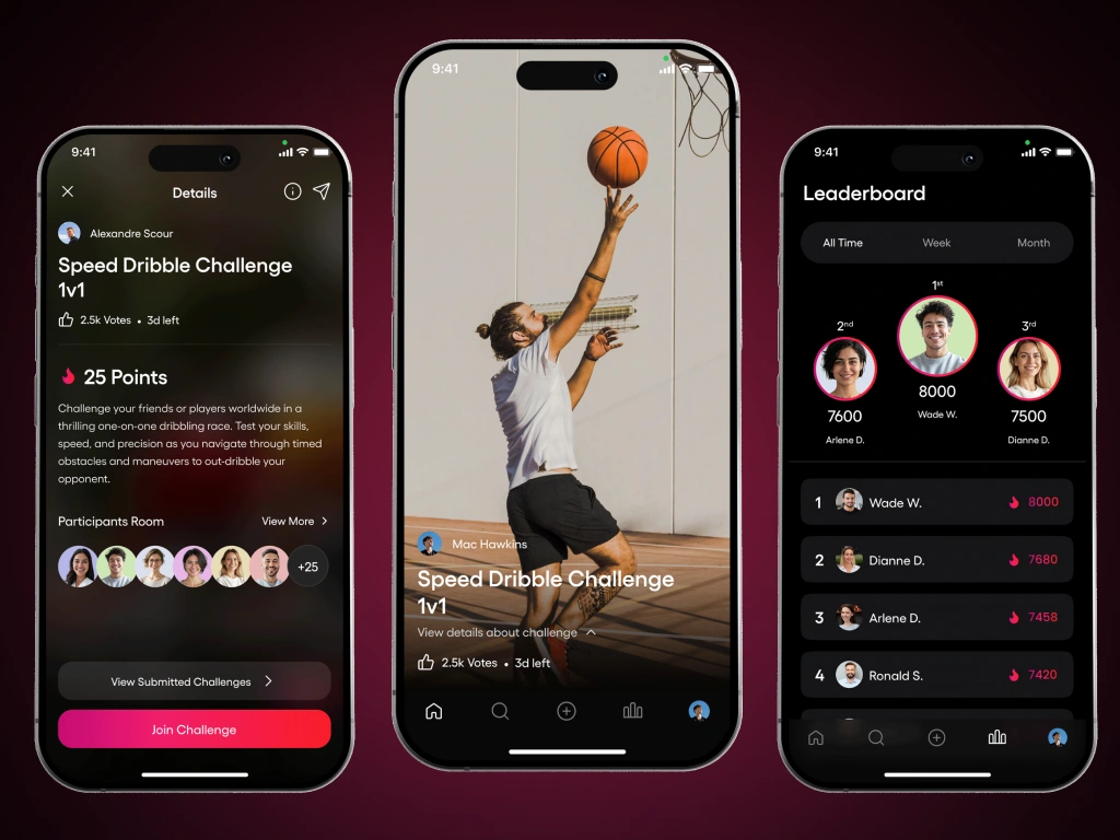 A modern and engaging mobile app design for a video-based challenge platform where users participate, share, and vote on creative challenges.