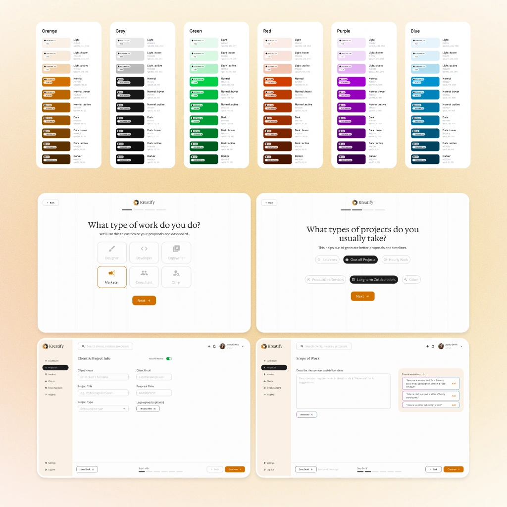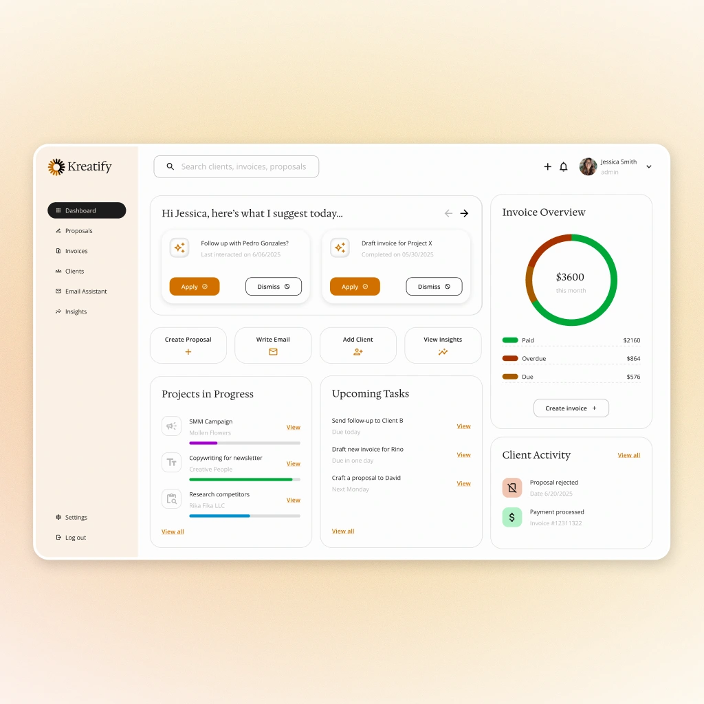 The goal: reduce time spent on admin (invoices, proposals, follow-ups). I focused on clean UX, intuitive onboarding, and modular UI components that scale.