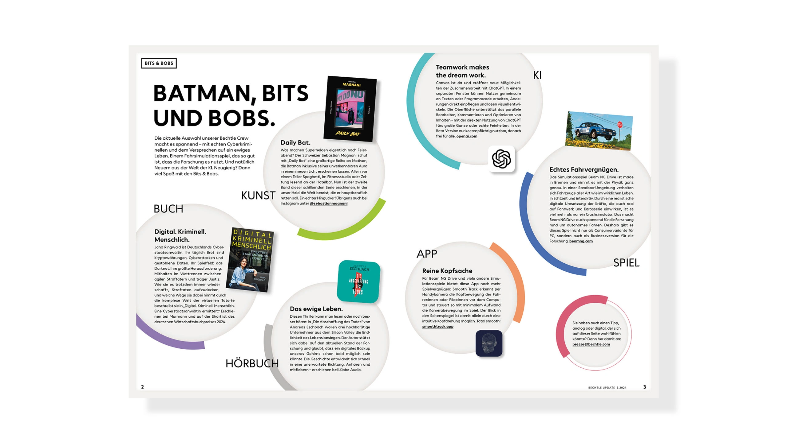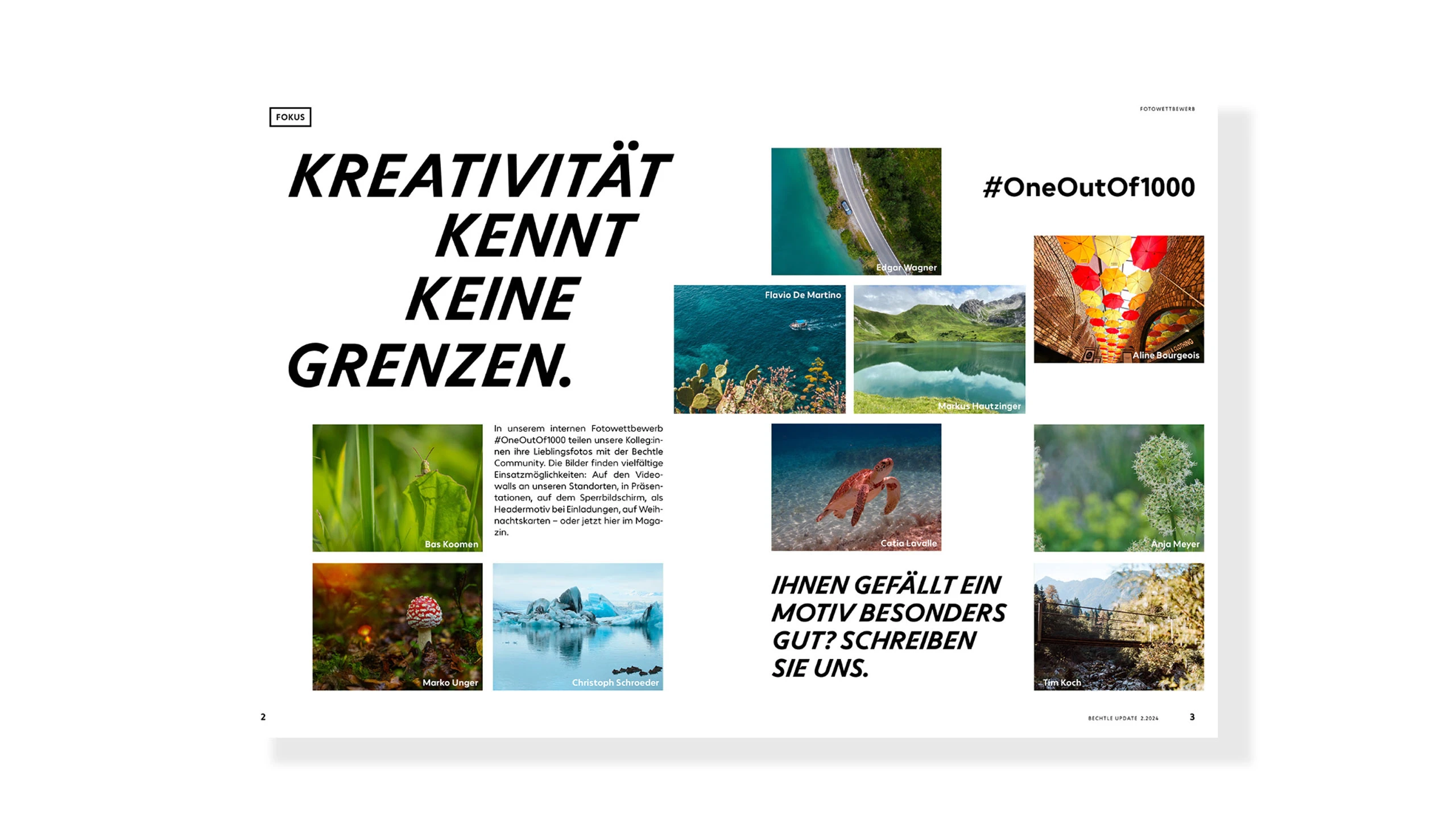 This edition of Bechtle Update combined two editorial features: Bits & Bobs and the photo competition #OneOutOf1000. Bits & Bobs curated a vibrant mix of culture, technology, and entertainment, unified through strong typography, circular frames, and dynamic colour accents. #OneOutOf1000 highlighted skilled photographers with bold headlines and a clean photographic grid, designed for use across print touchpoints. My role in the project was to create iterations of the design layout for which were then refined but the rest of the team. This project was created during my visual communication internship, where I learnt how to collaborate in a team setting while also learning critical design skills for the corporate and creative worlds.