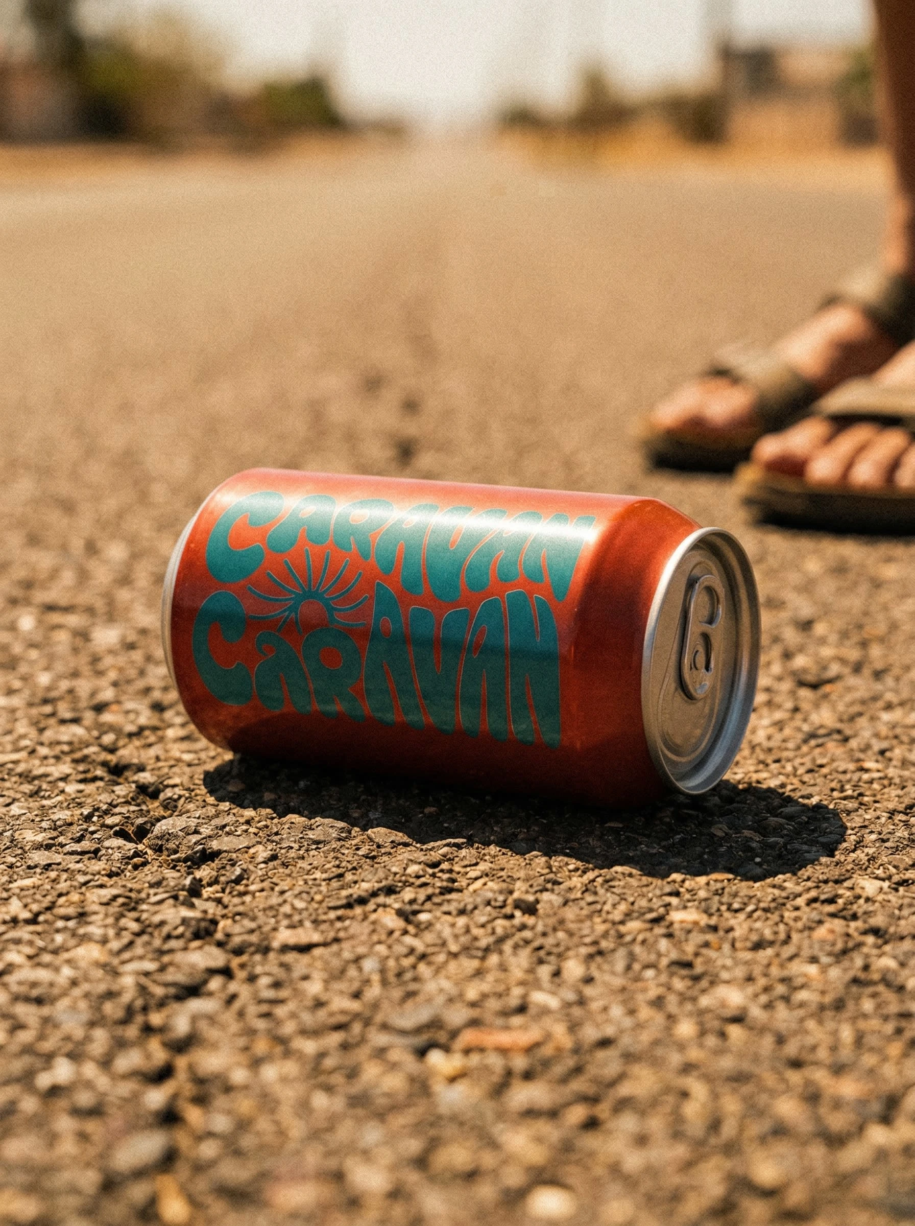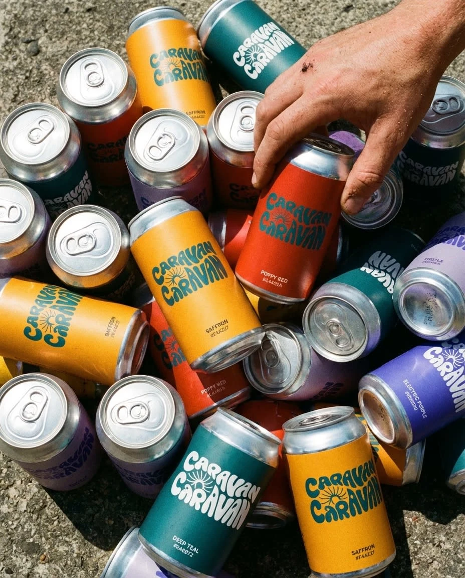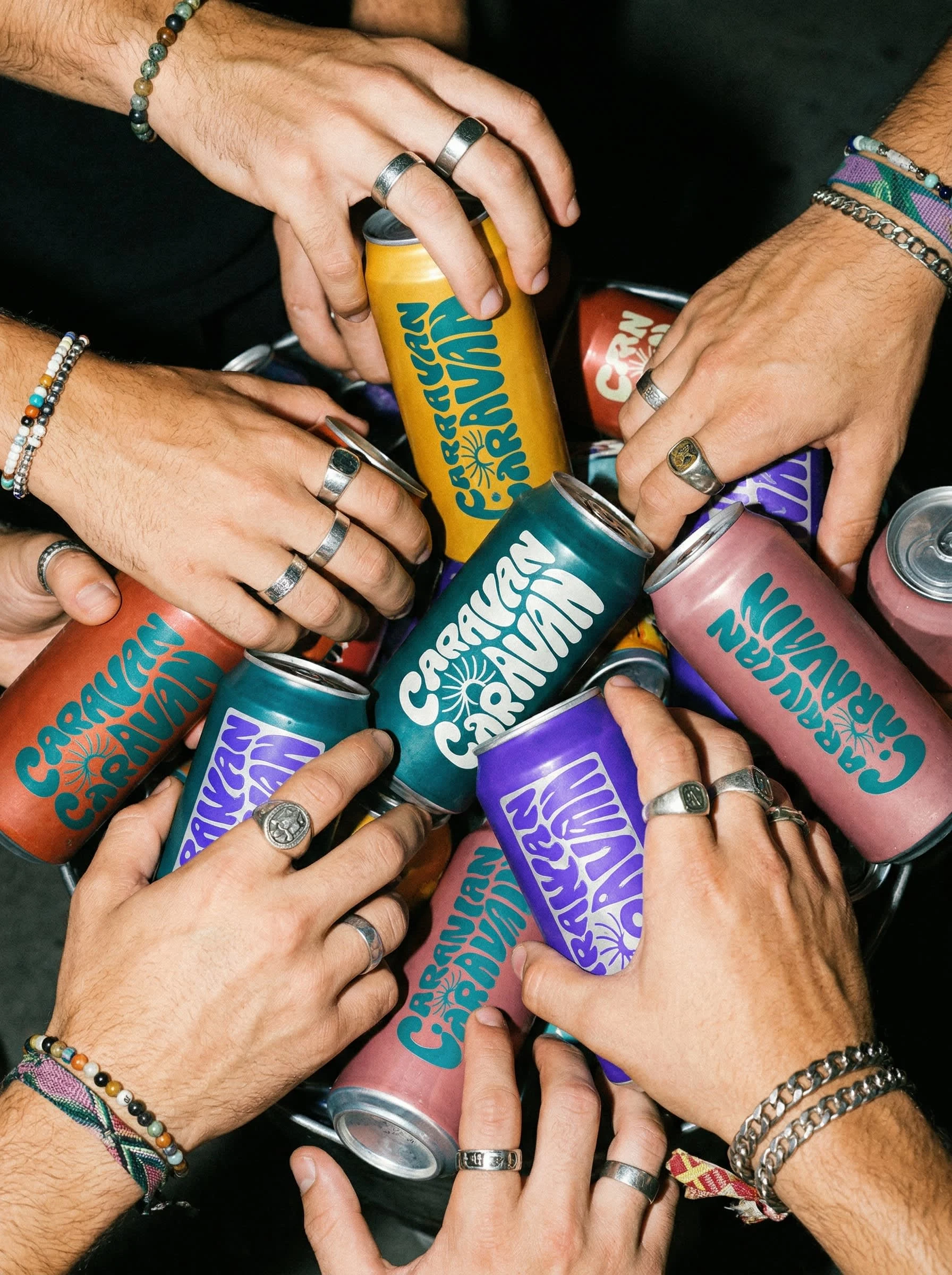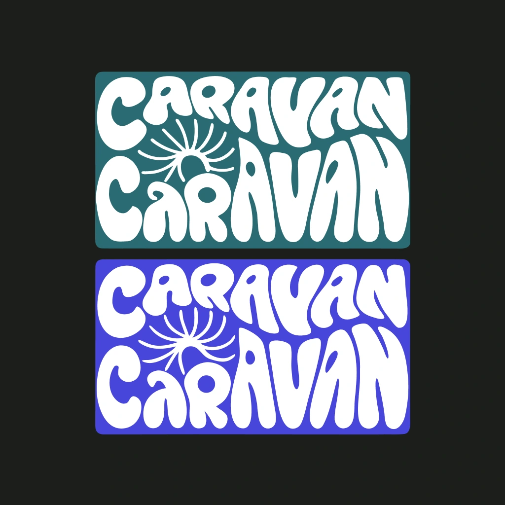 The wordmark is a single mark in two colorway versions — teal and purple — both equally primary, used interchangeably across the range. The lettering is wavy, bubbly, stacked double: CARAVAN over CARAVAN, with a sunburst flower sitting in the negative space between the two words. It is unambiguously 1970s in spirit — bold, warm, slightly psychedelic — but executed with enough confidence and simplicity to feel completely contemporary. The rounded rectangle lock-up gives it a stamp quality: something you'd find on a market stall, a festival wristband, a label on a bottle someone made themselves.