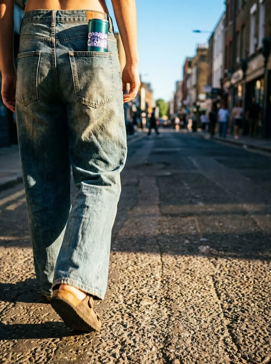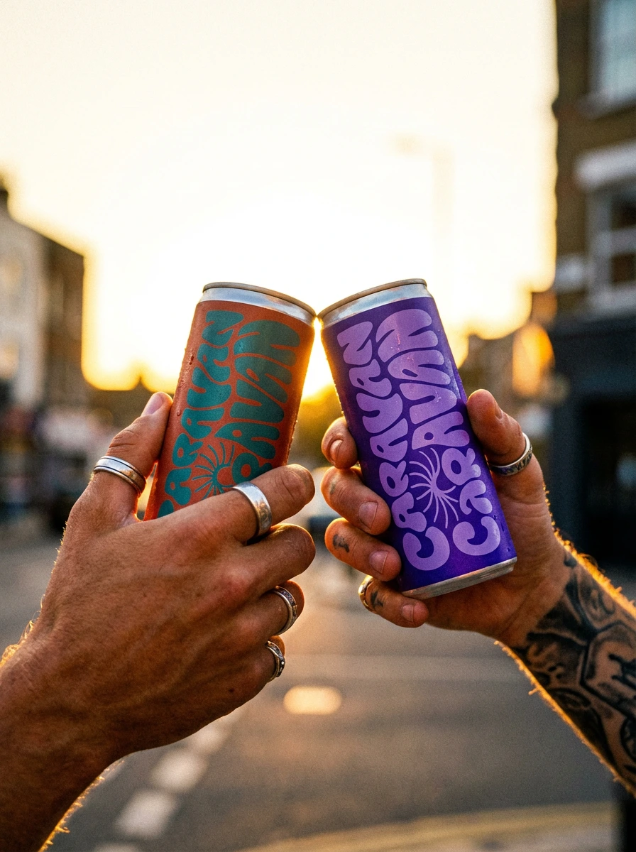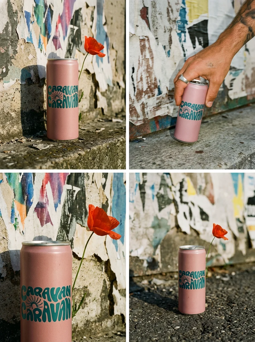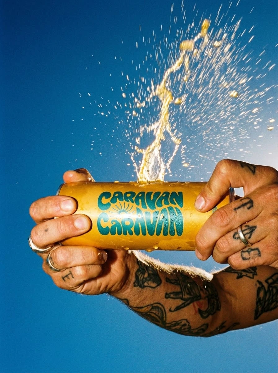 The wordmark is a single mark in two colorway versions — teal and purple — both equally primary, used interchangeably across the range. The lettering is wavy, bubbly, stacked double: CARAVAN over CARAVAN, with a sunburst flower sitting in the negative space between the two words. It is unambiguously 1970s in spirit — bold, warm, slightly psychedelic — but executed with enough confidence and simplicity to feel completely contemporary. The rounded rectangle lock-up gives it a stamp quality: something you'd find on a market stall, a festival wristband, a label on a bottle someone made themselves.