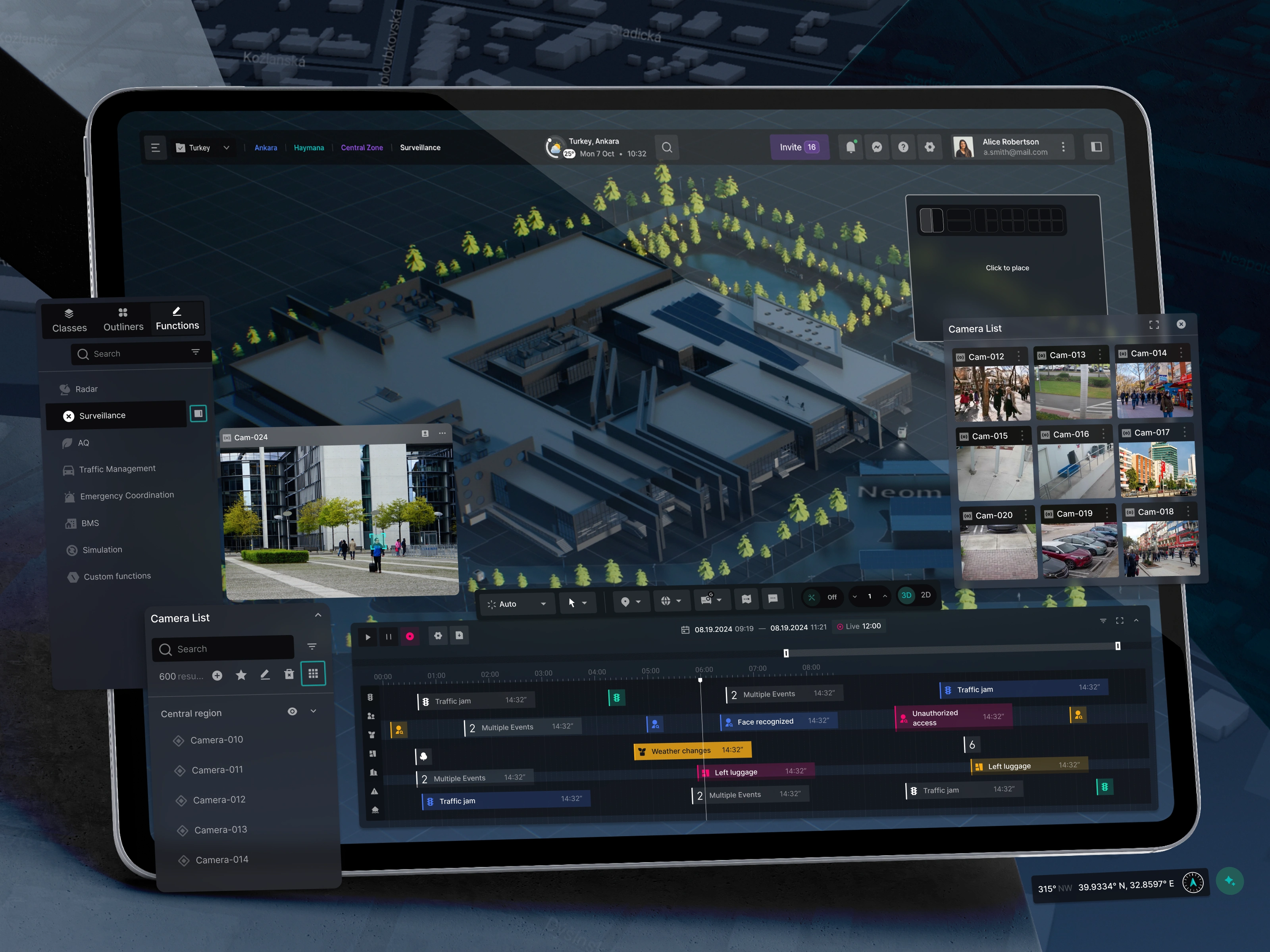 exwalt.com. It brings together live camera feeds and a dynamic timeline that logs every event. When our face recognition system identifies a person, the event is flagged on the timeline and details are displayed directly in the surveillance window. This streamlined approach empowers security teams and city planners to respond quickly, ensuring a safer, smarter urban environment.