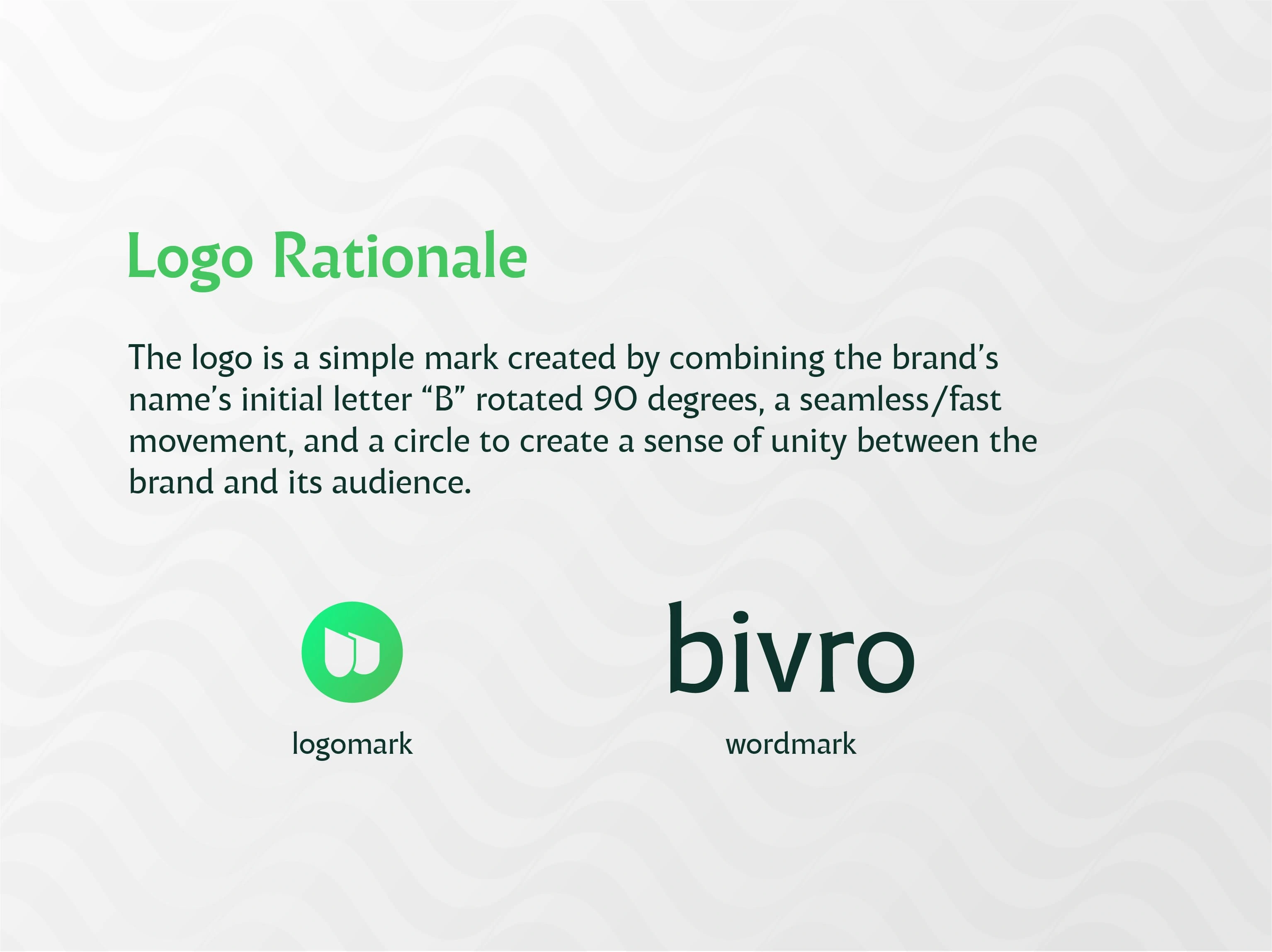 The logomark combines a rotated “B” with directional flow and a circle, creating a dynamic symbol that represents speed, connection, and unity. The mark visualizes the concept of seamless movement, tying directly into Bivro’s core promise of smooth financial operations.
