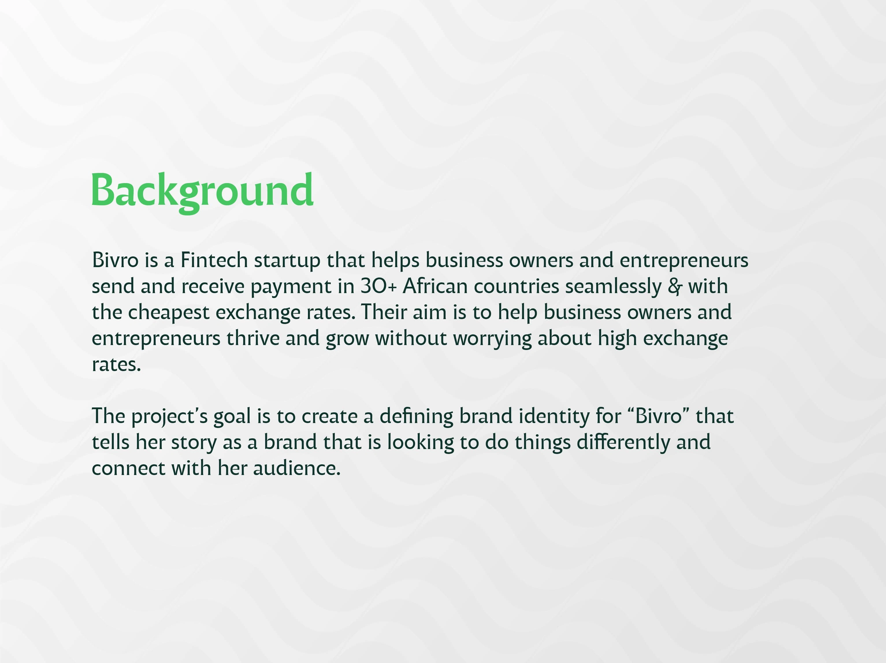 To develop a compelling brand identity for Bivro, a fintech startup offering seamless cross-border payments across Africa. The goal was to design an identity that felt fresh, digital, and empowering, appealing to growth-focused entrepreneurs while communicating trust in a highly regulated and competitive industry.