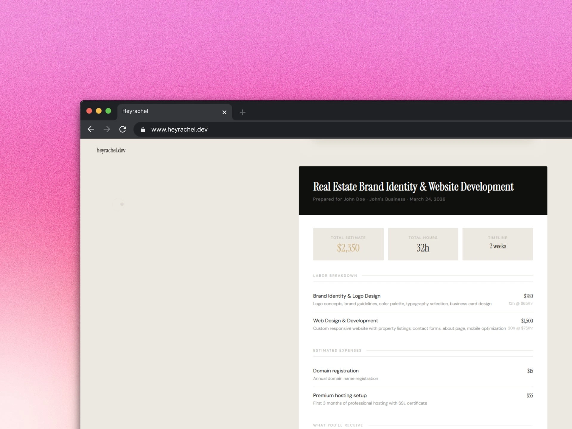 Claude API generates a fully itemized quote — labor breakdown, hours, expenses, timeline, and Rachel's personal take on the project. Built solo/