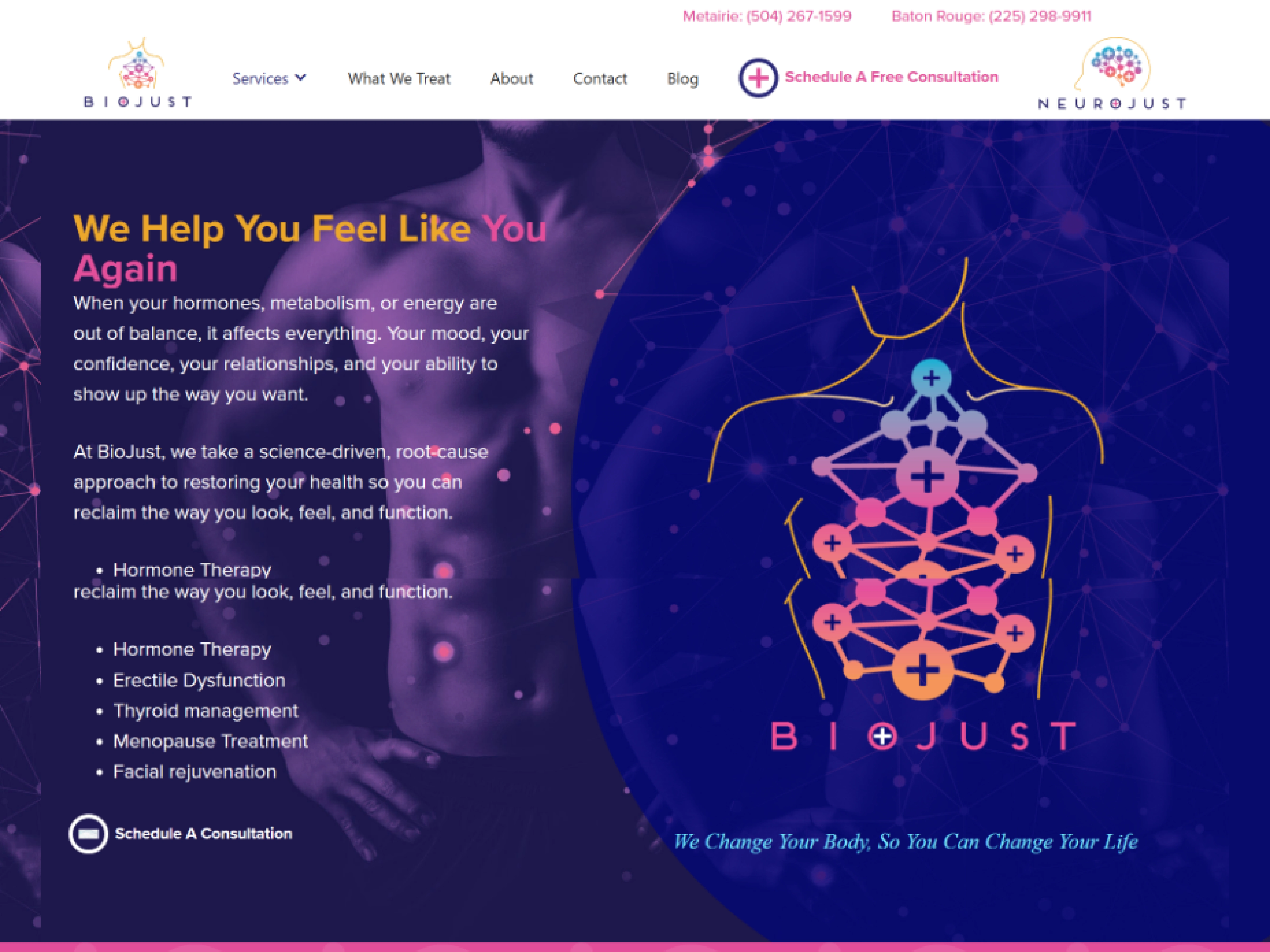 BioJust is a precision medicine clinic specializing in hormone optimization therapy for men and women across two Louisiana locations (Metairie and Baton Rouge). The practice focuses on root-cause treatments for hormone imbalances, erectile dysfunction, thyroid management, menopause, and facial rejuvenation - helping patients reclaim their health, confidence, and quality of life.