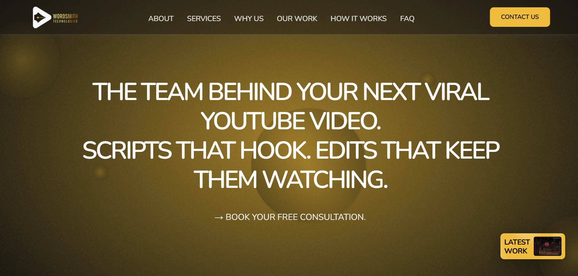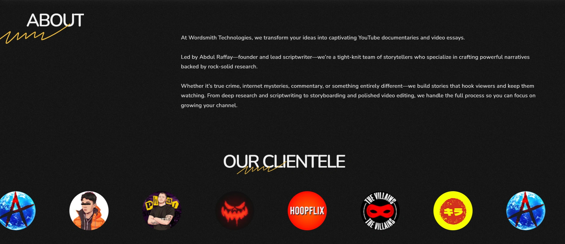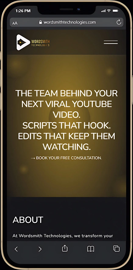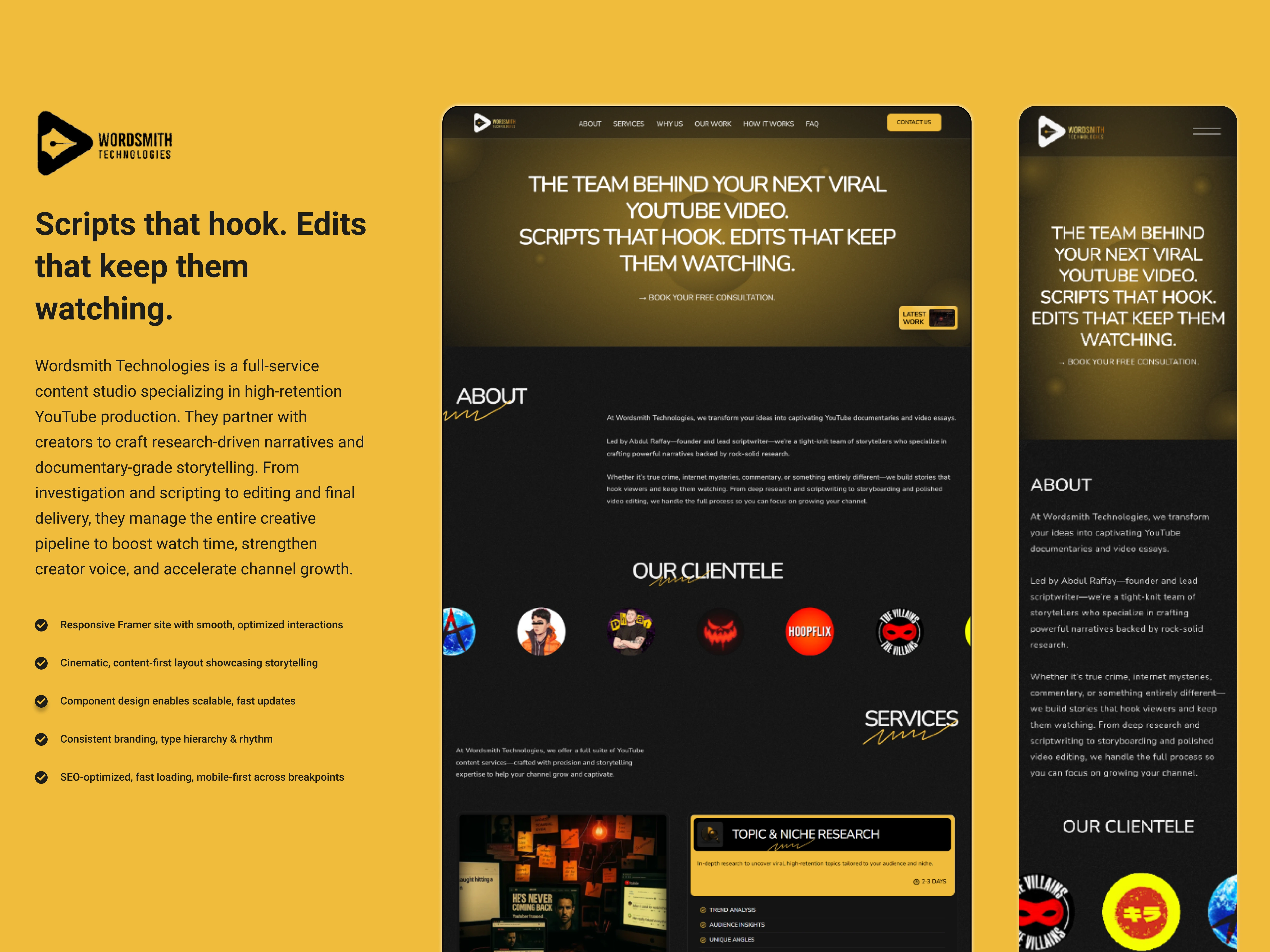 I designed and built a modern, responsive website for Wordsmith Technologies, a creative agency specializing in YouTube scriptwriting and video editing. The goal was to create a clean, credible online presence with clear service communication and strong mobile performance.