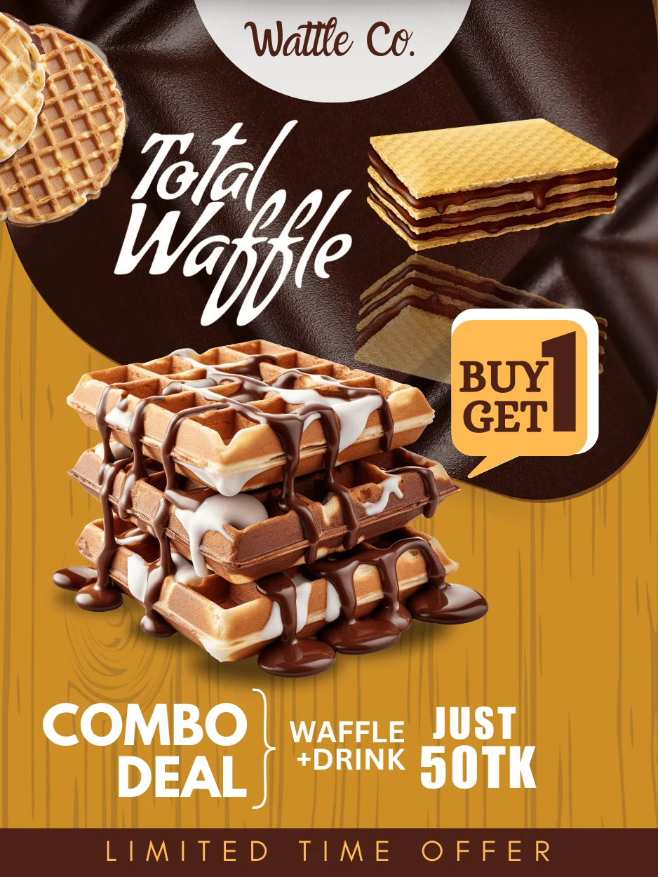 Designed a vibrant food promo banner for a waffle brand featuring a 'Buy 1 Get 1' offer, helping increase customer reach, engagement, and sales.
