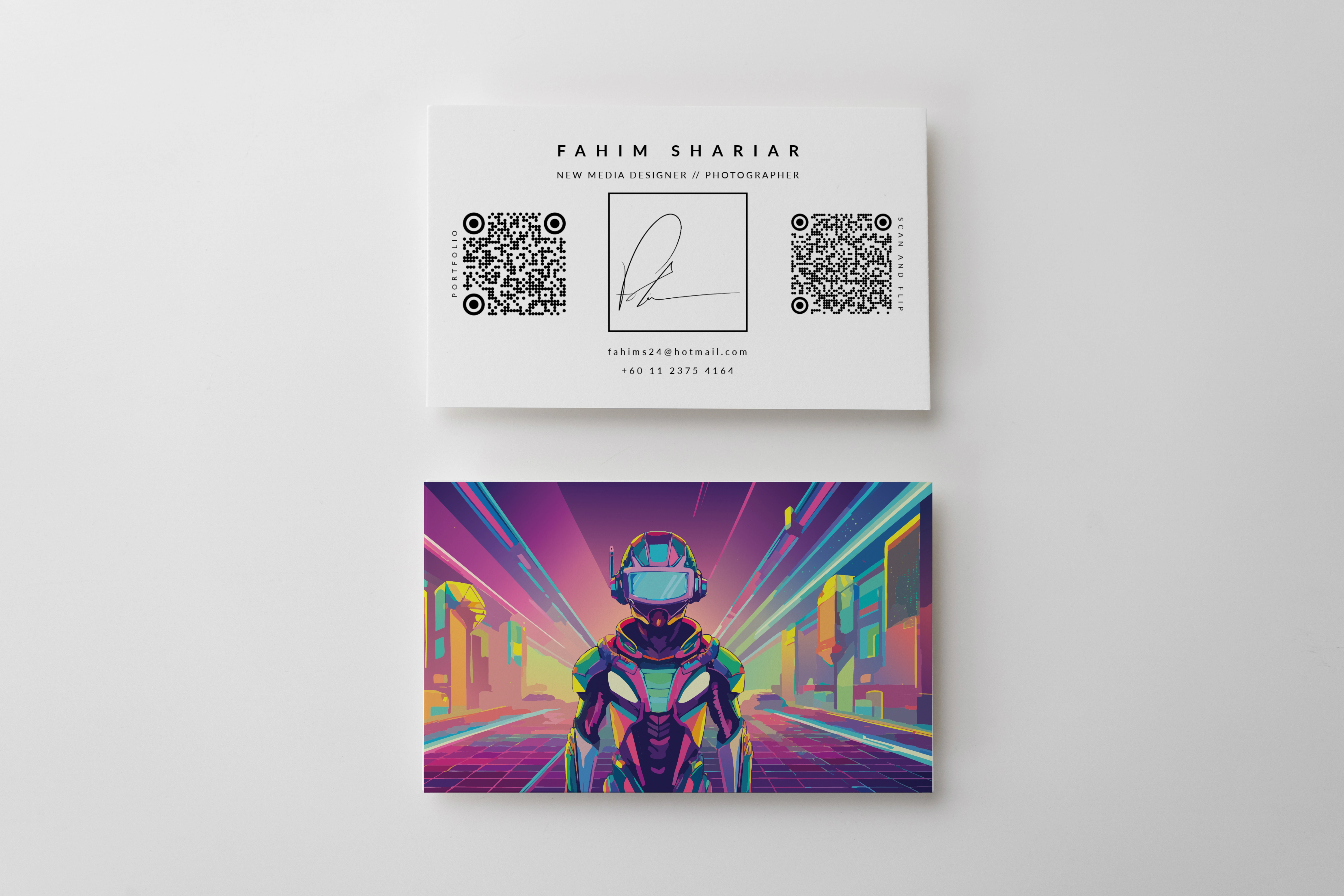 Ever wondered how to make your business card truly unique and captivating, ensuring that after passing it to someone, they wouldn’t simply forget about it in their wallet? A simple yet effective solution lies in integrating augmented reality (AR). With modern technology making this integration easier than ever, and with AR glasses poised to revolutionize how we exchange information, it’s likely to become a new norm in the near future. Here’s an example of my approach to creating an AR-triggered name card: the front remains clean and minimal, focusing on essential details and QR codes, while the back bursts with vibrant, futuristic artwork featuring my mascot—which doubles as an AR marker. Once scanned, it unlocks an immersive 3D experience showcasing my portfolio, a brief résumé, and interactive elements, perfectly blending the physical and digital worlds to leave a lasting impression.