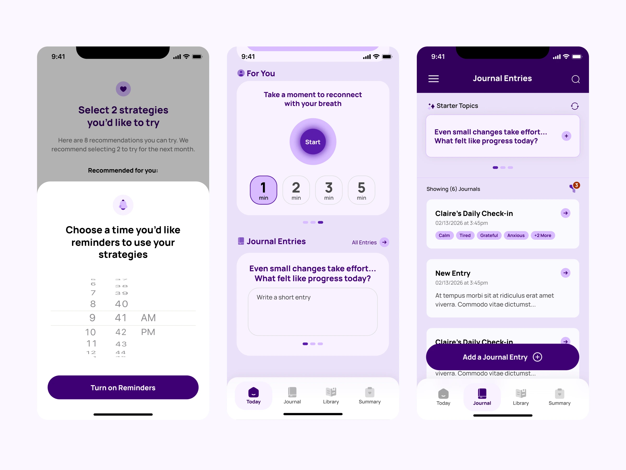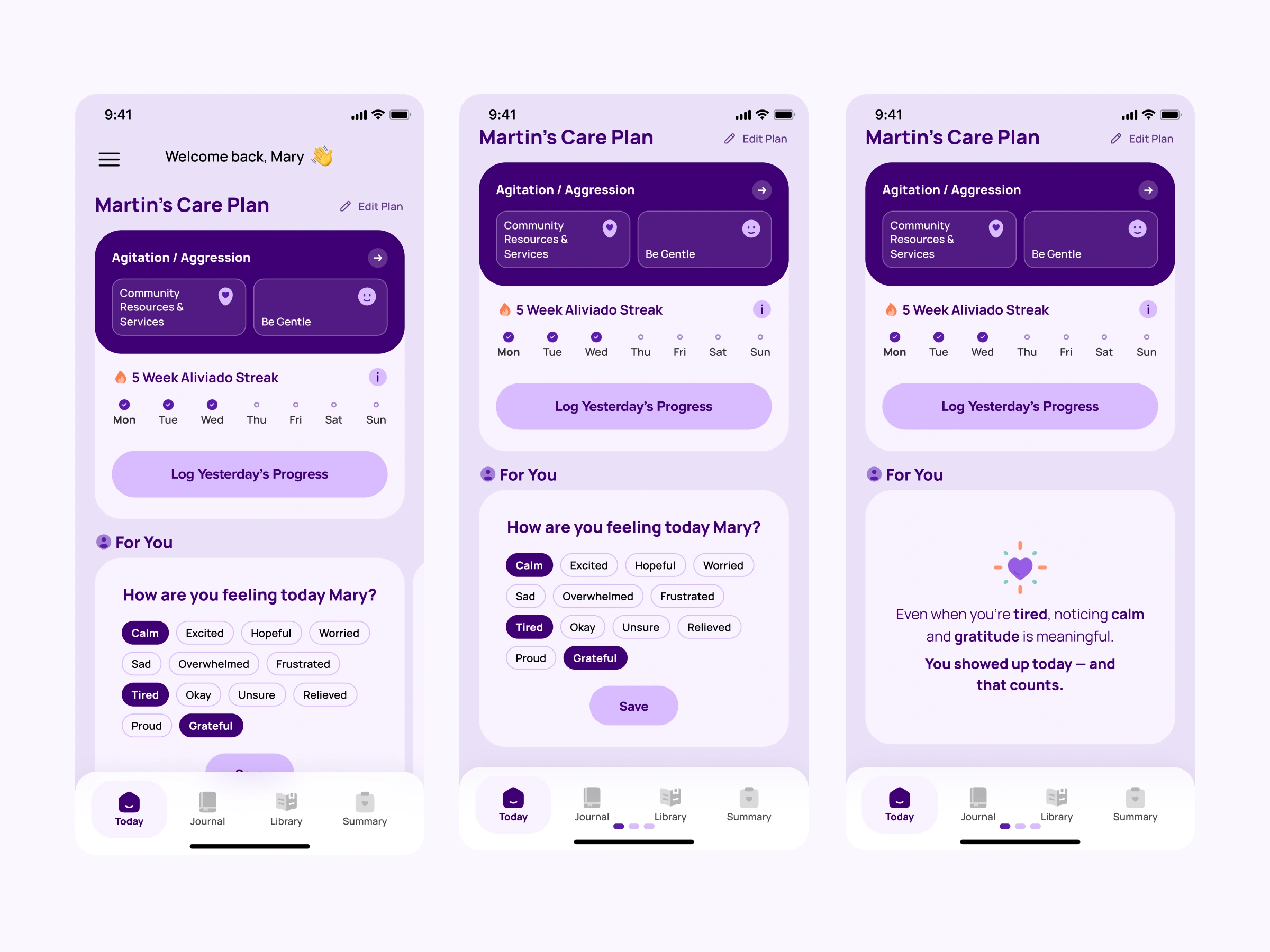 In addition to customizable notification reminders, we adding simple feature to help support the emotional wellbeing of caregivers with breath work exercises and journal prompts to encourage reflections and mindfulness.
