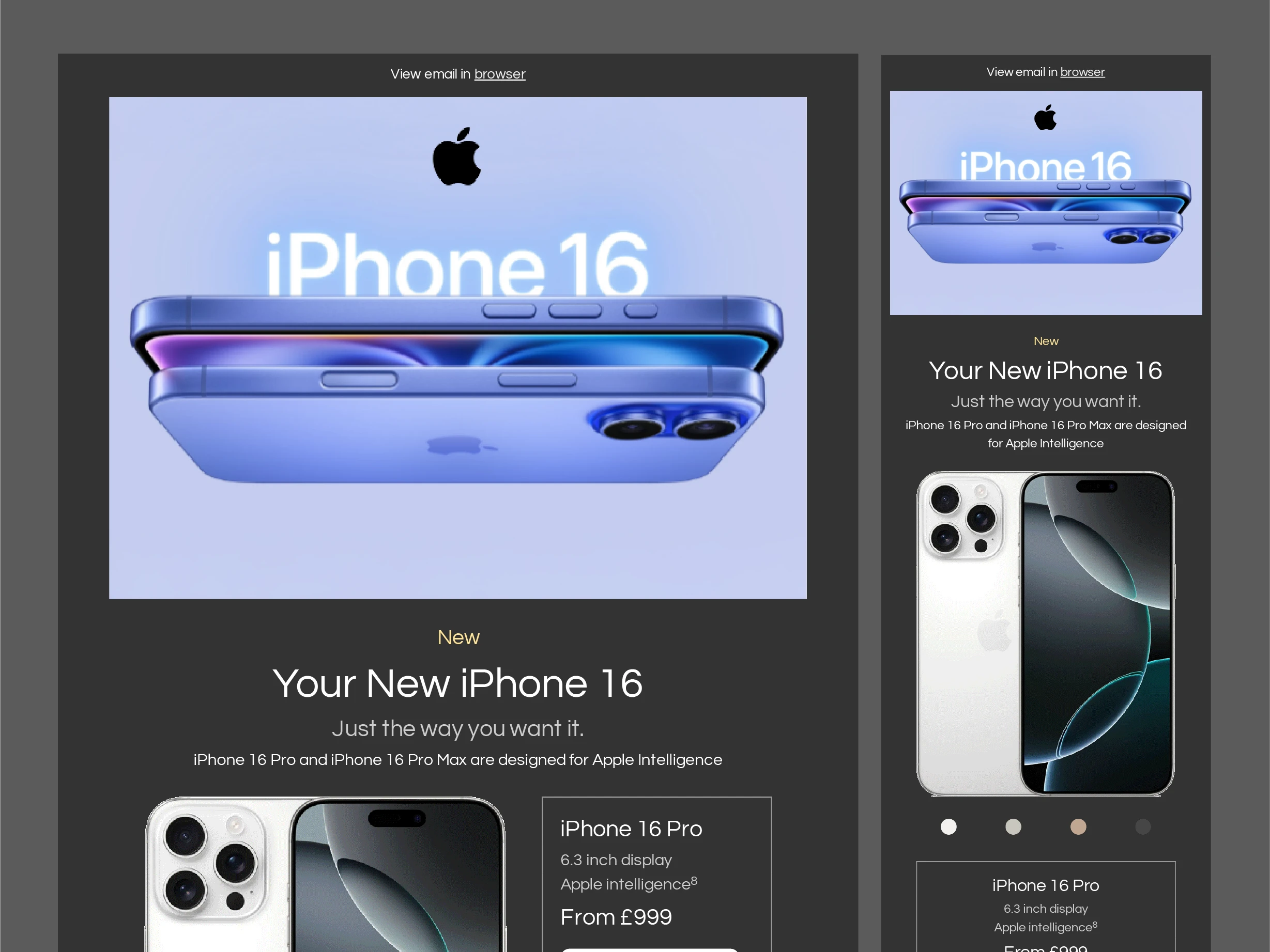 The iPhone 16 email design uses a sleek black-and-white theme, embodying the sophistication and innovation of the product. It prominently displays the product price in bold typography, ensuring clarity for potential buyers. A section titled "What's in the Box" gives users a clean visual of the accessories included with the iPhone, from the charging cable to the sleek packaging. The overall design exudes minimalism while emphasising the iPhone 16's premium quality, leading the recipient effortlessly toward the call-to-action button.