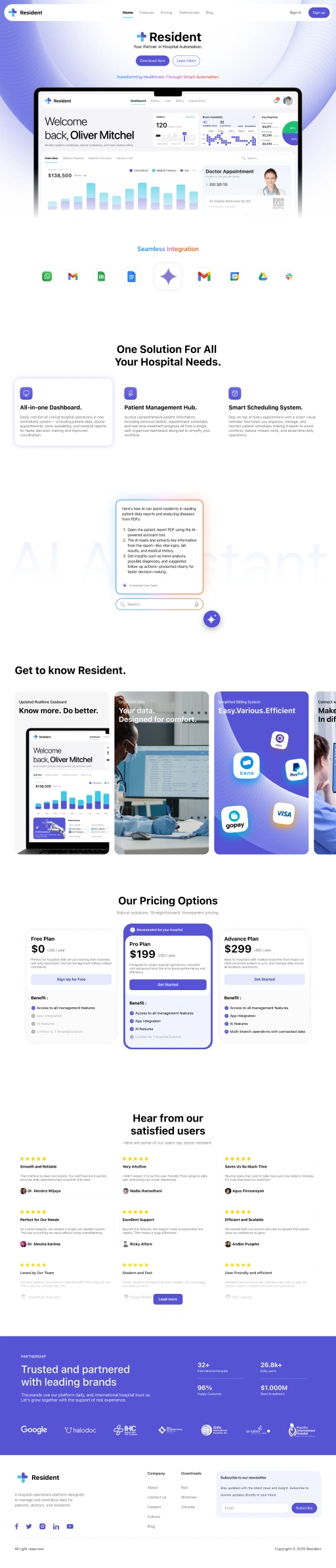Project Overview : Resident is a web landing page concept for a hospital management platform that helps hospitals automate administration, scheduling, and patient management. The page is structured to drive sign‑ups and demo requests with clear primary and secondary call‑to‑action buttons in the hero section.