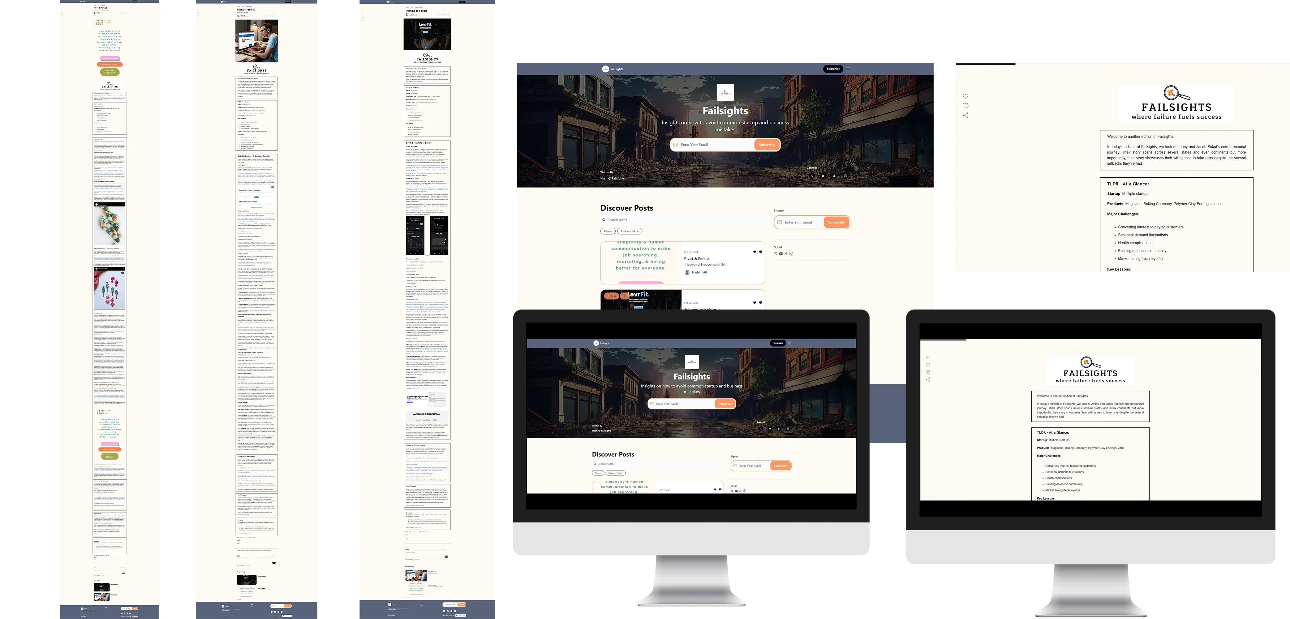 The FailSights Newsletter was built in 3 days using Beehiiv, with a focus on clean, minimalist design. The layout emphasized readability, with featured interviews and stories prominently displayed. The design also included a strong call-to-action for subscriptions and sharing.