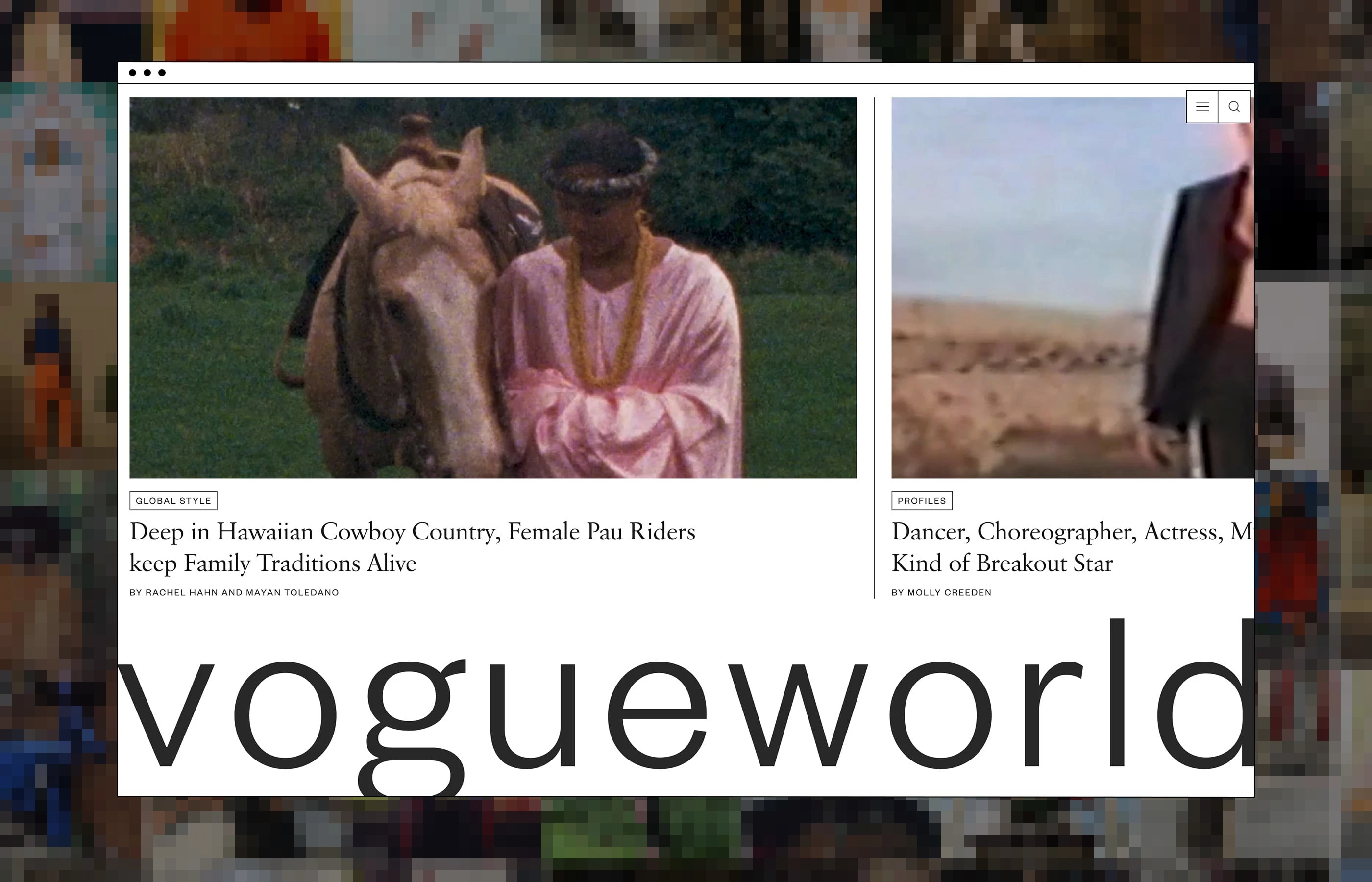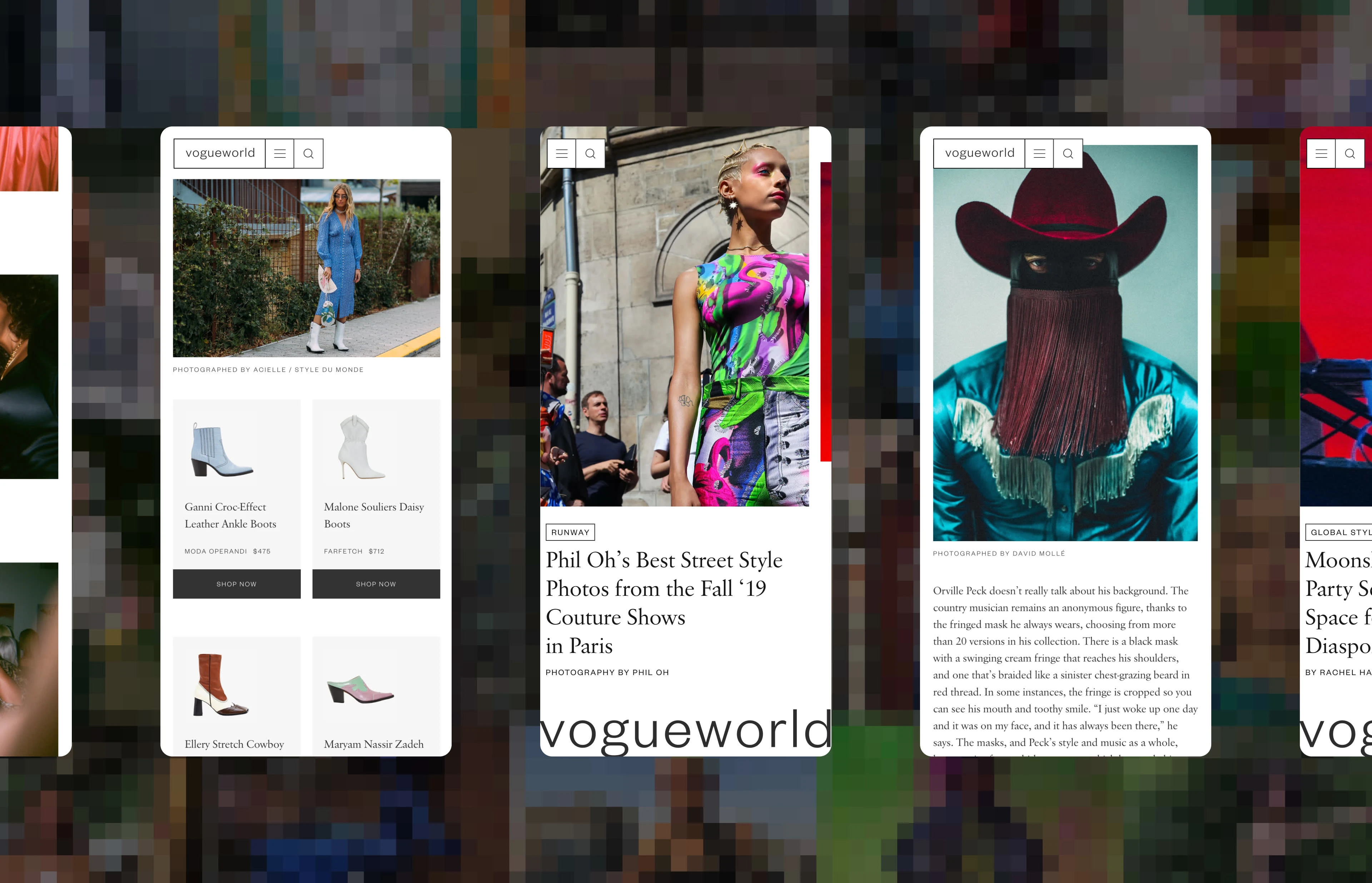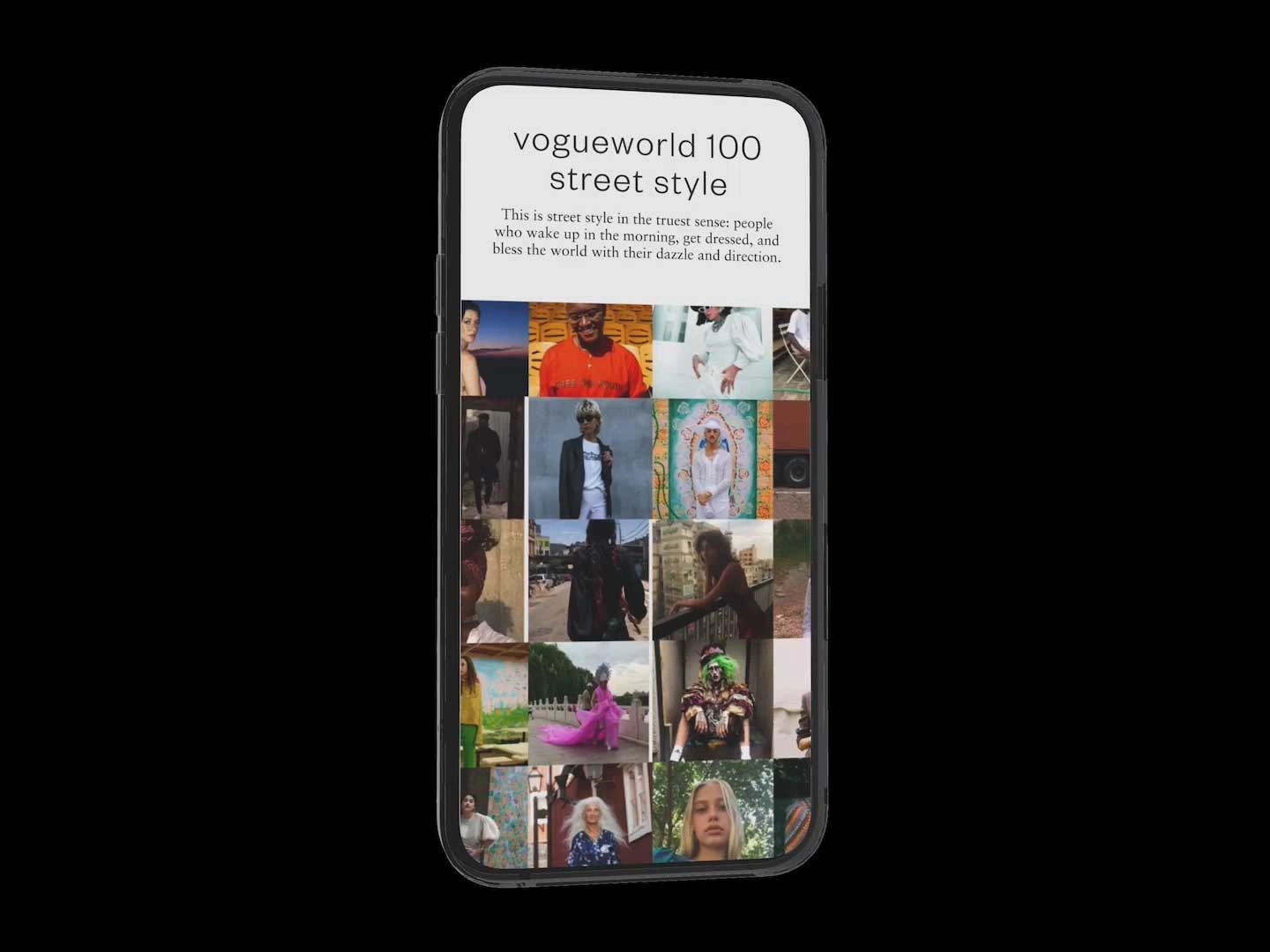 Led the digital product design (web, app) and brand ID for Vogueworld, Vogue's new street style vertical.