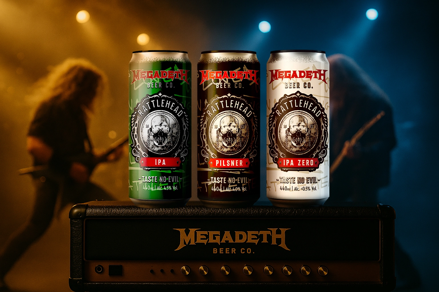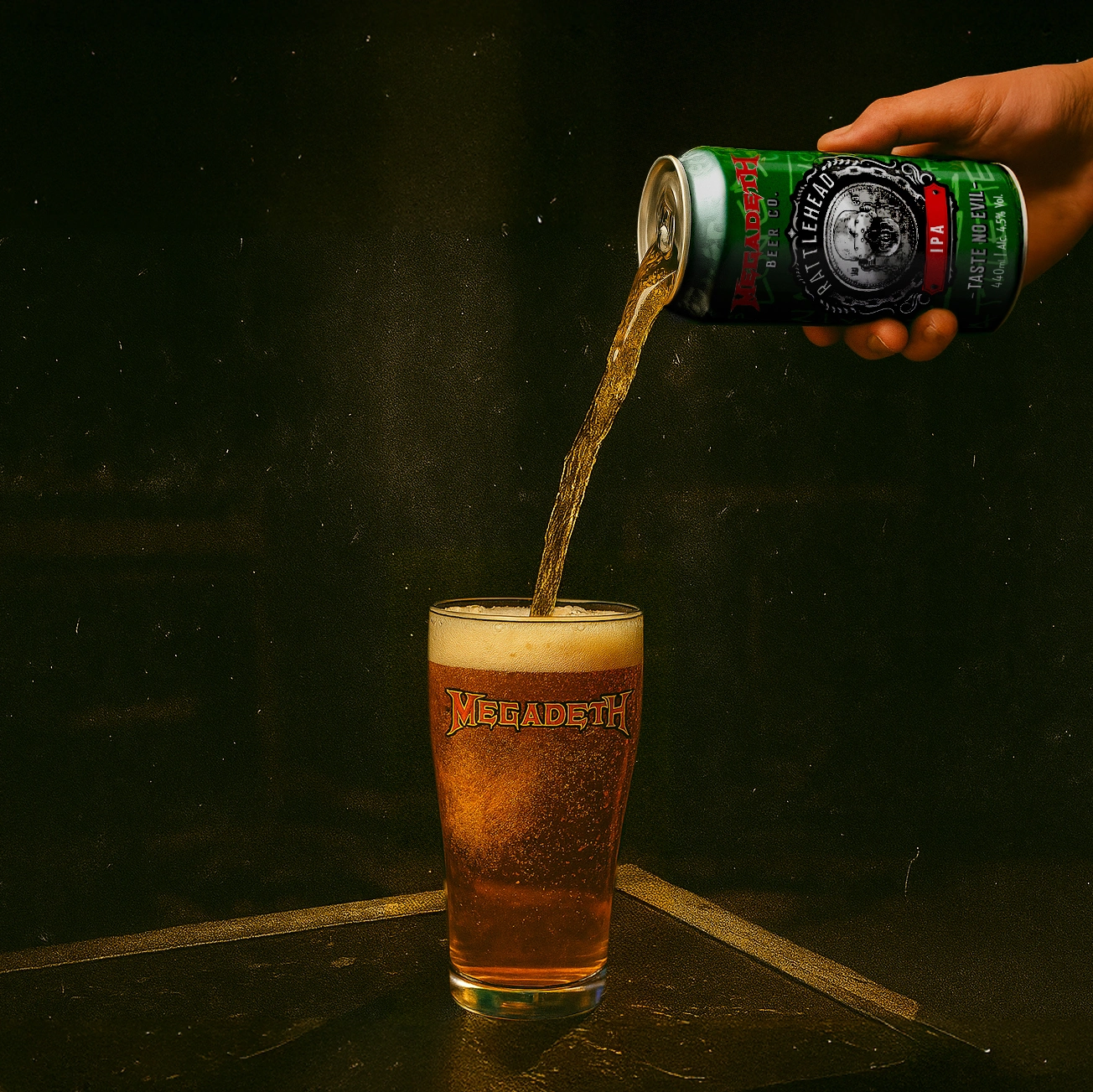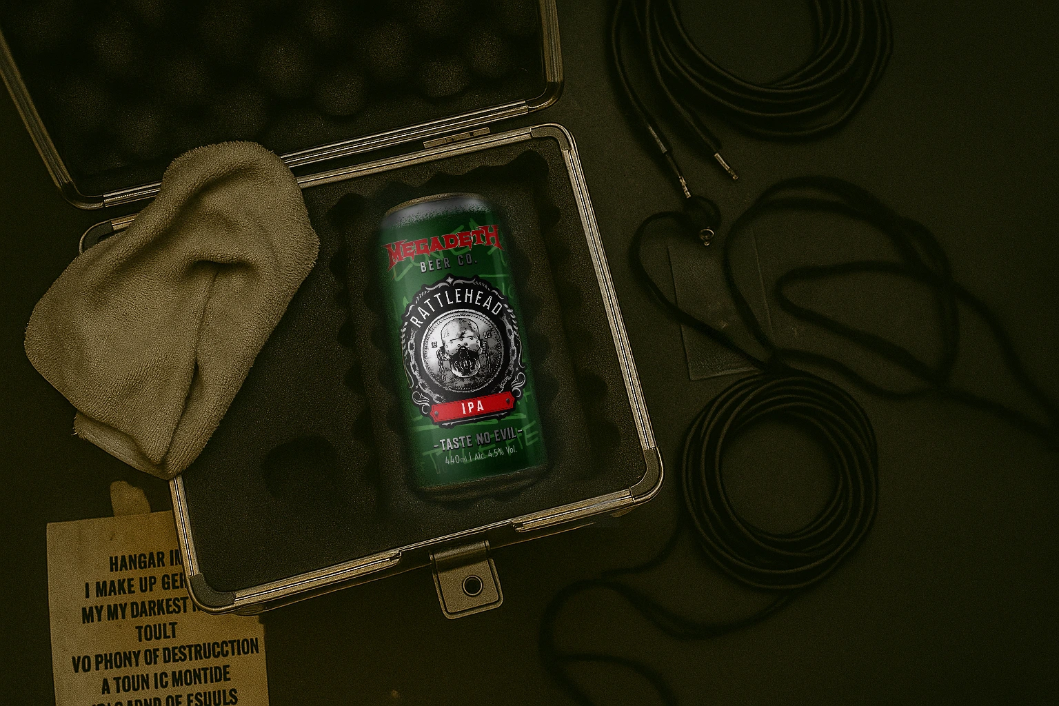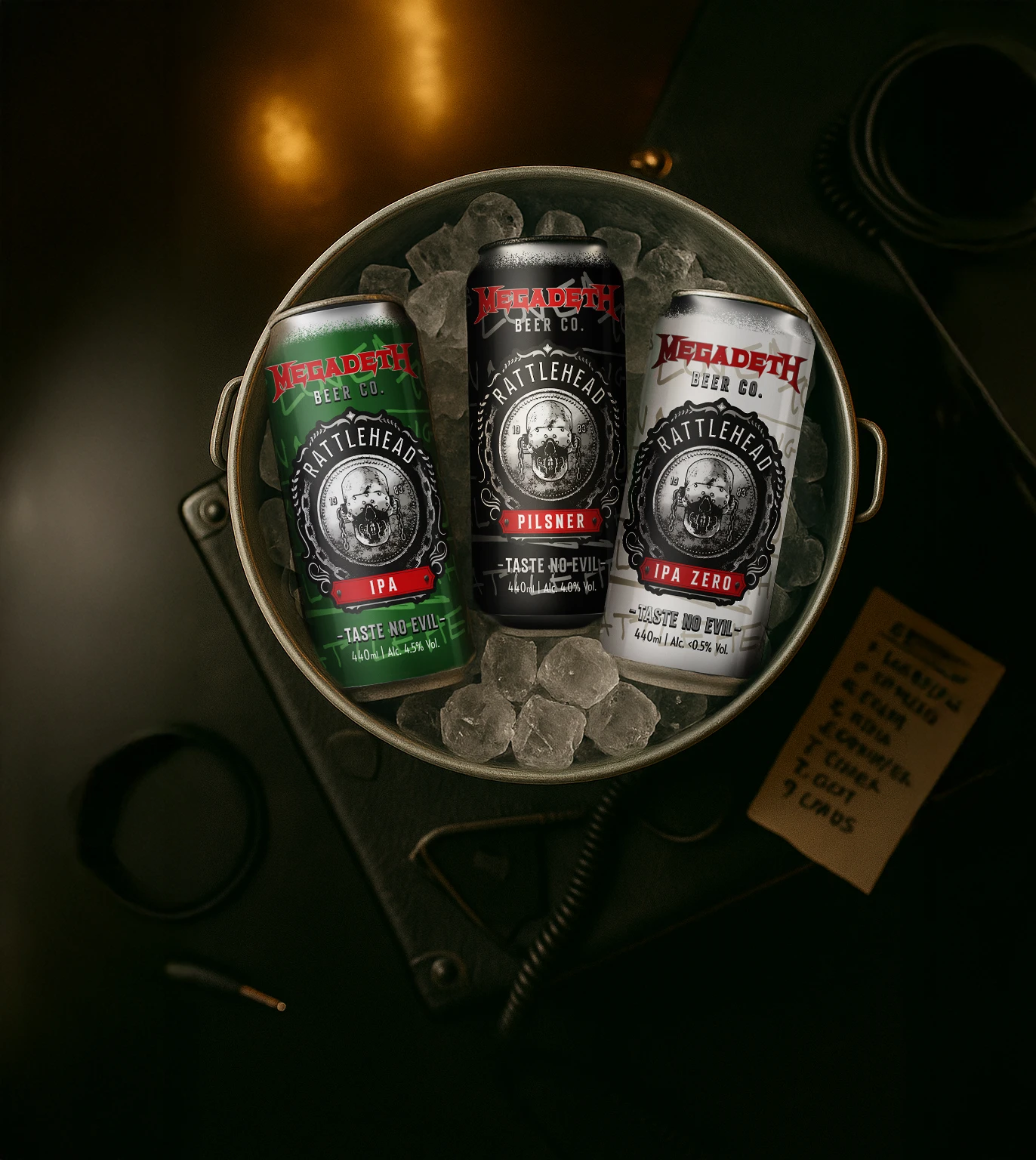 Creating imagery for Megadeth's new beer brand. Retouching in cans into ai imagery, created and edited by me.