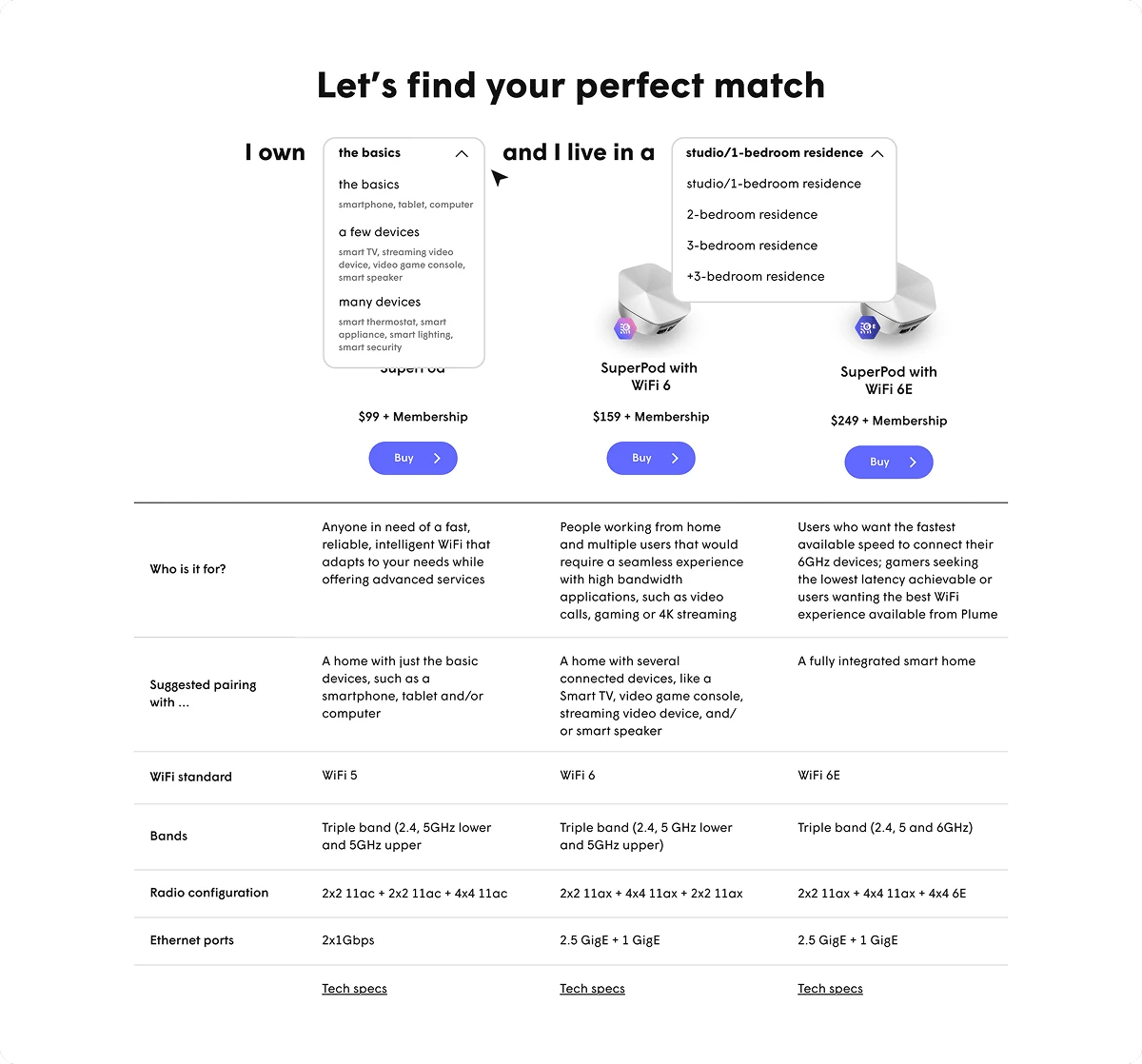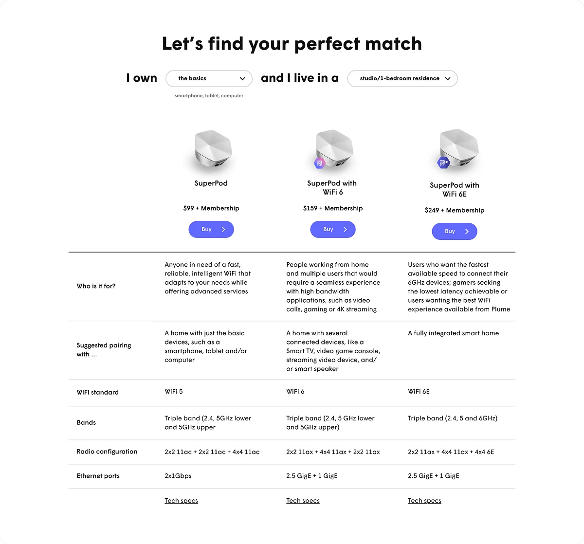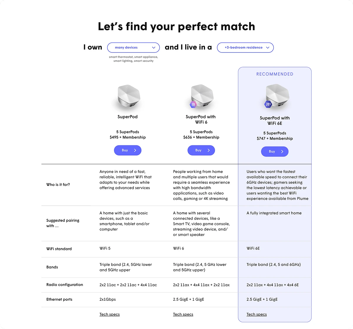 With the arrival of Plume HomePass’s latest wi-fi connectivity product, the SuperPod 6E, my goal was to refresh the landing page to market the new product. Plume requested to make it simple for users to compare their wi-fi products against each other.
