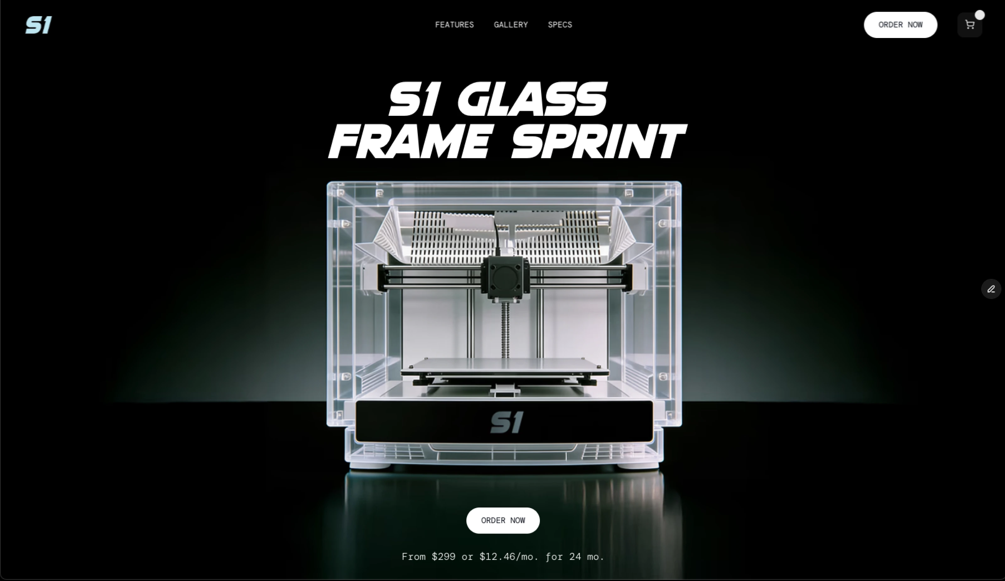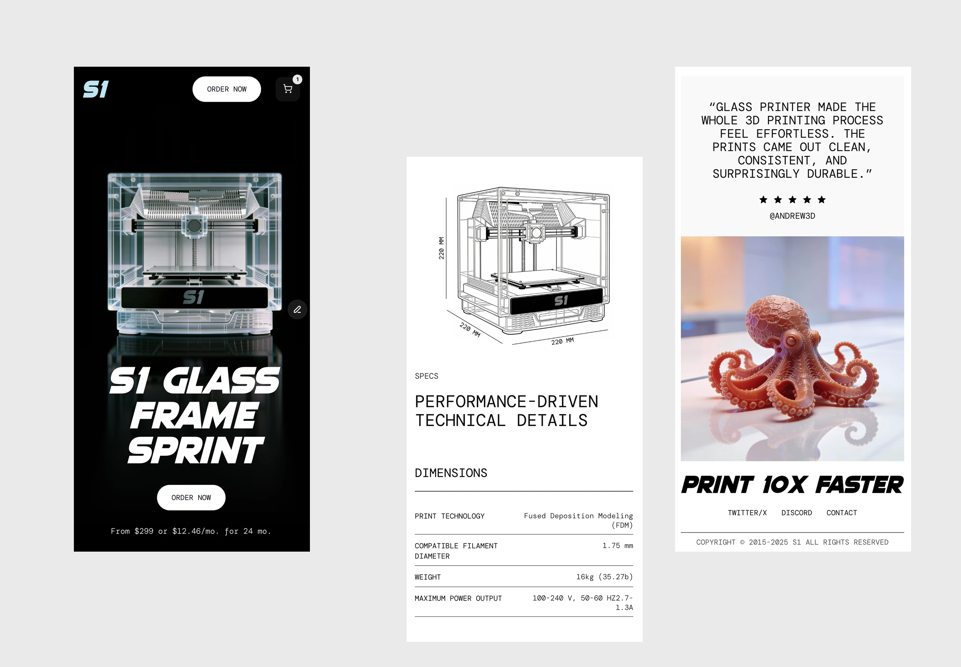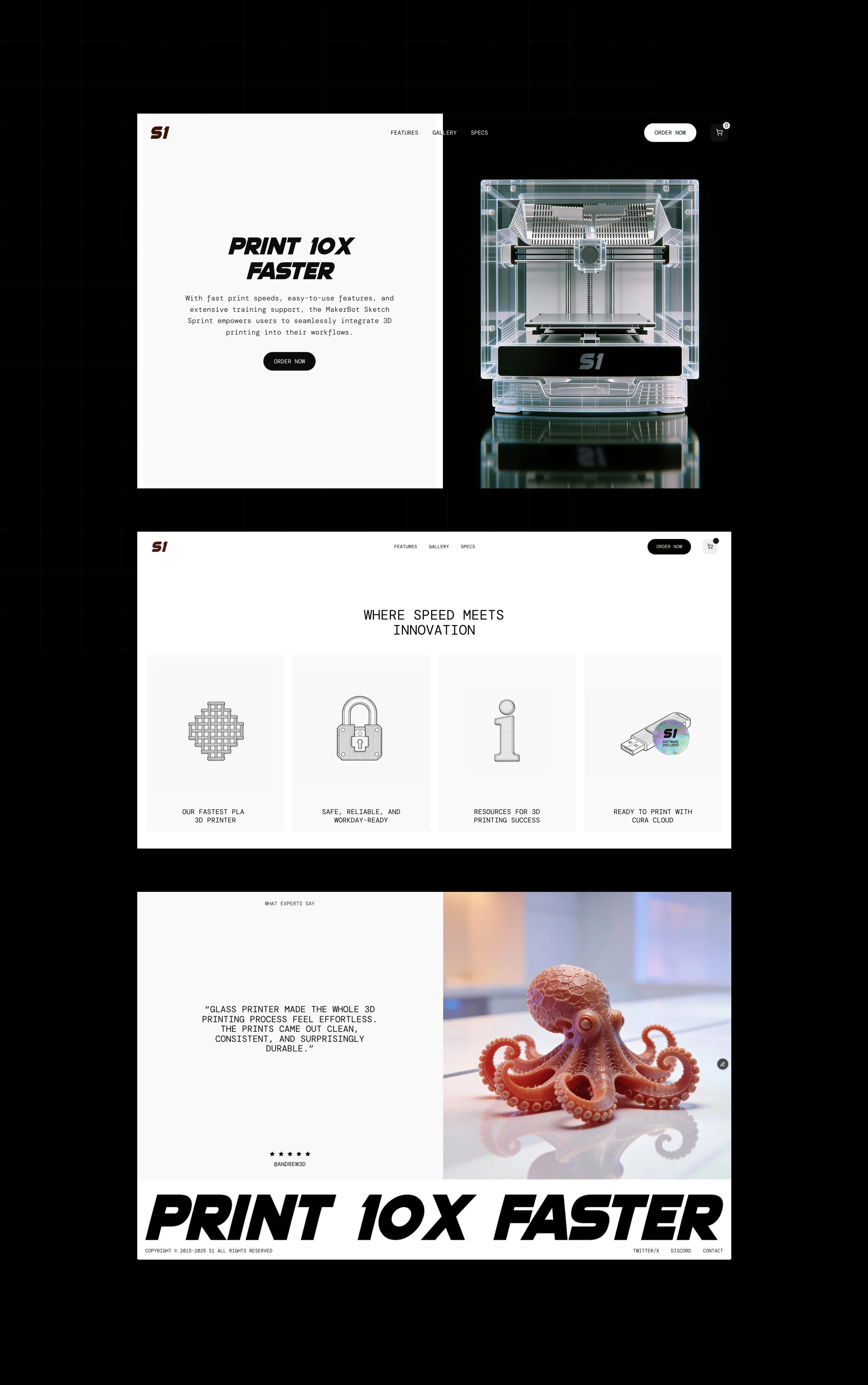 The S1 GLASS FRAME SPRINT landing page was built to answer real user questions about a new 3D printer: speed, reliability, and daily use.