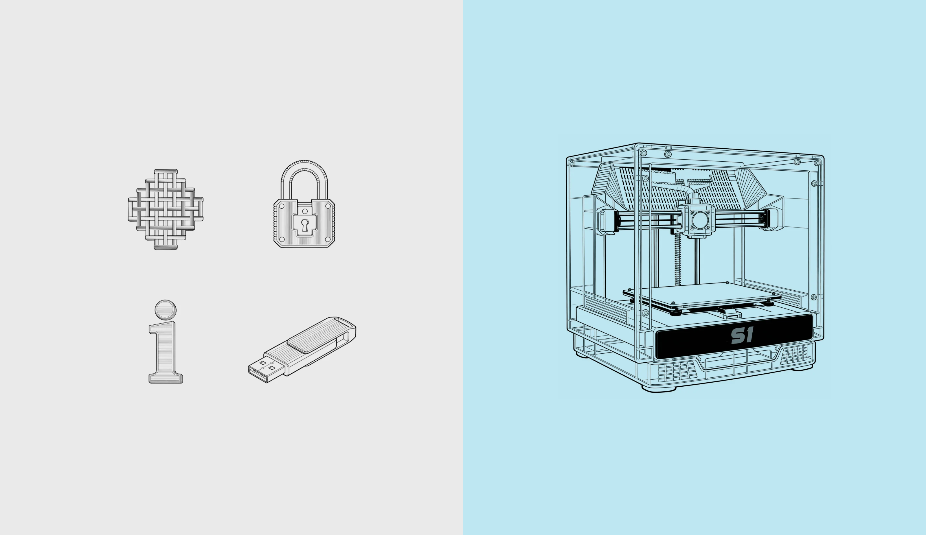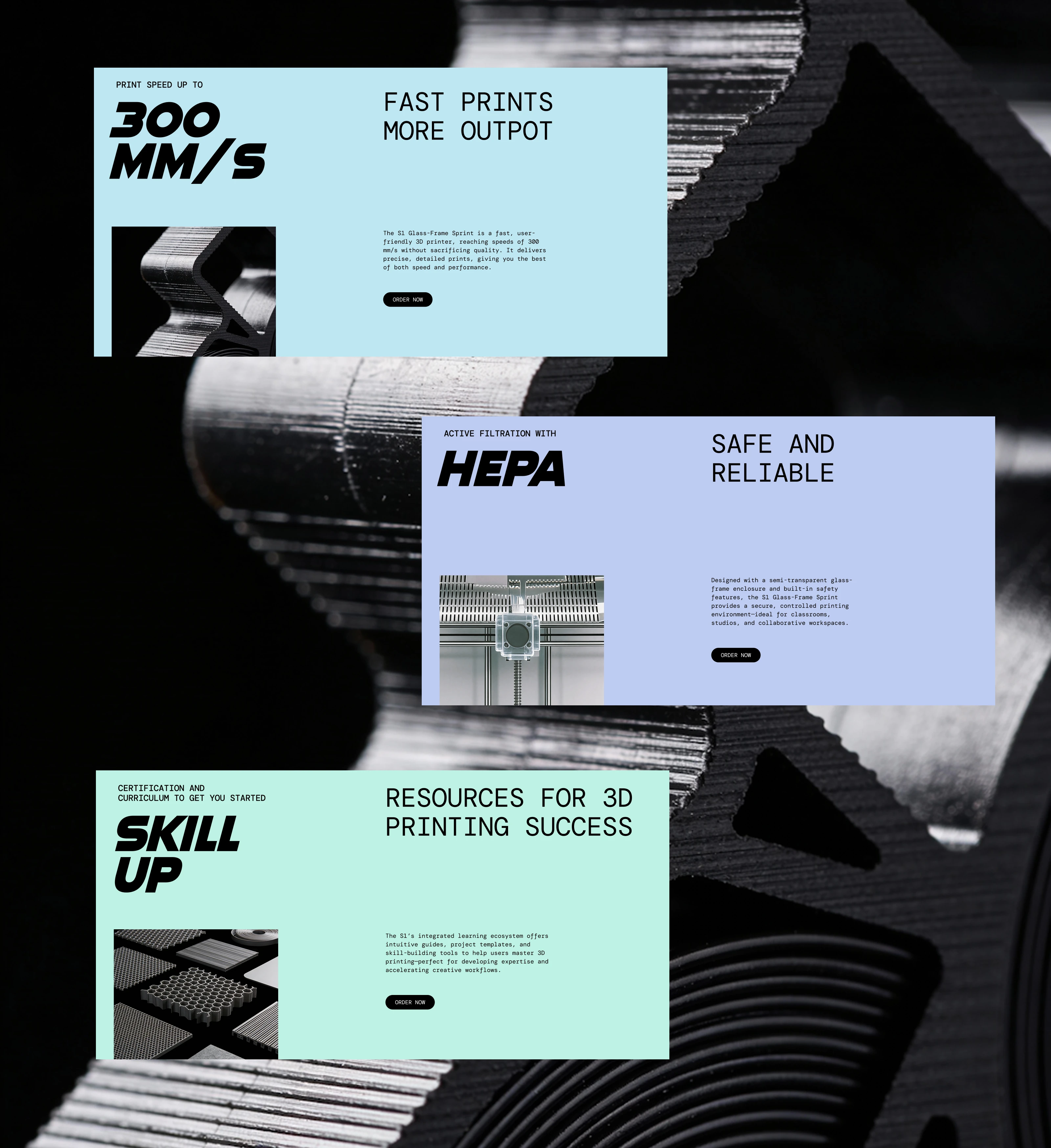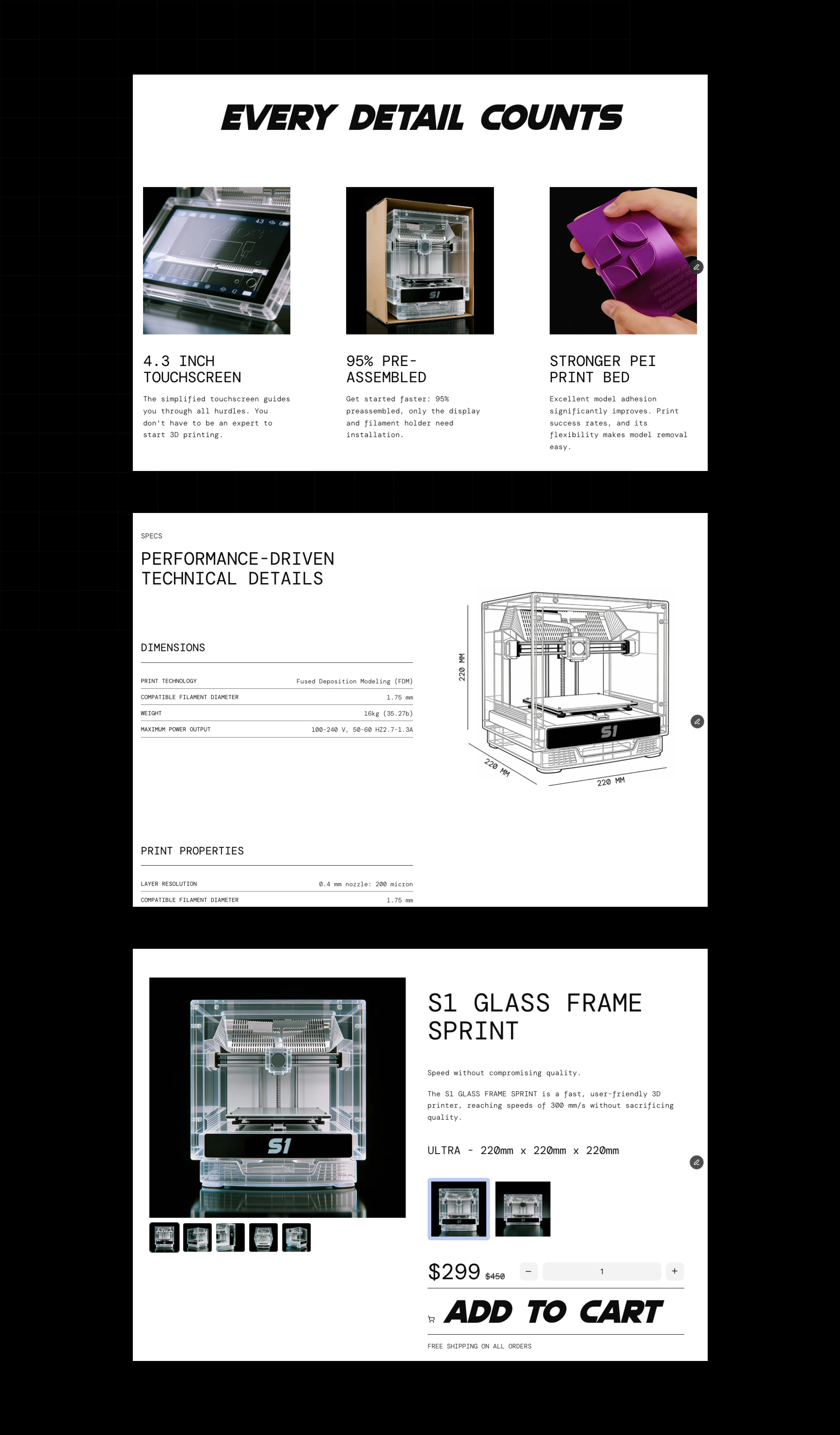 The S1 GLASS FRAME SPRINT landing page was built to answer real user questions about a new 3D printer: speed, reliability, and daily use.