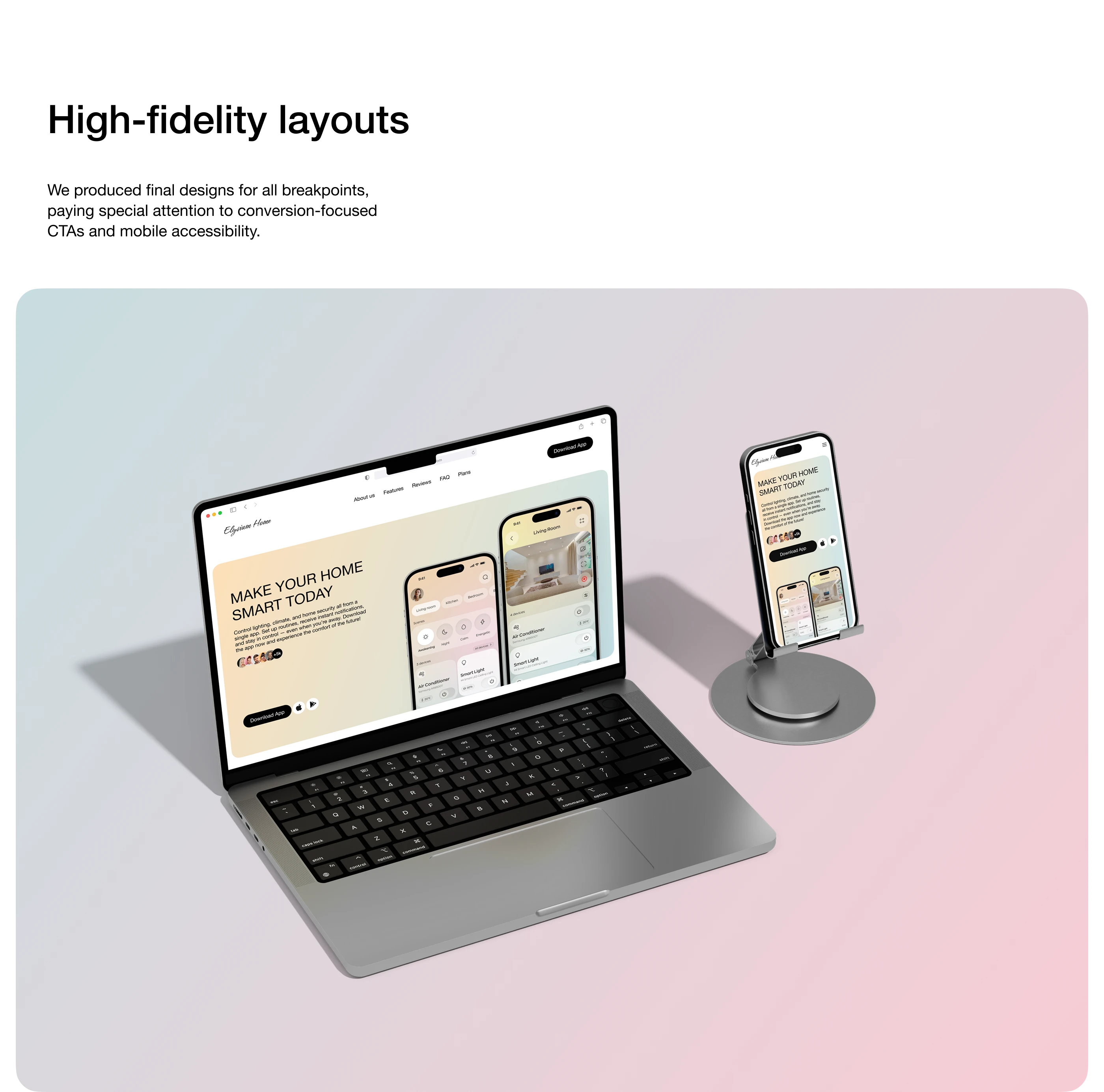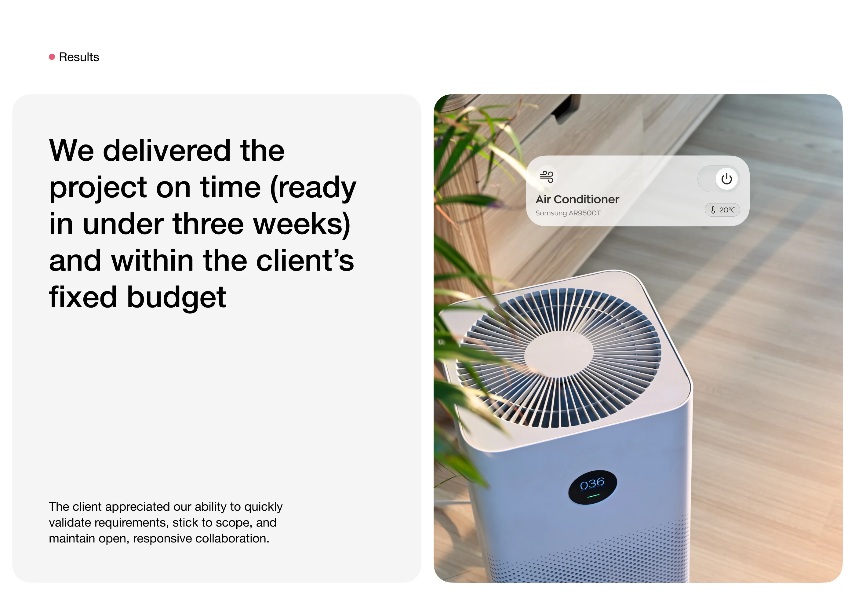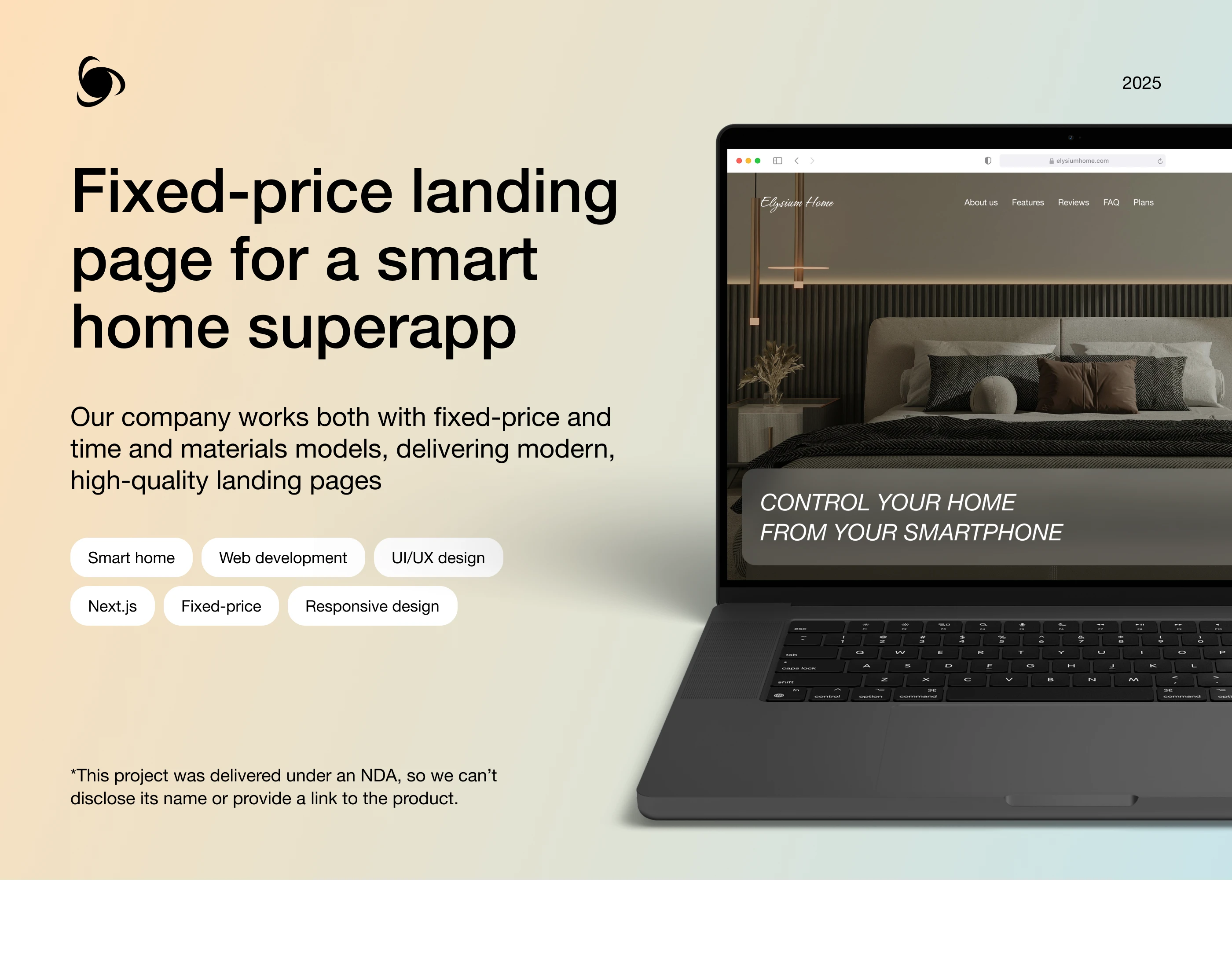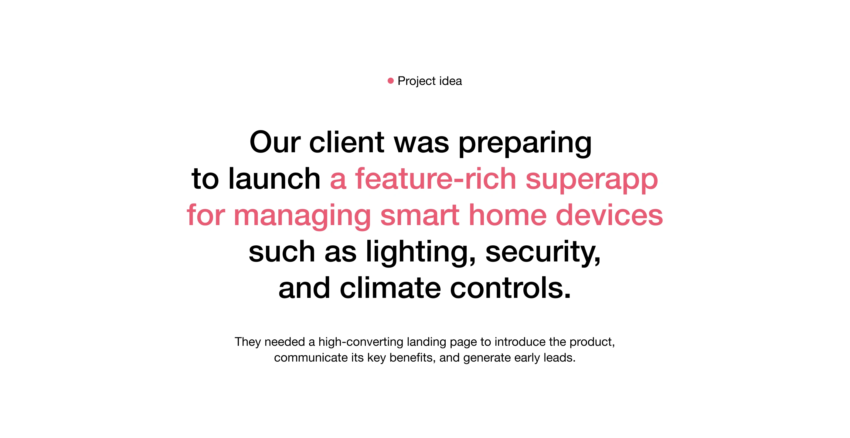 Ronas IT delivered a high-converting fixed-price landing page for an innovative smart home superapp. Our team provided end-to-end UI/UX design and responsive web development using Next.js, ensuring a pixel-perfect and engaging introduction to the product. This project highlights our expertise in delivering high-quality landing page design and web development within strict budget and timeline constraints. The responsive solution effectively showcases the superapp's benefits, helping our client generate early leads and establish a strong online presence for their smart home solution.