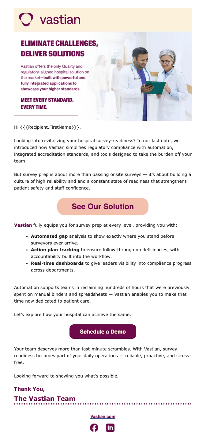 Vastian partnered with me to elevate the performance and reliability of their email marketing program. I owned end-to-end execution, including audience acquisition and segmentation, workflow setup, strategic planning, campaign creation, design, scheduling, and full performance reporting.