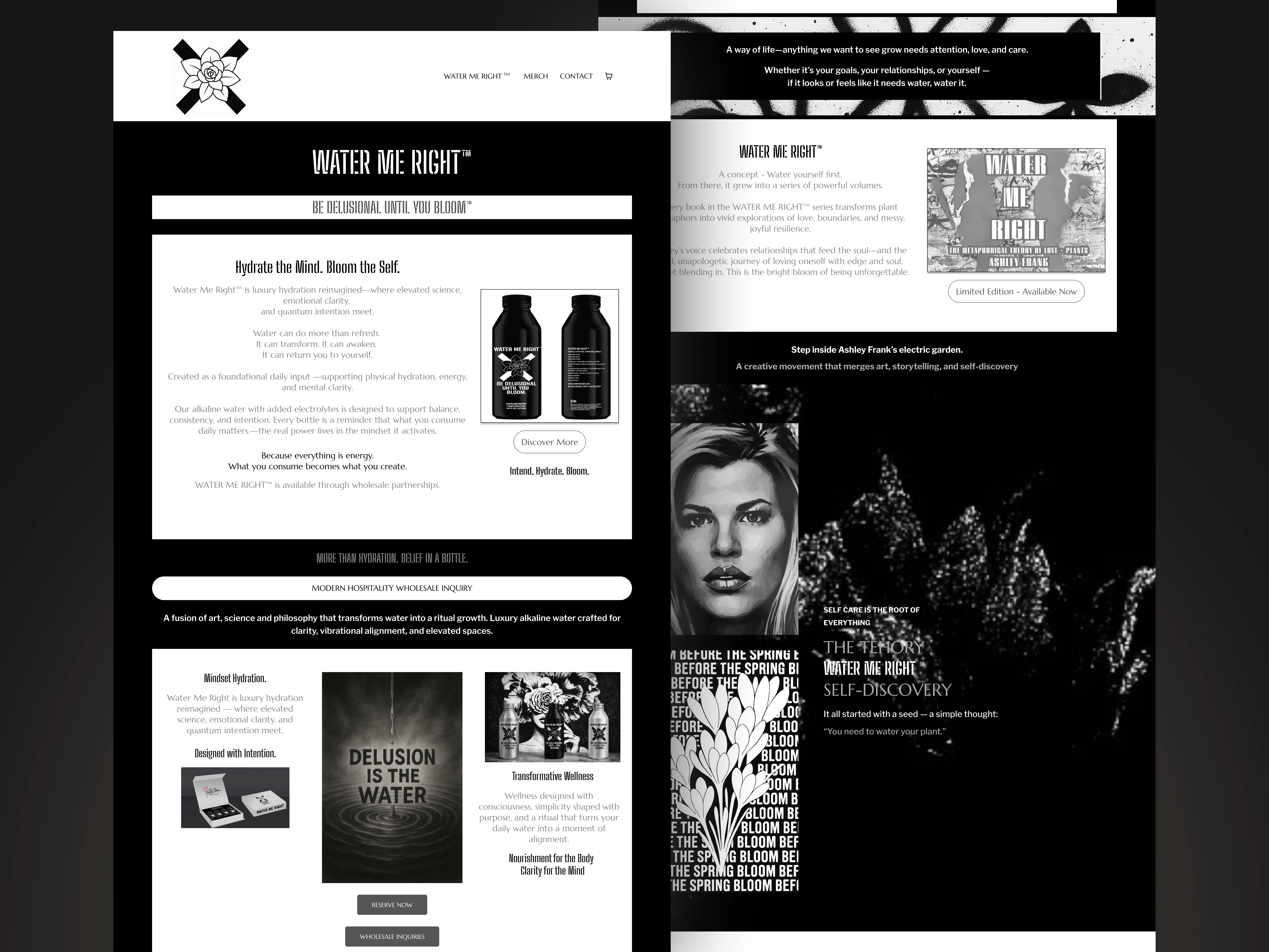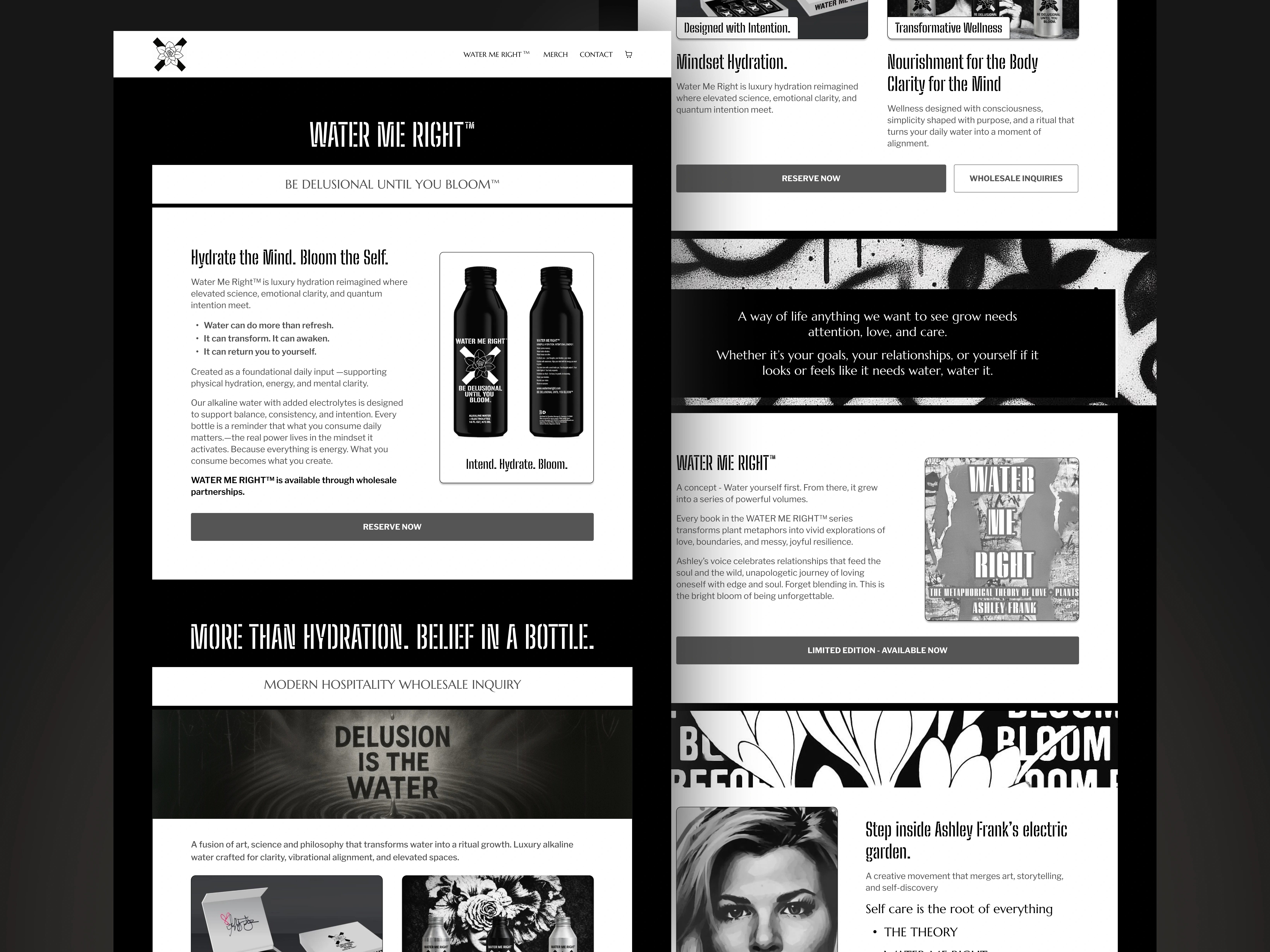 Water Me Right™ is a luxury alkaline hydration brand built at the intersection of elevated science, emotional clarity, and intentional living. Their philosophy — "Be Delusional Until You Bloom™" — is woven into every bottle, every label, every word.