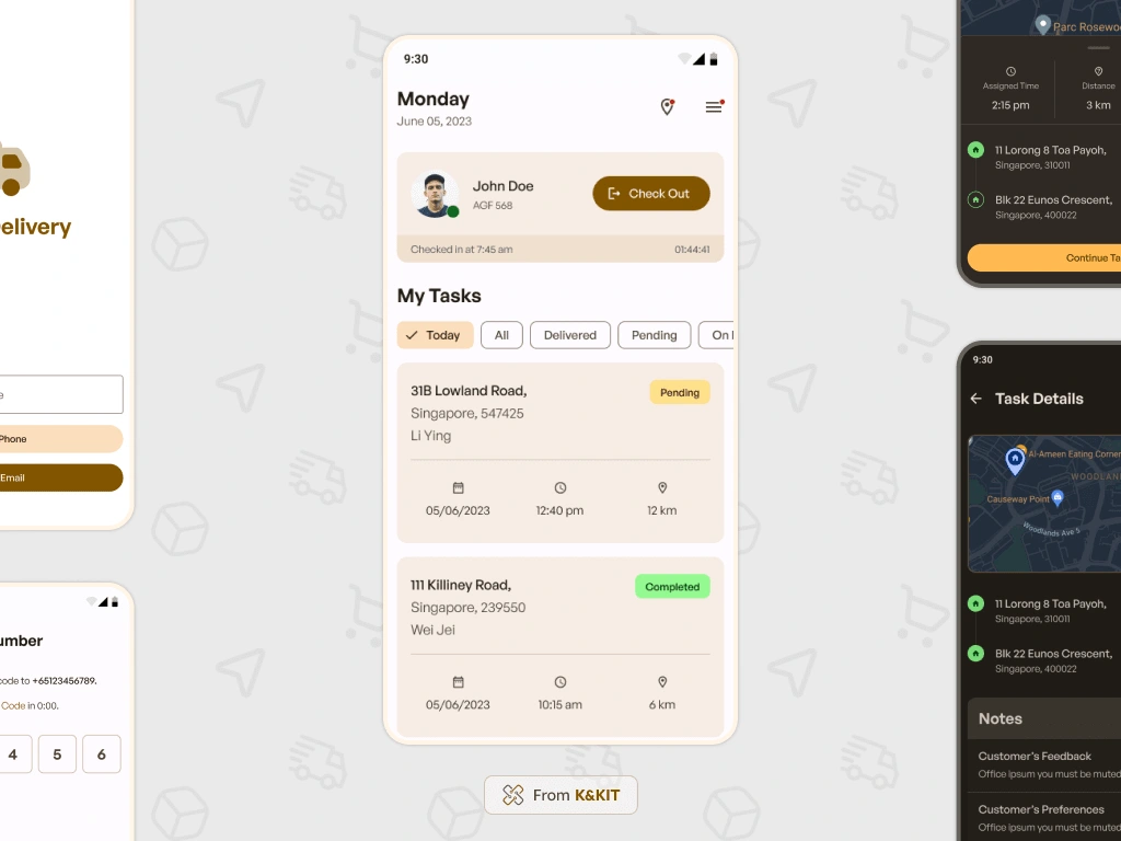 A Dark Mode option was included to reduce eye strain during nighttime deliveries and to conserve battery life. The design maintains readability and clarity, with carefully chosen contrasts and color accents that ensure key information remains easily visible in low-light conditions.
