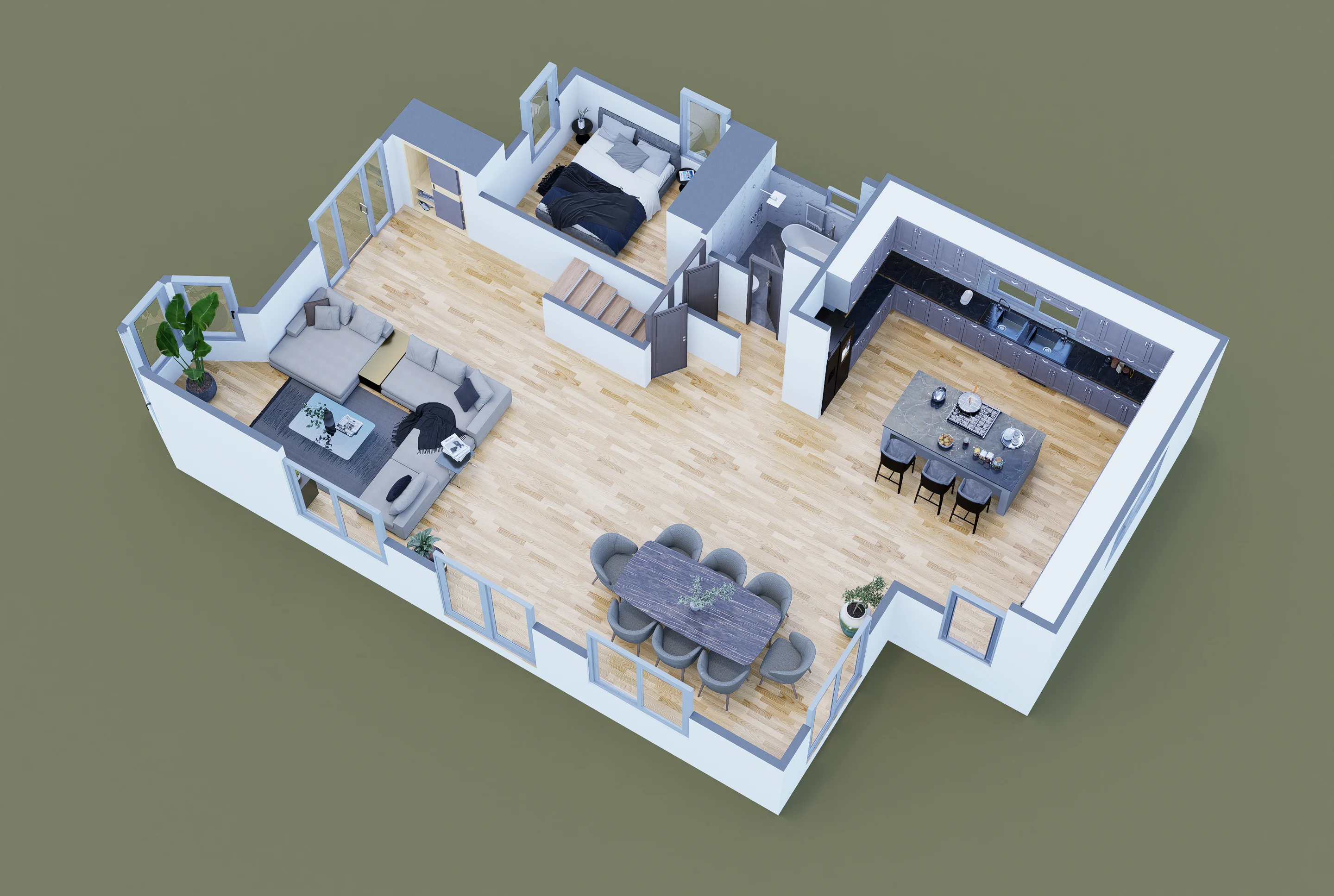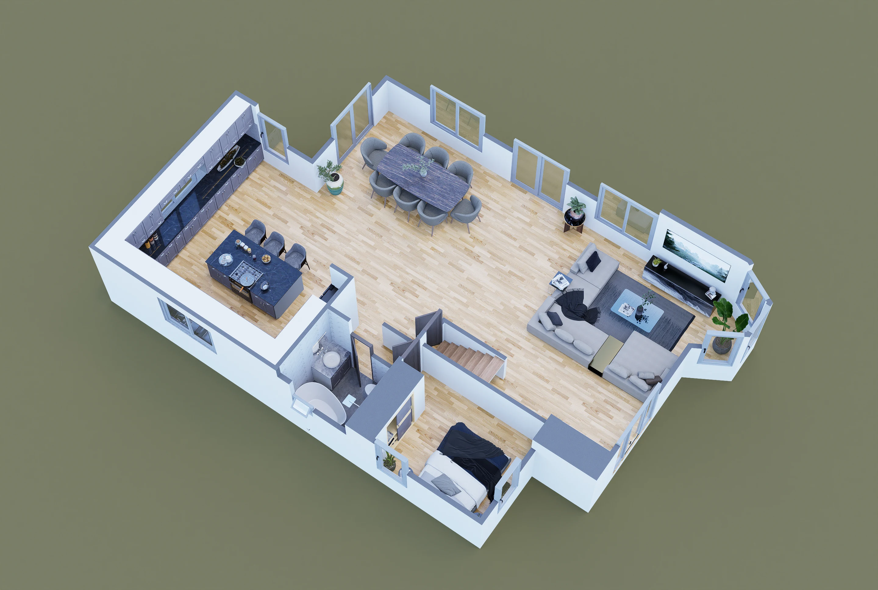 A 3D interior floor plan is a dynamic representation of a space, adding depth and realism. It includes detailed furnishings, material visualization, and lightin