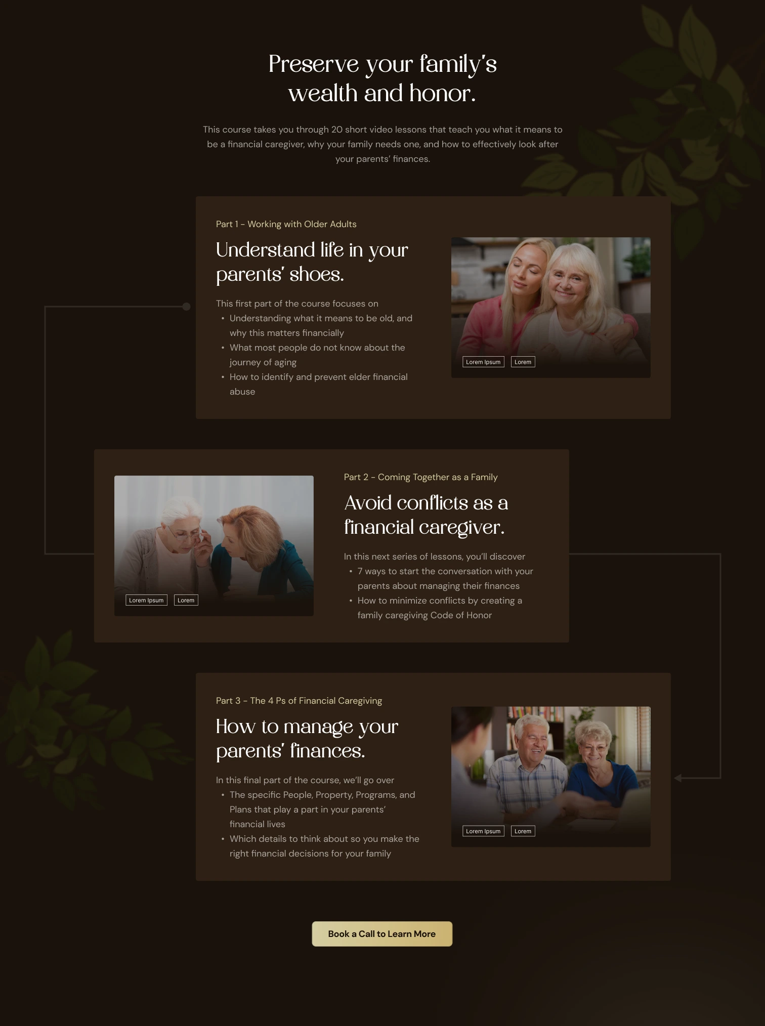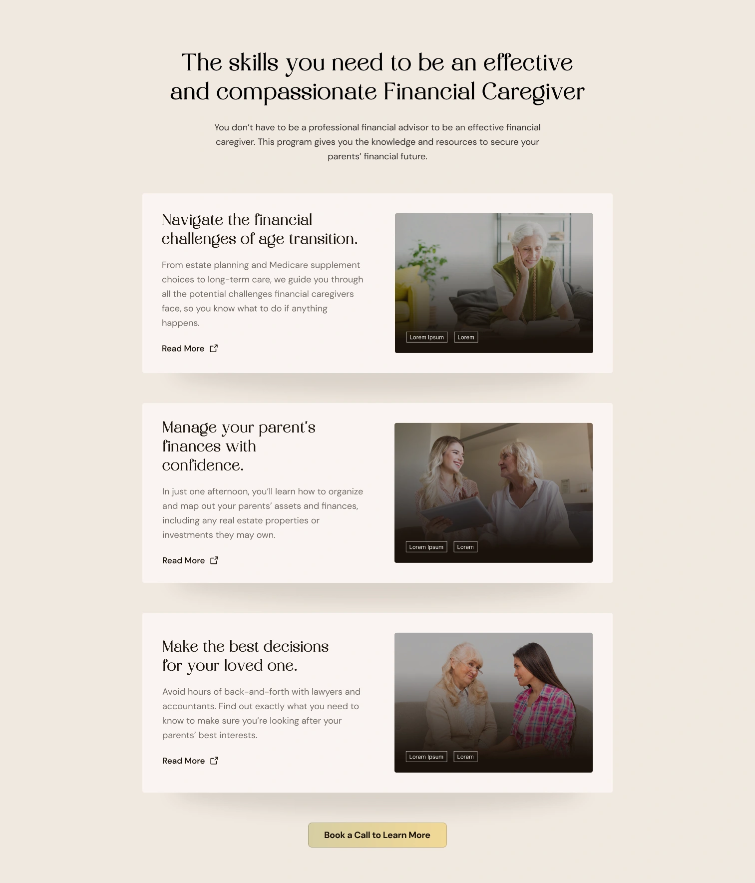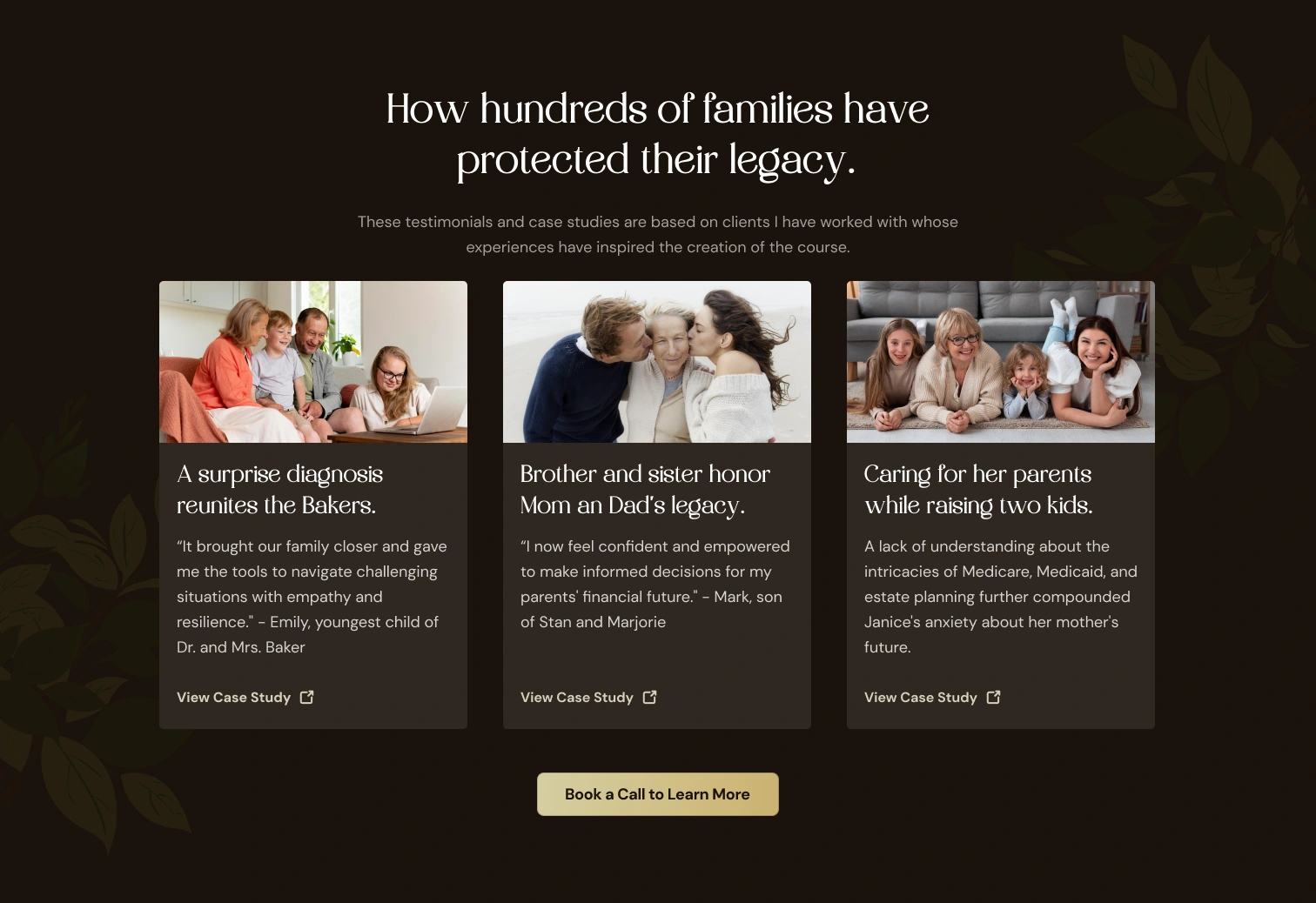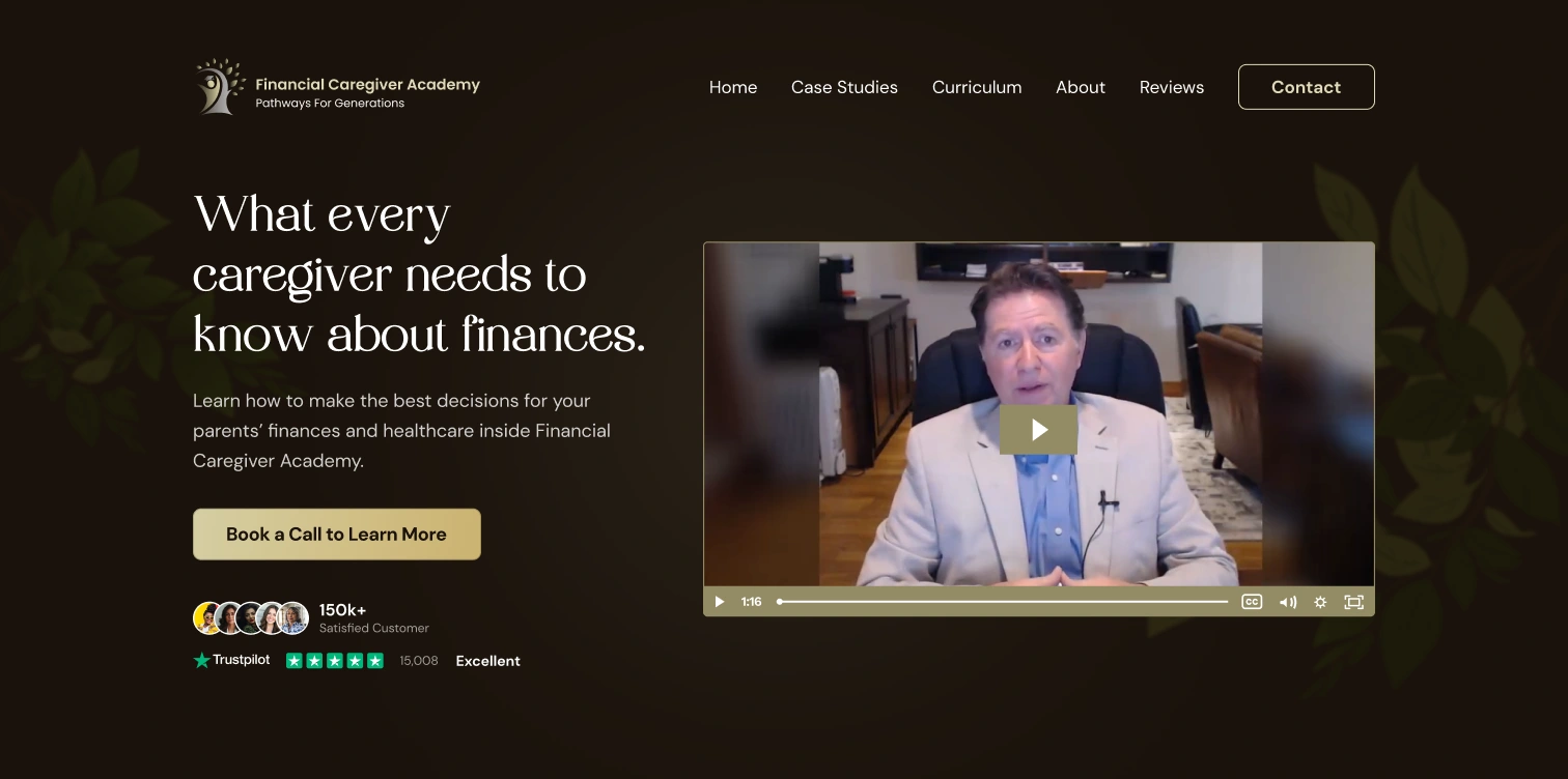 Landing page for a financial caregiving course. Built to educate family caregivers on how to manage aging parents’ finances with clarity, compassion, and confidence.