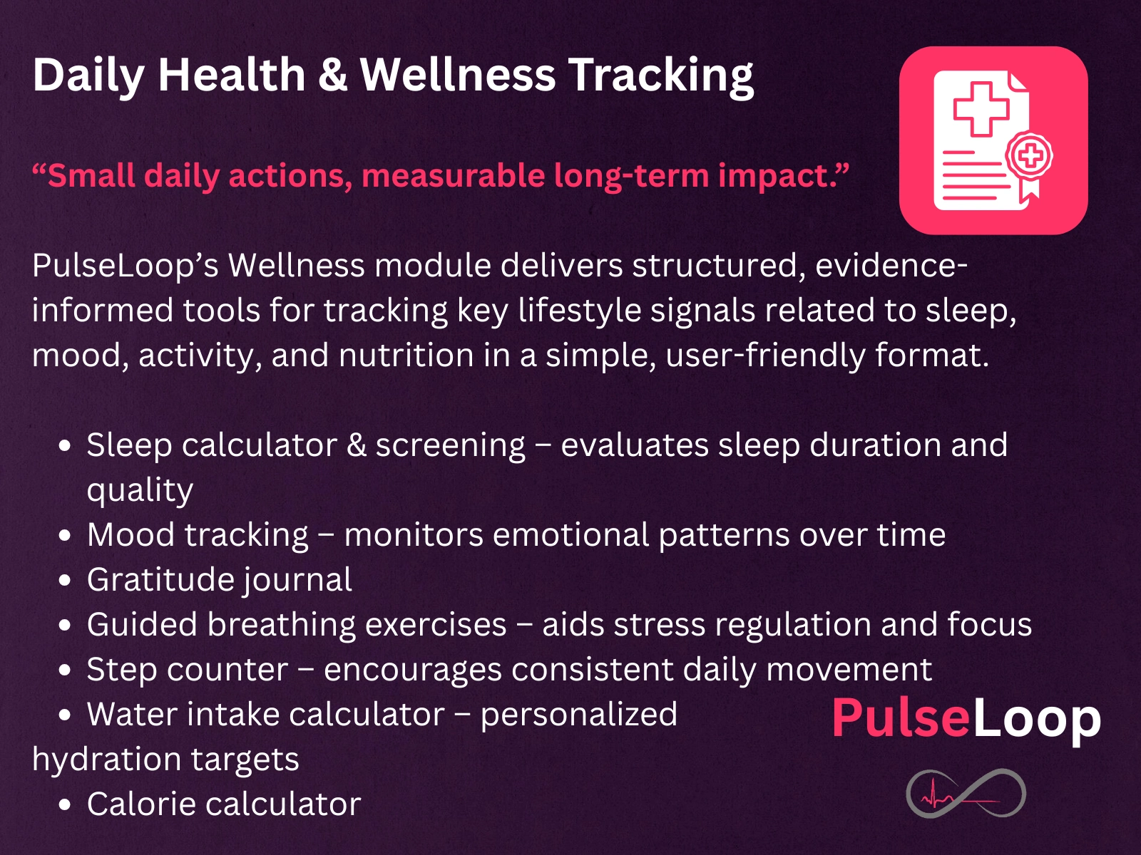 This wellness module delivers structured tools for tracking key lifestyle habits related to sleep, mood, activity, and nutrition in a user-friendly format.