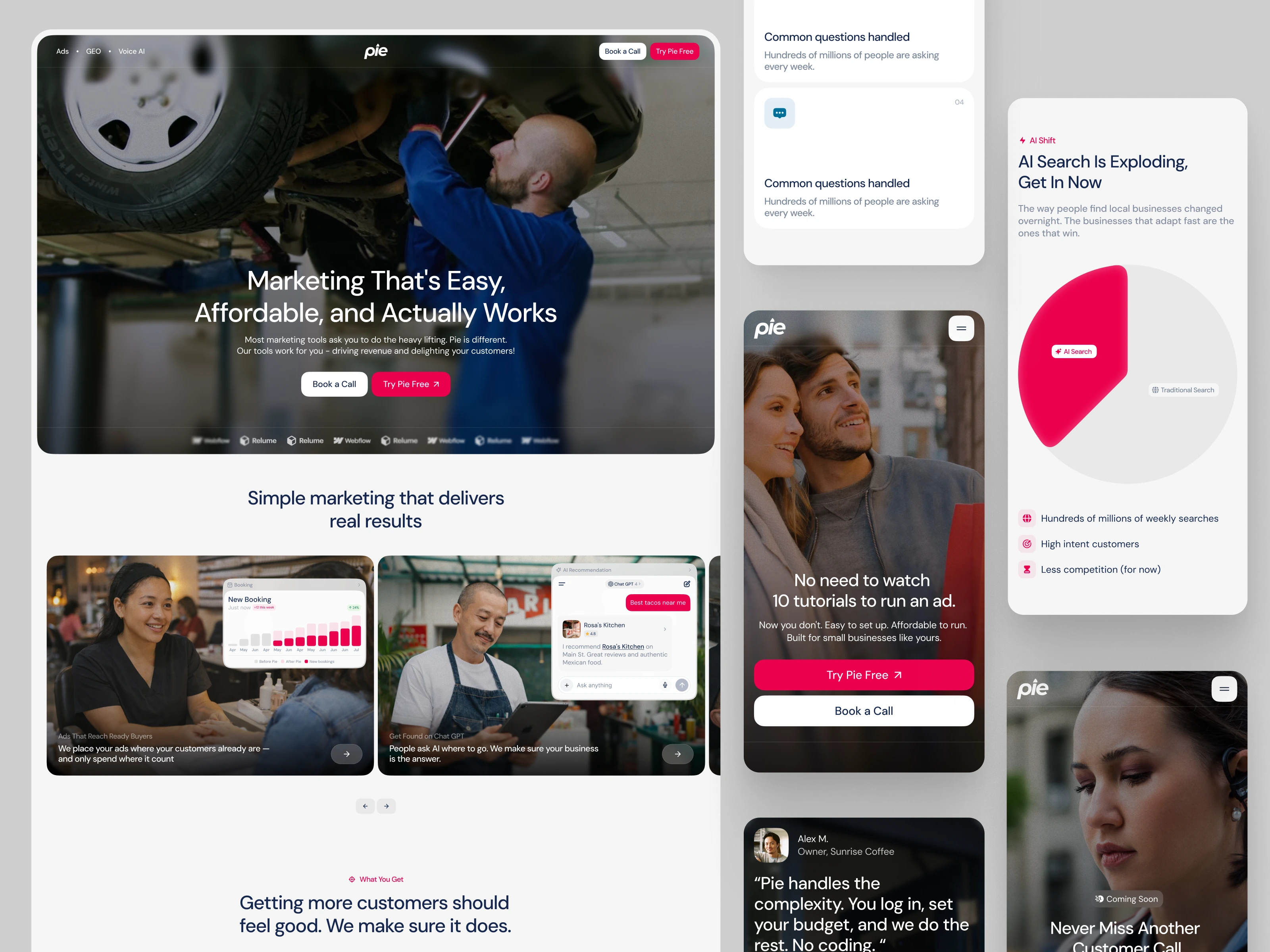 Pie is an AI marketing platform built for local business owners, contractors, auto repair shops, beauty salons, boutique fitness studios, franchise operators, and the thousands of small businesses in between. Instead of paying a traditional marketing agency, Pie's customers get an AI-native system that runs targeted ads on Google Maps, Yelp, and Nextdoor, makes sure their business shows up when people ask ChatGPT, Claude, Gemini, and Perplexity for recommendations, and (soon) handles inbound phone calls 24/7 with AI voice agents, all at roughly 5% of what a traditional agency costs. Their customers are seeing real results, more calls, more walk-ins, more revenue, and Pie needed a website that could credibly carry that story to owners who have heard every marketing pitch in the book.