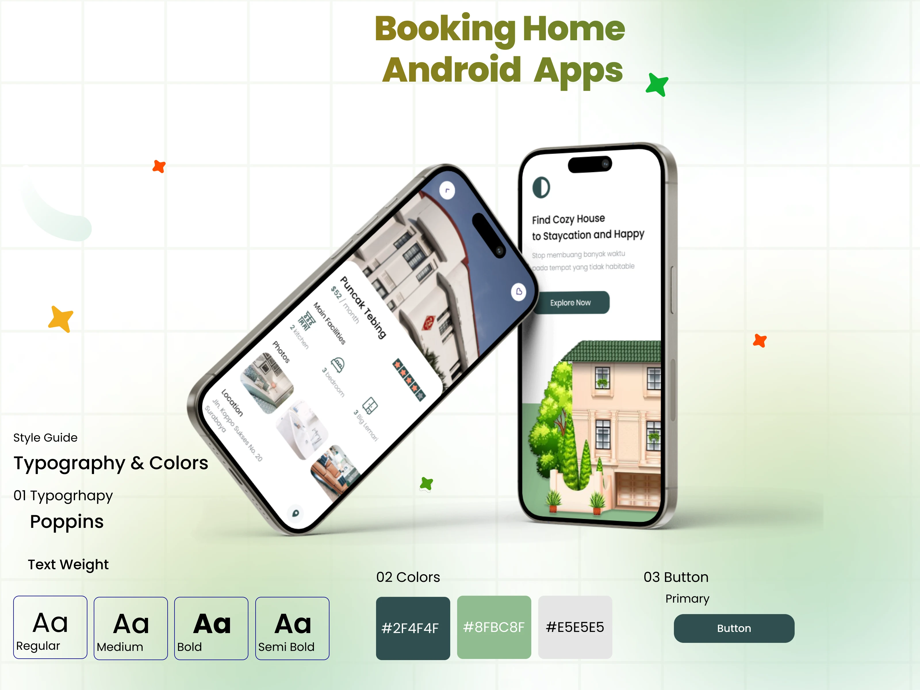 The UI displays a list of homestays, search filters, facility details, booking calendar, and confirmation button.