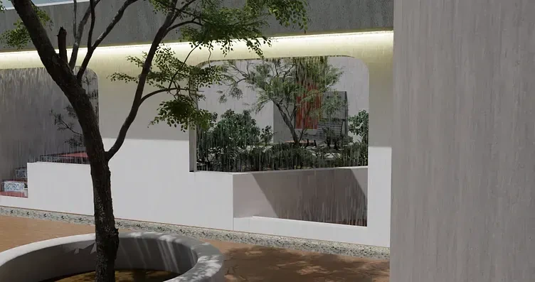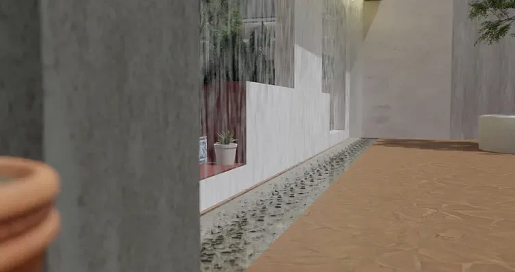 Modeled architecture and simulated water curtain using Blender.