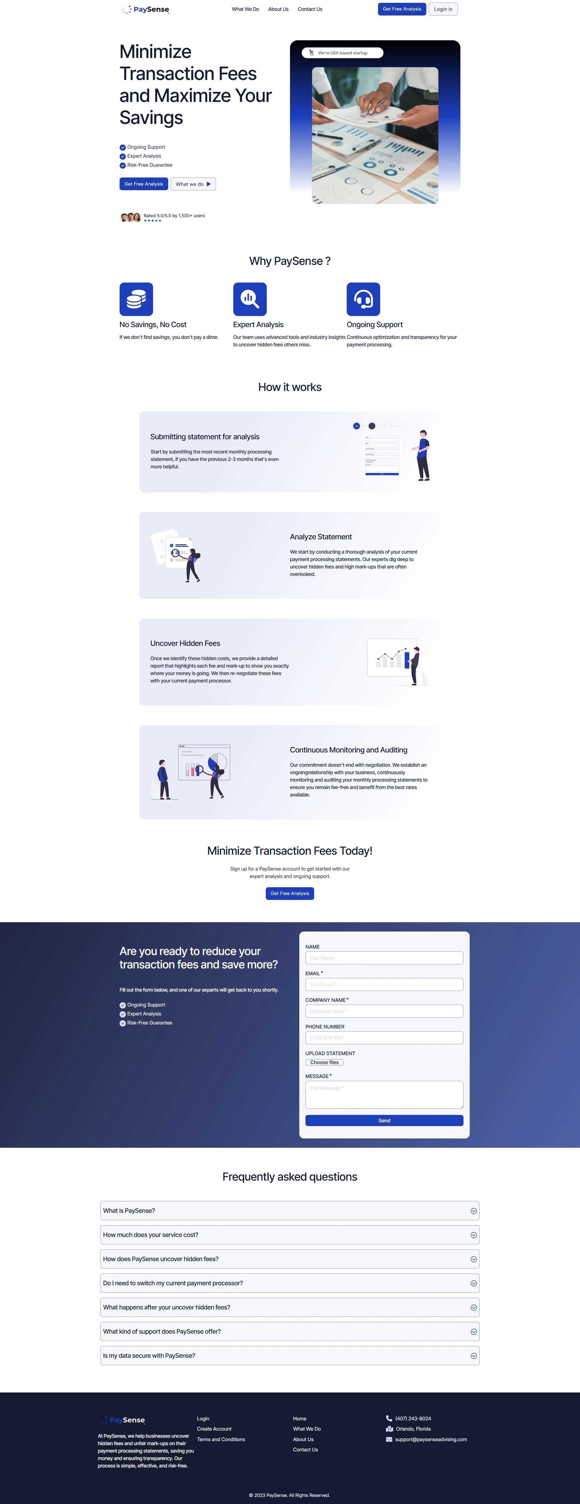 Challenge: PaySense needed a comprehensive website and web platform to streamline their client interactions. The challenge was to create a system where clients could easily submit their payment processing statements for analysis and receive detailed reports on hidden fees and savings opportunities, all while maintaining an ongoing relationship for continuous fee monitoring.