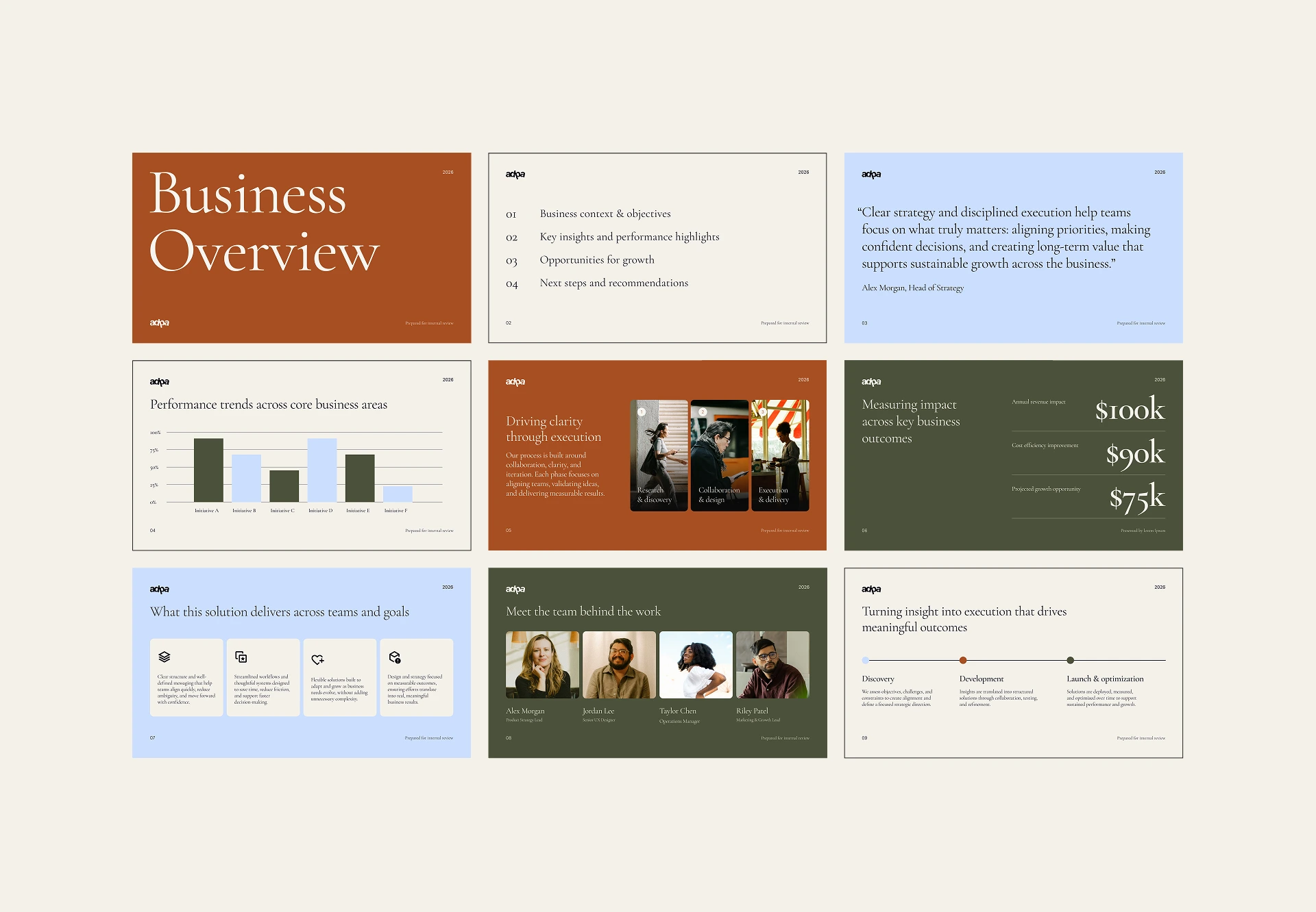 Business presentations often struggle to keep audiences engaged, especially when the material is complex. The challenge was to create a system that makes information easy to absorb by blending structure, a sense of calm, and genuine engagement, all while keeping the design simple and highly functional.