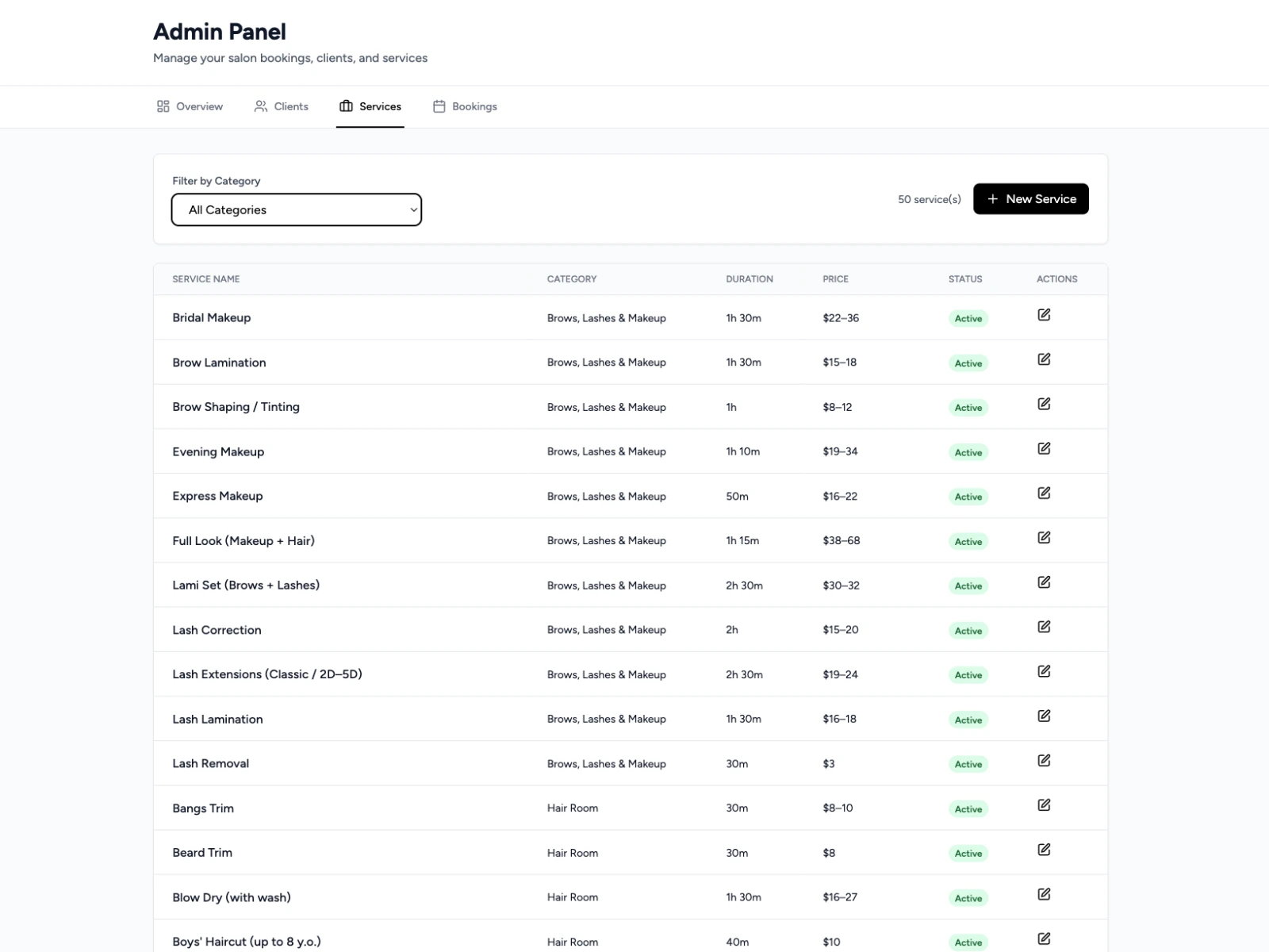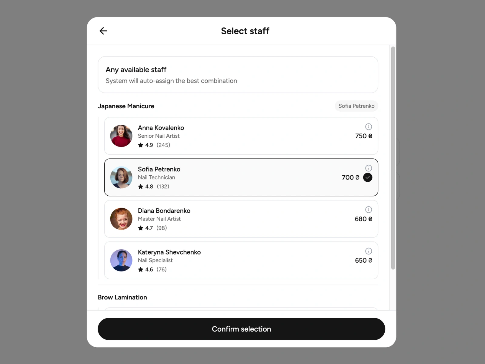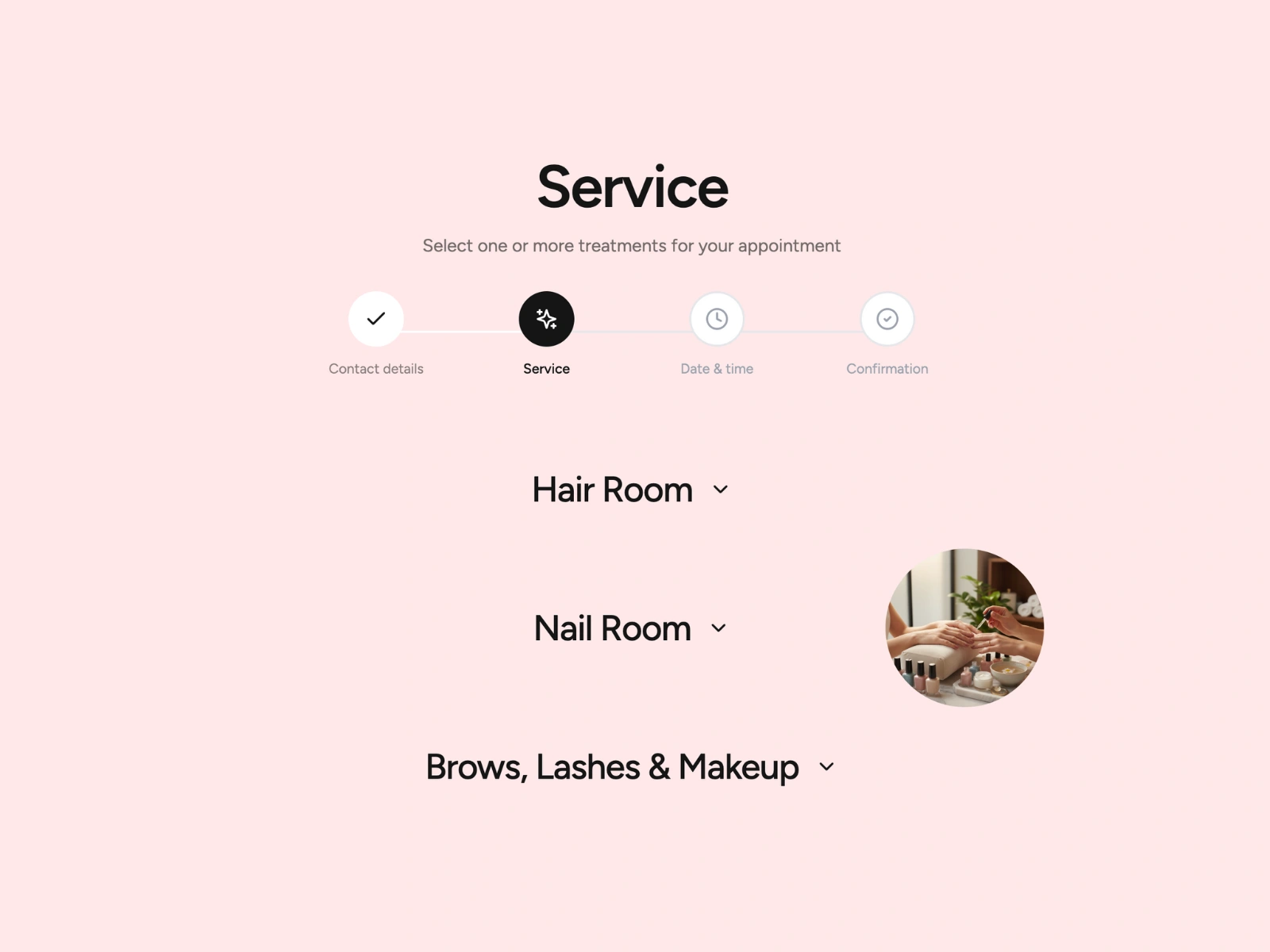 → Service selection with category filtering (hair, nails, brows, etc.)