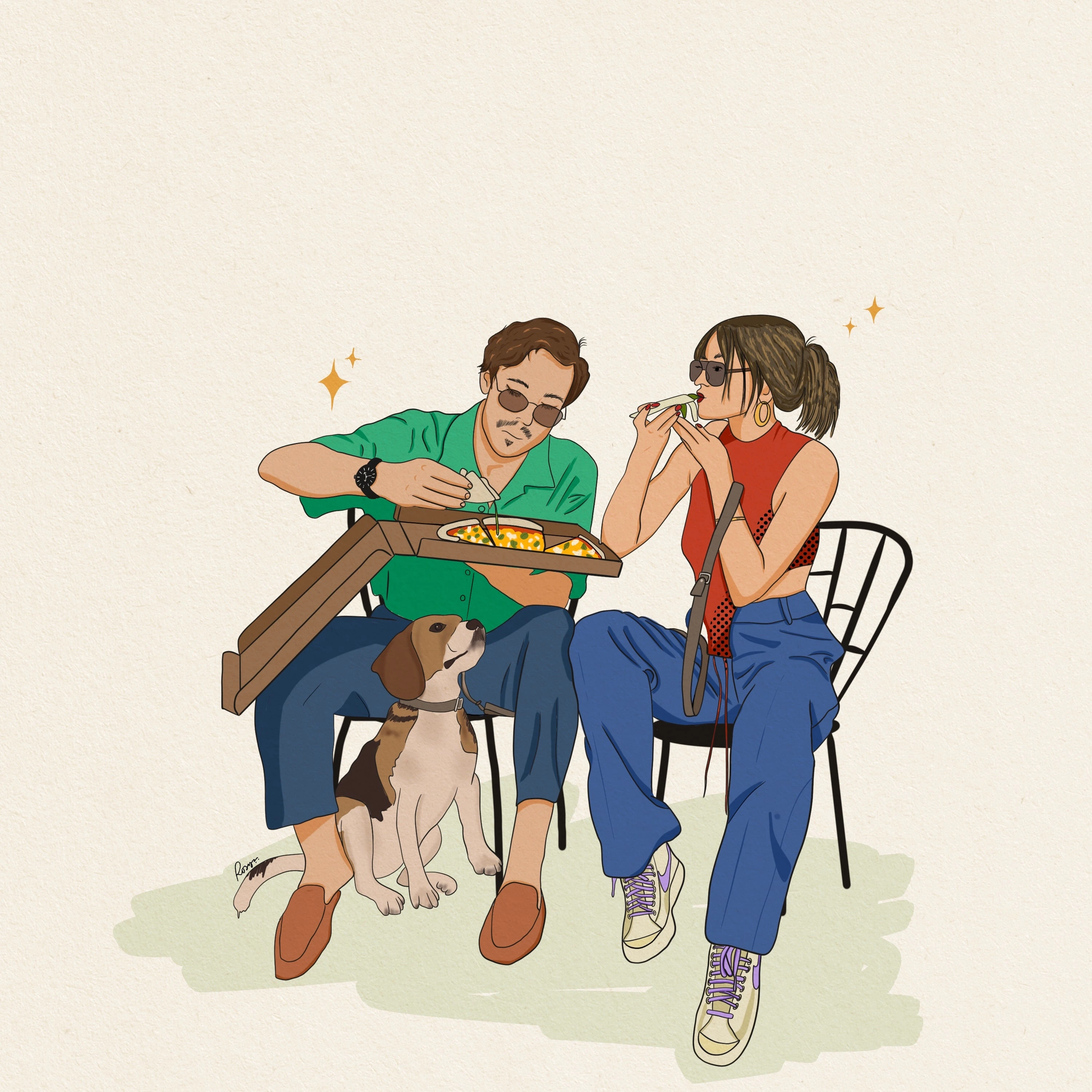 Spending moments together illustration. This was illustrated in procreate and animated in procreate dreams. This illustration depicts a candid scene of two people enjoying pizza with their dog, capturing the charm in small, shared moments in day to day lives. I combined playful composition with rich colors to portray a cozy, slice-of-life.