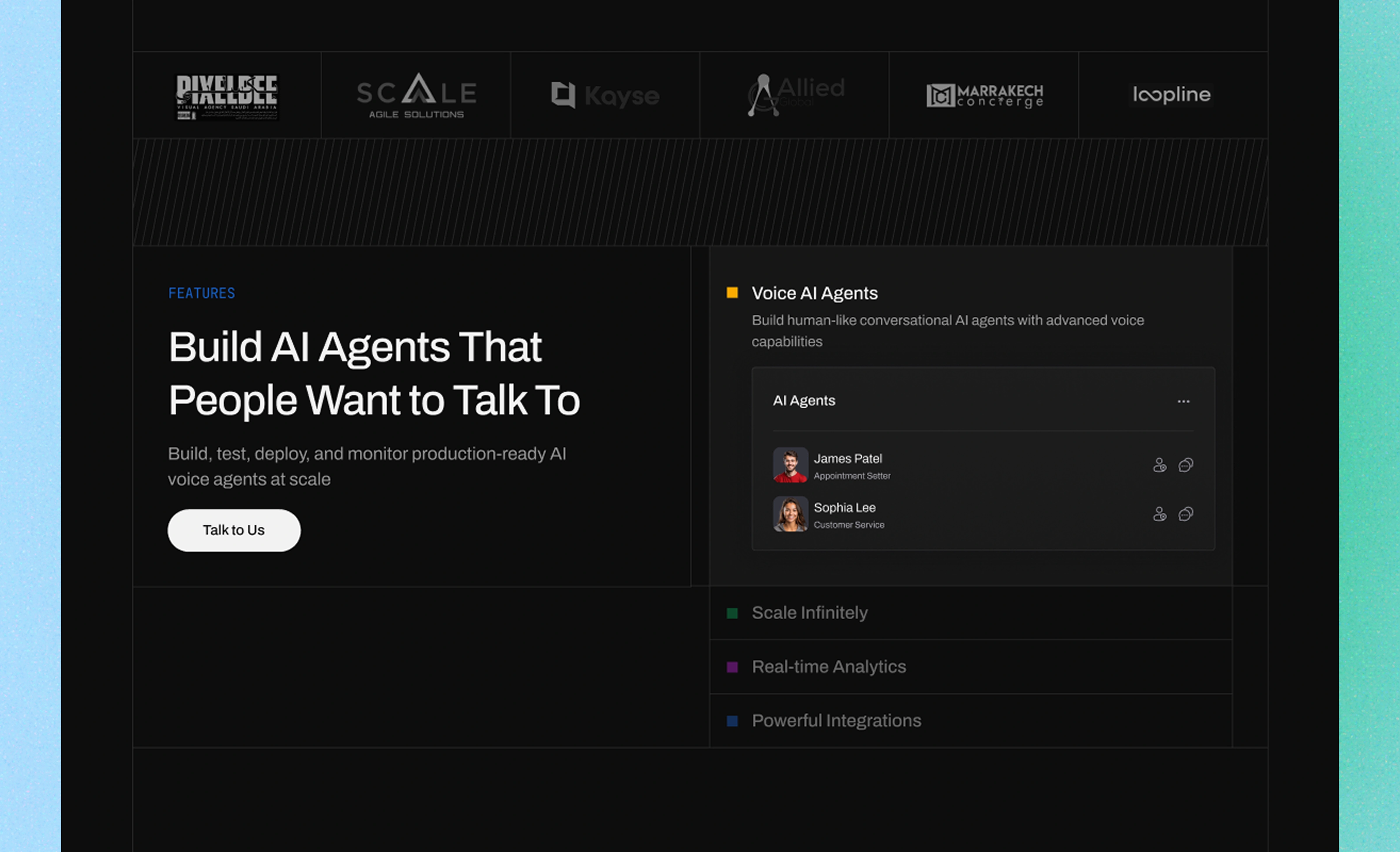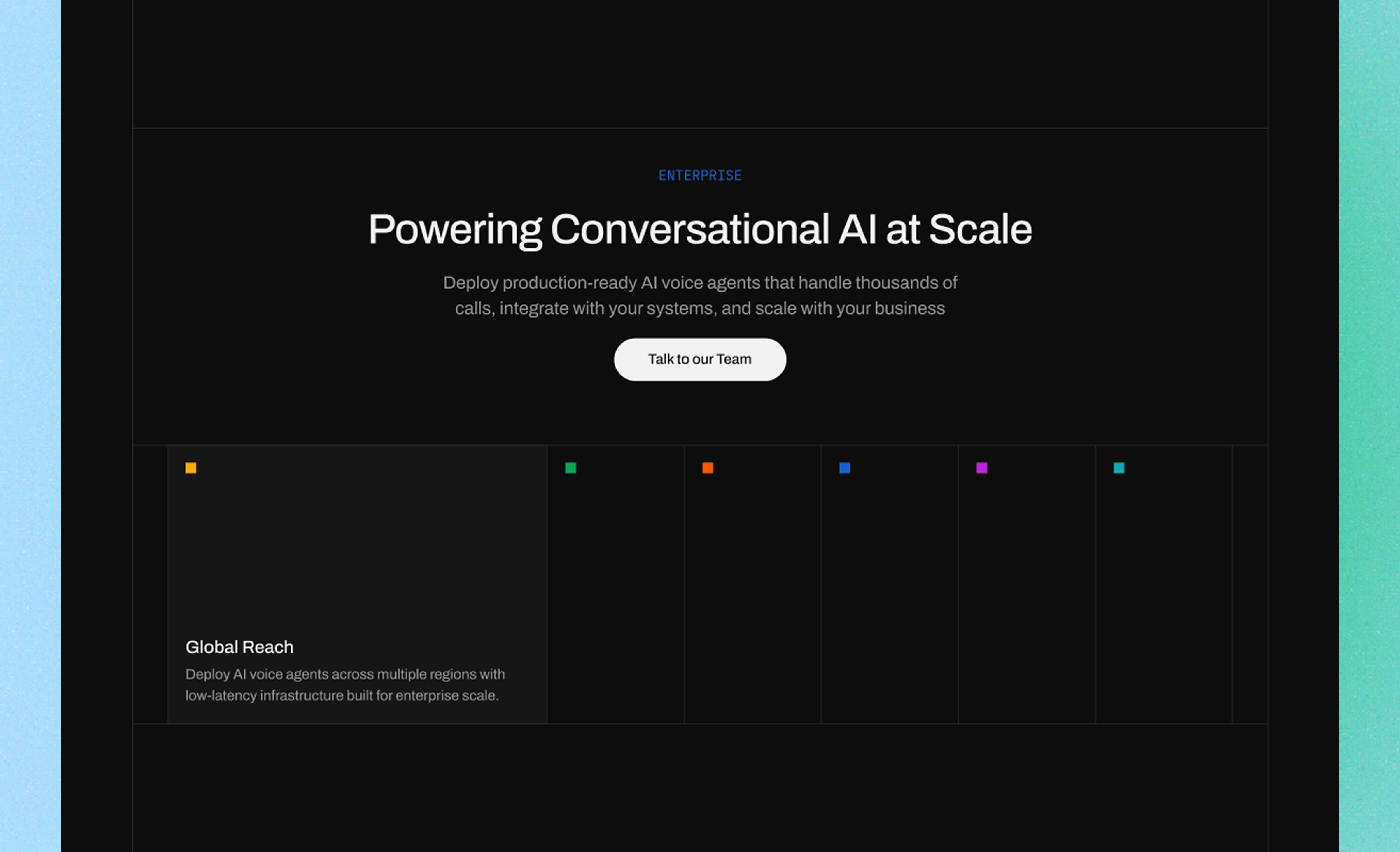Web experience for an autonomous AI voice platform, using clear UI/UX and purposeful motion to simplify complex, production-scale technology.