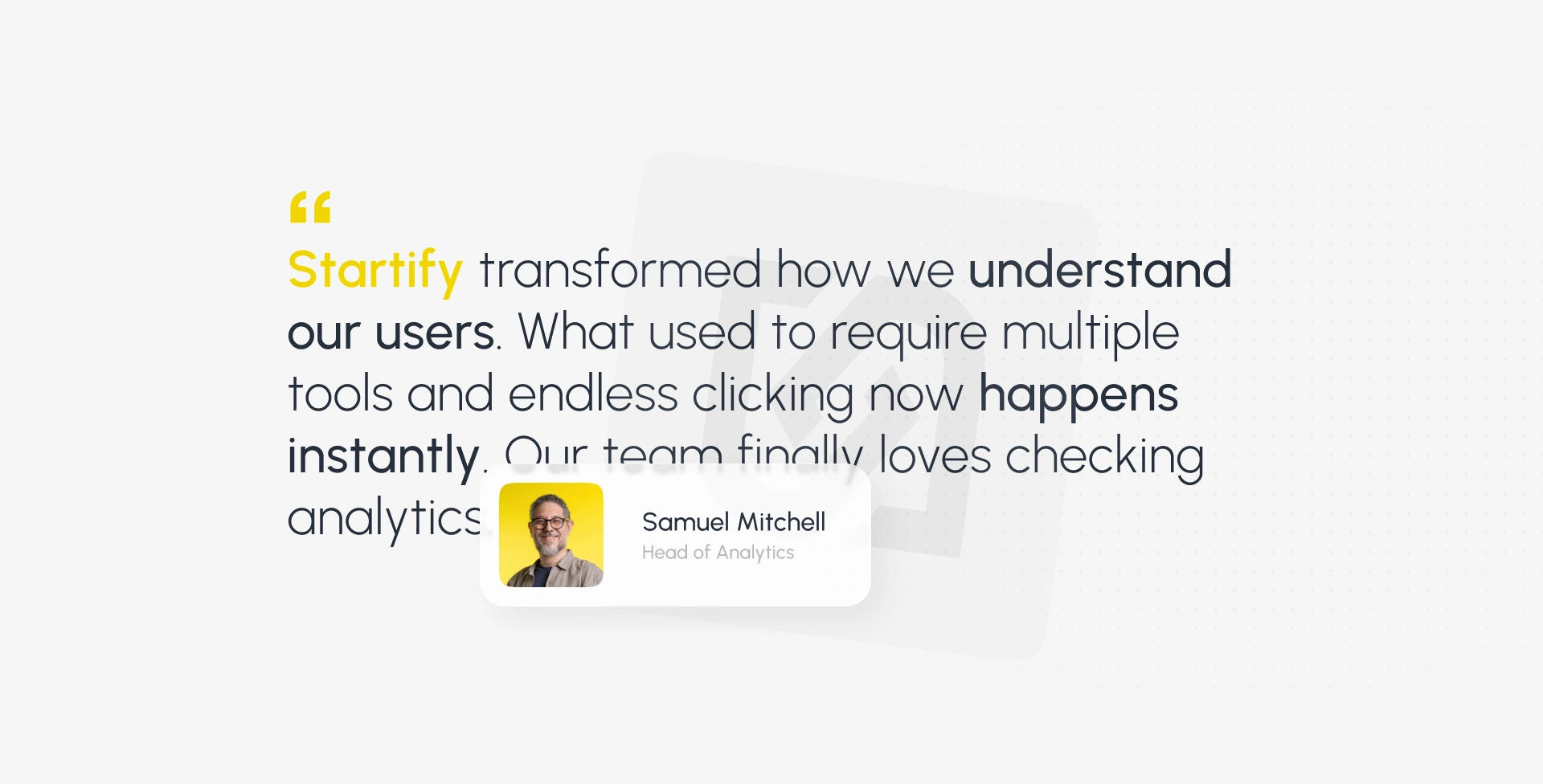 Startify transformed how we understand our users. What used to require multiple tools and endless clicking now happens instantly. Our team finally loves checking analytics.