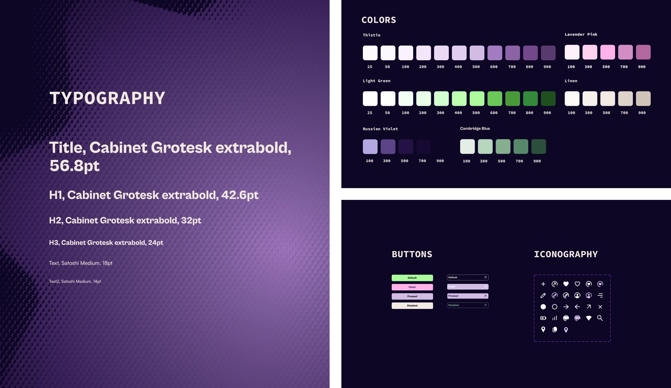 For the visual design choices, modern, refreshing, and bold colours were used, with a dark background contrasted by bright greens and purples as the main palette. The outlined buttons and use of simple geometric shapes create a sense of uniqueness and decisiveness. Overall, the visual language emphasises clarity and approachability through clean layouts, simple forms, and colourful interactive elements.