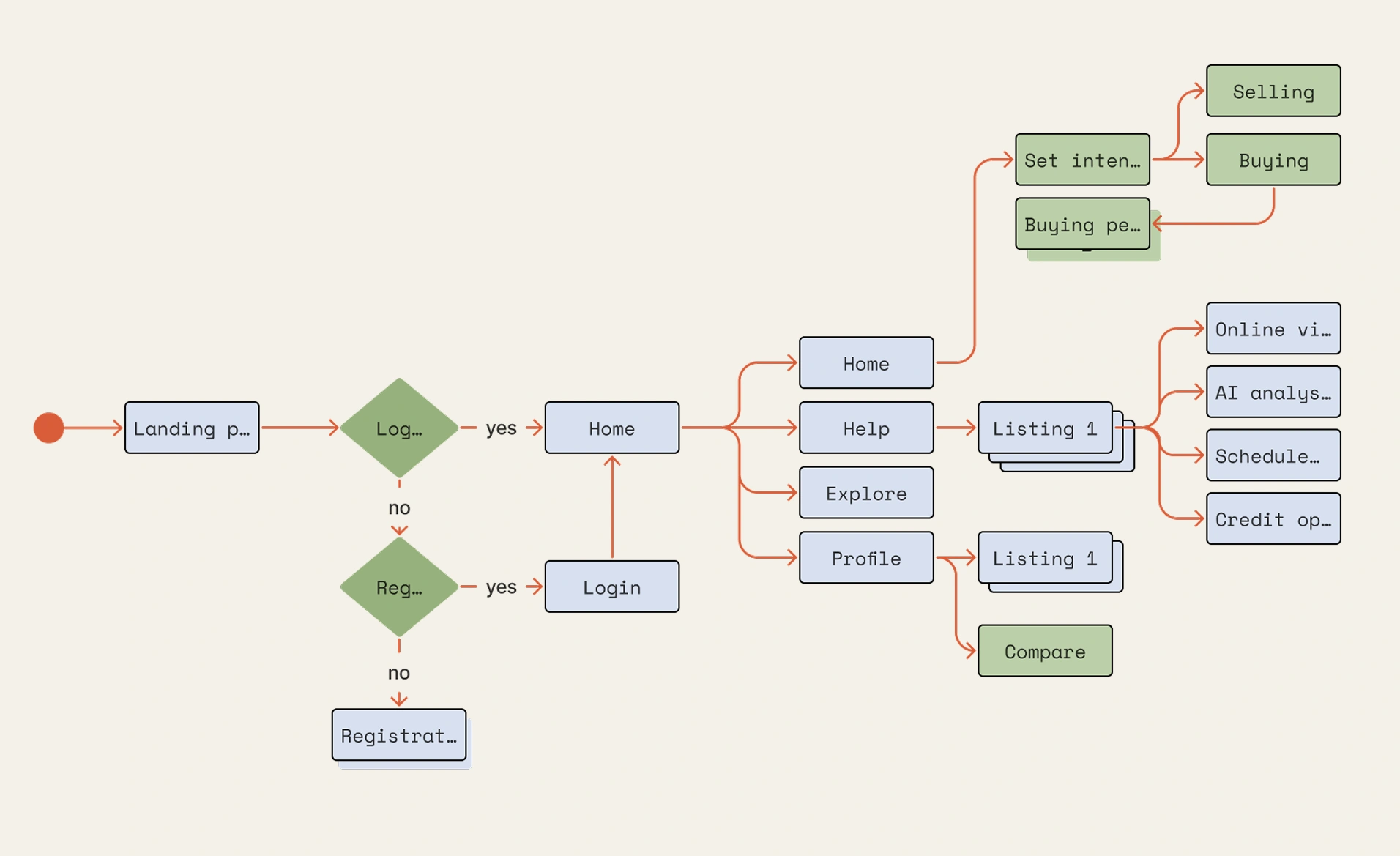 Following the user stories, I mapped out the key decisions and actions users make as they move through the app to complete their tasks. The user flow covers the full journey: from landing page through registration, property search, listing detail, AI analysis, favourites, and booking a viewing.