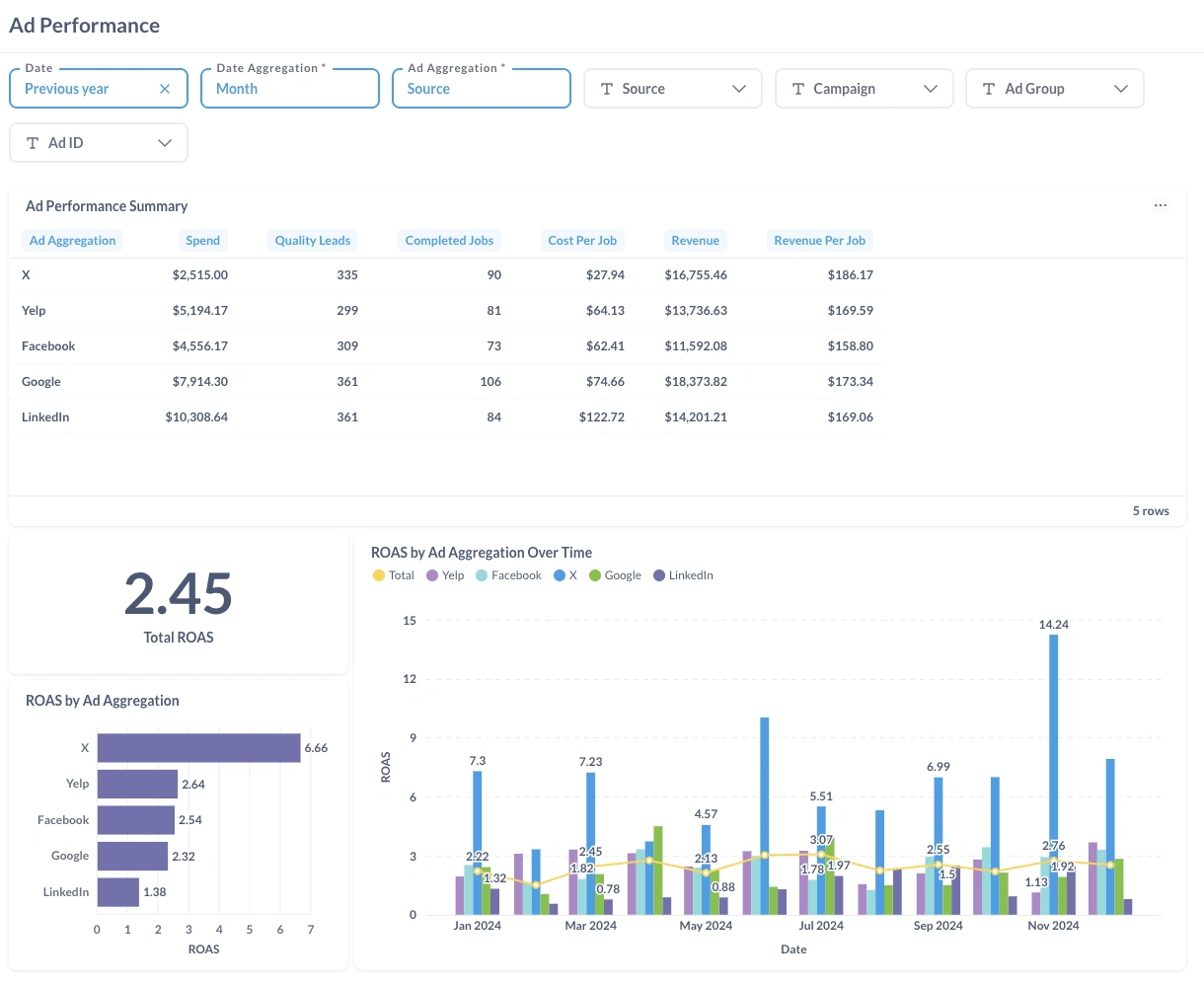 Centralized data from multiple ad sources to give an auto shop better visibility into marketing performance Note: sample dashboard uses dummy data