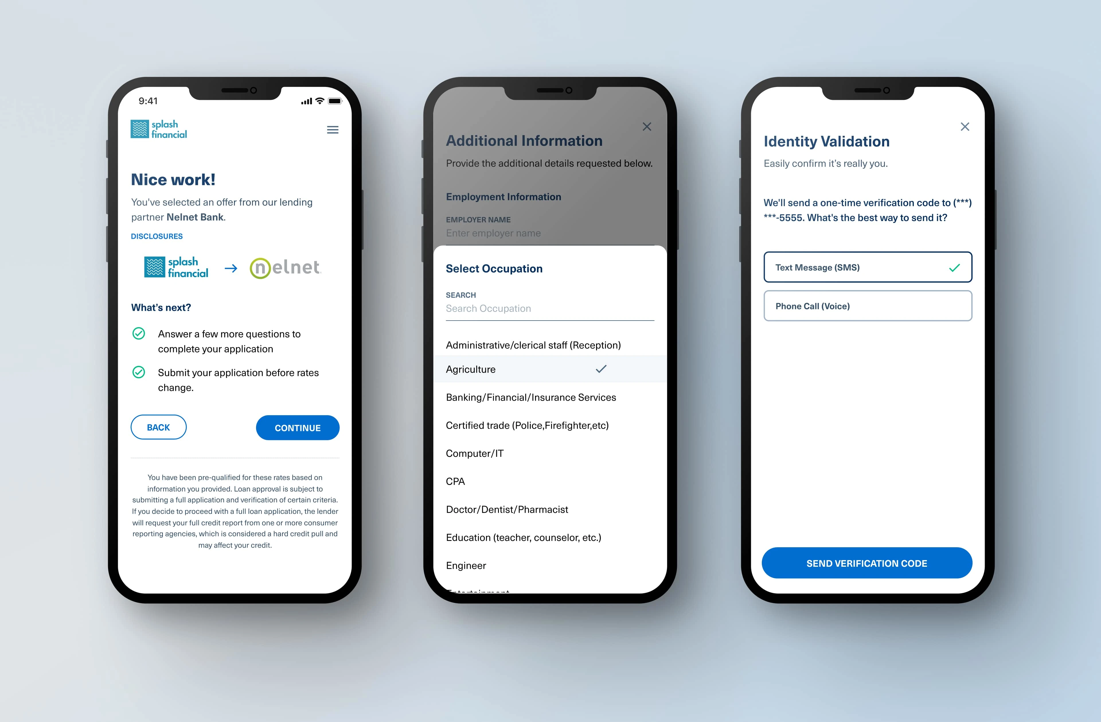 Prior to joining, the Splash financial pre and post qualification processes expanded beyond many screens, where users were encouraged to complete many steps of data entry without a clear line of sight of where they were during the overall navigation process and experience. In working with internal teams, we were able to reduce the amount of screens by providing a one page sequence for loan detail information such as loan use case, citizenship, as well as job information.