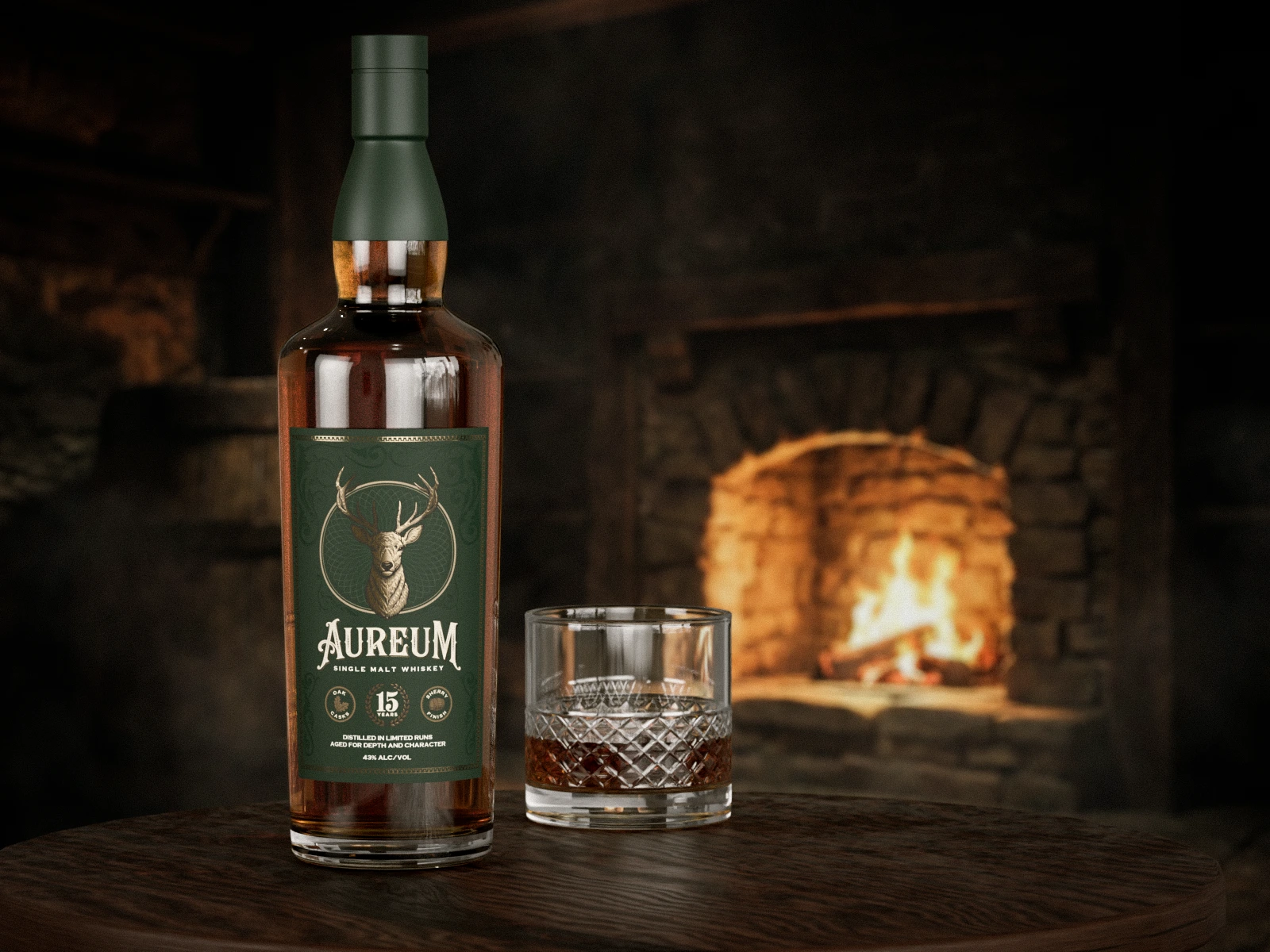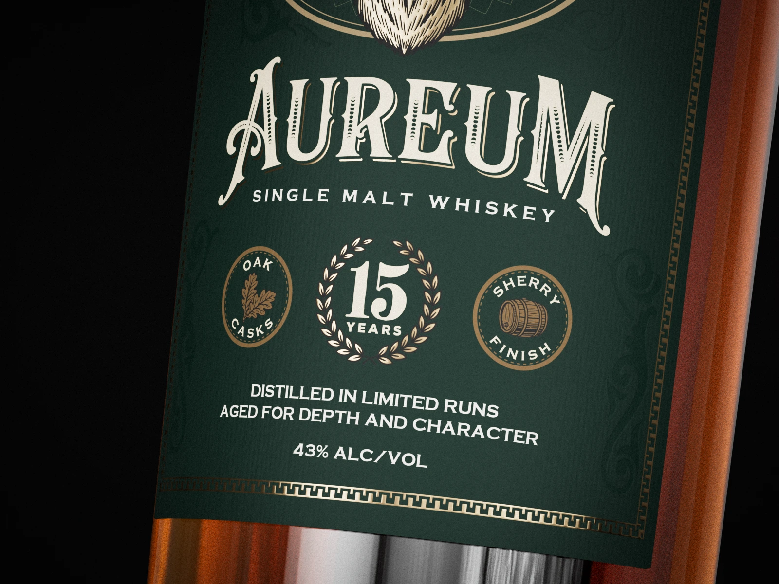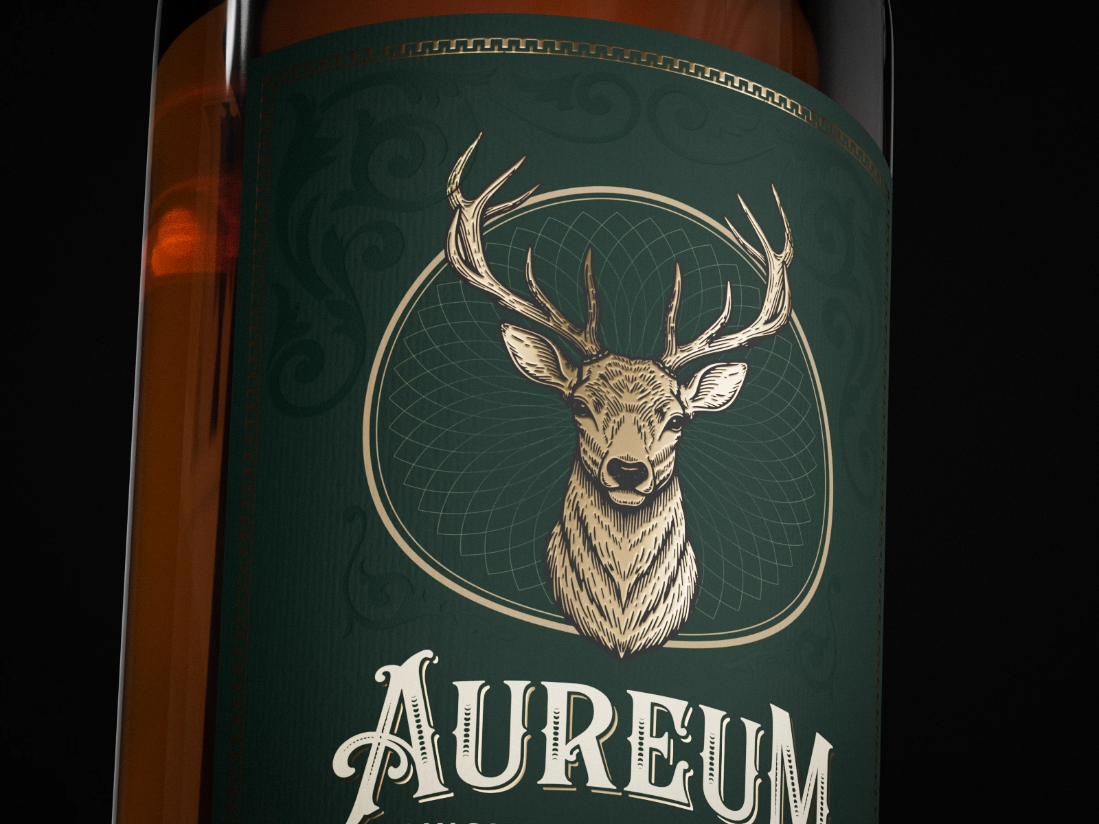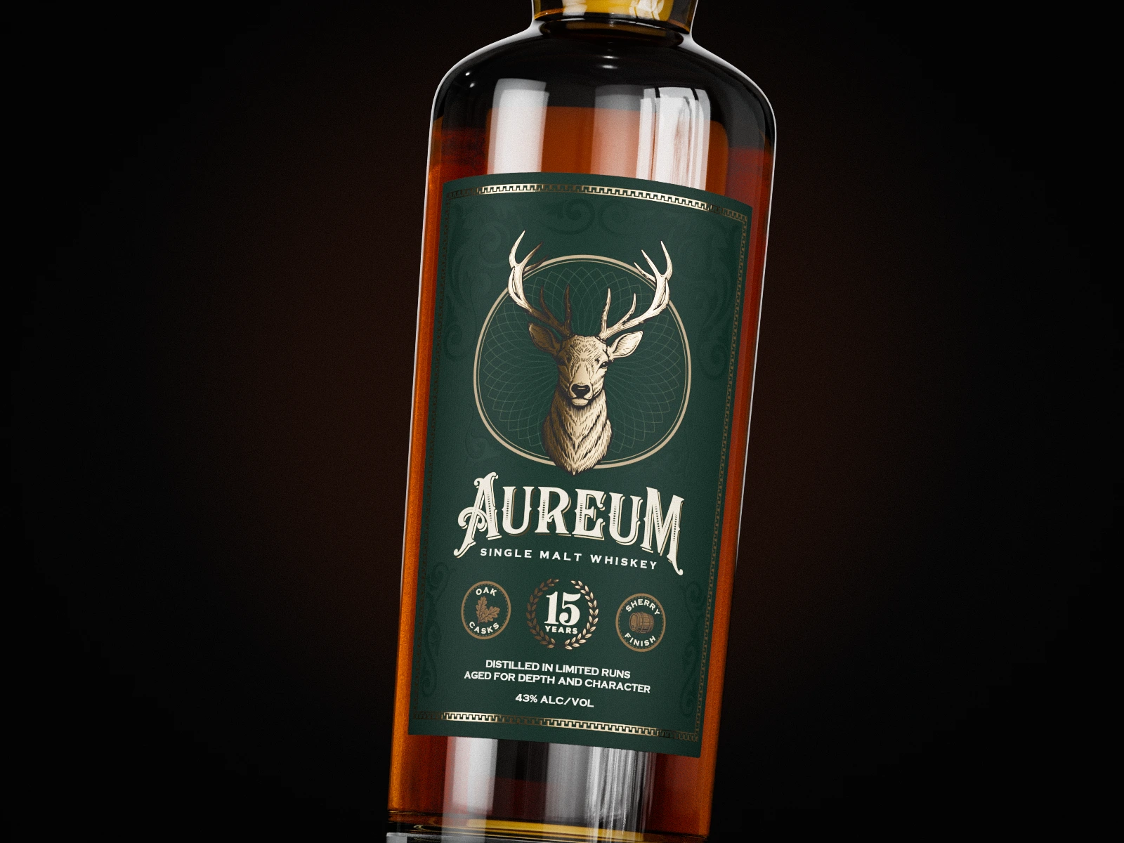 Concept label design for a premium single malt whisky brand with custom typography, a stag emblem, and a structured layout shown in high-end 3D renders.