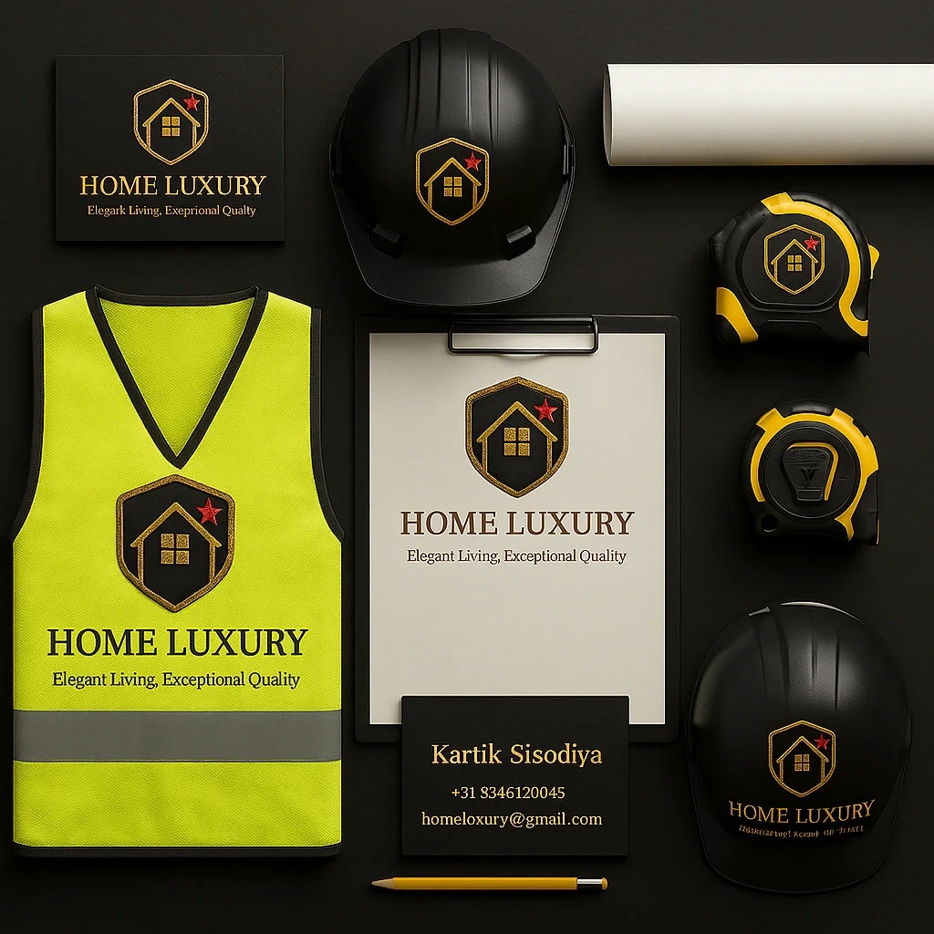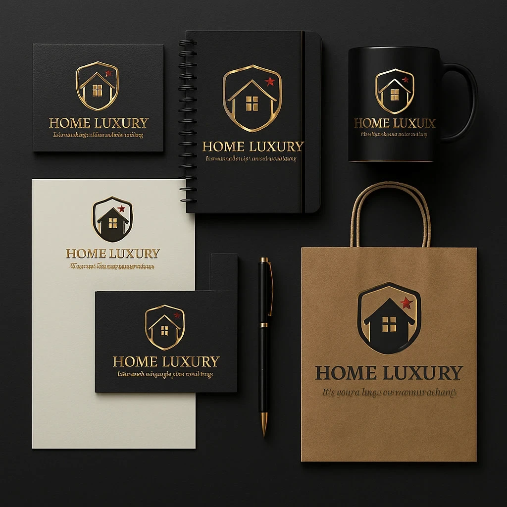 The brand name “HOME LUXURY” is rendered in a classic serif font, gold-toned to convey luxury and trust.