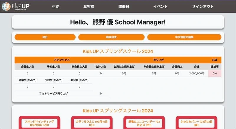 School manager profile, showing sales goals and per-activity attendance.