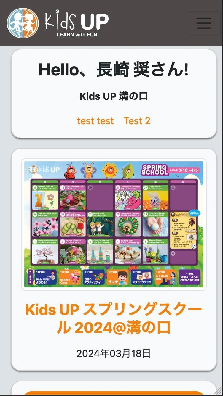 Parent landing page, showing the next event.