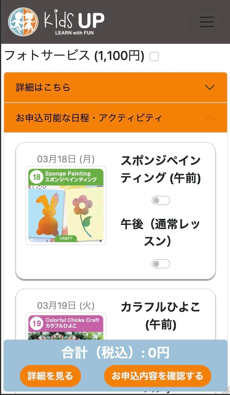 Event registration page, showing available activities and live-updated cost.